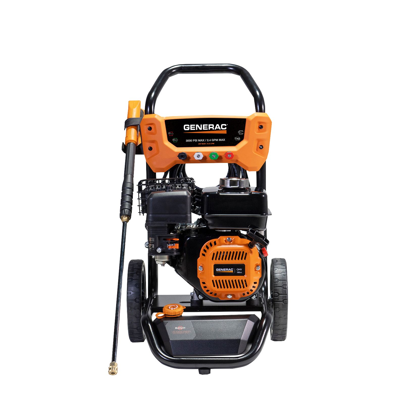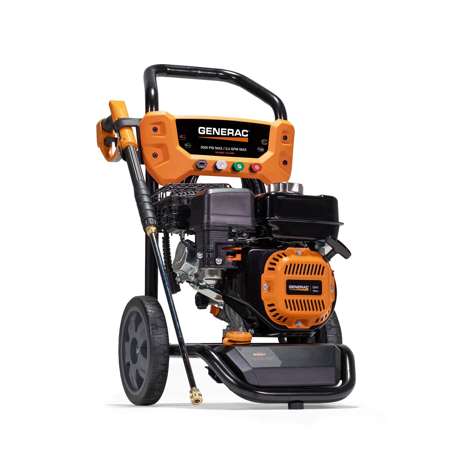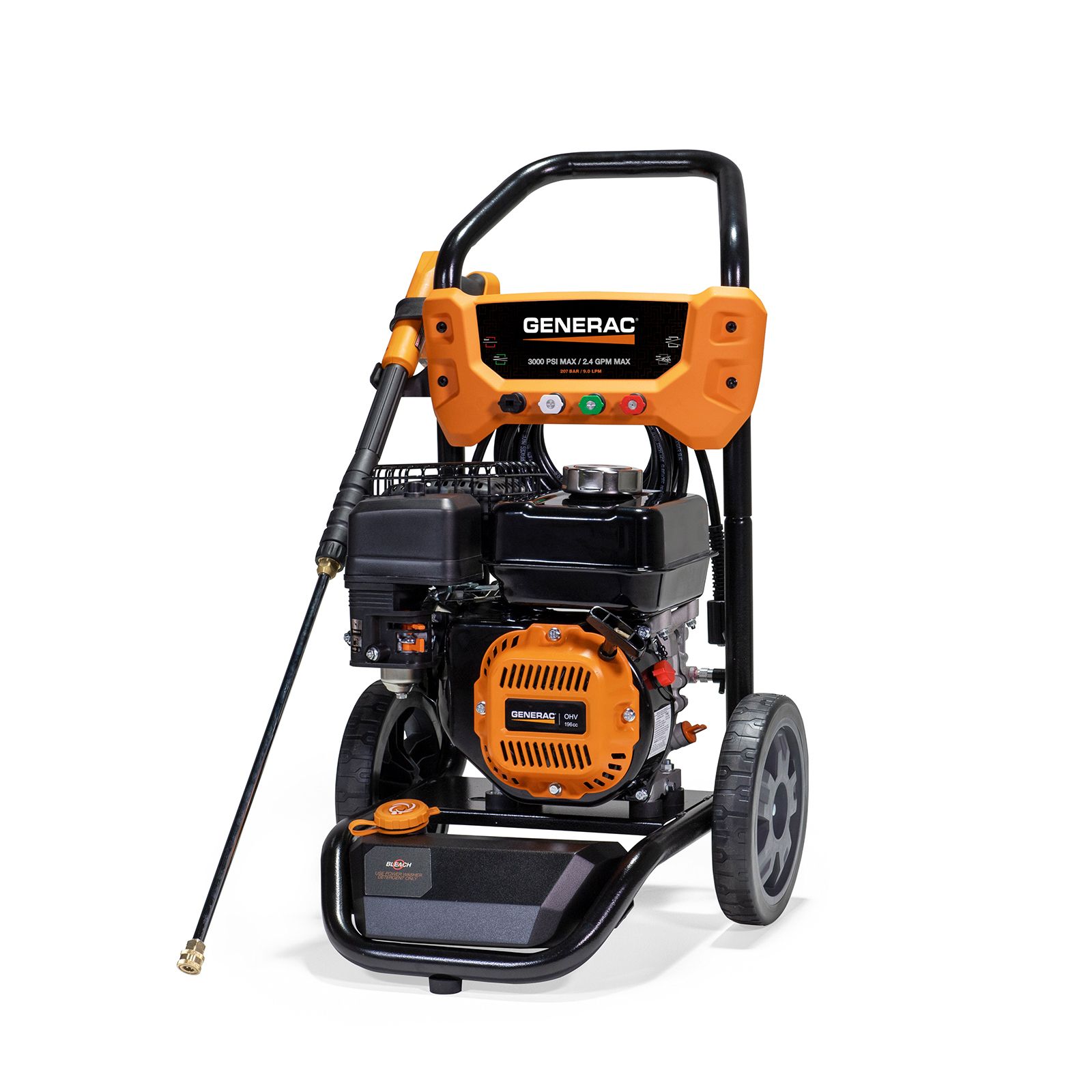 The Generac 8896 - 3000 PSI 2.4 GPM (gallons per minute) residential power washer gives you cleaning power, reliability and – above all – ease of use in an affordable, compact unit. You can use this pressure washer to clean everything from patio furniture to driveways and decks. The user-friendly design makes it easy to assemble, connect hoses, and clean longer and more comfortably. The 10 inch never flat wheels help move the pressure washer almost effortlessly regardless of terrain. The high-pressure hose connects to the rear of the spray gun for maximum convenience. With its large Generac® OHV (overhead valve) horizontal shaft engine and easy-access axial cam pump, the 3000 PSI power washer is ideal for any job around the home or jobsite. The ergonomic spray gun has a cushion grip and easy-to-pull trigger to reduce fatigue and improve comfort during use. The quick-change nozzle tips make it easy to swap between the four included nozzles (0, 25 and 40 degree, and soap) or other accessories. The user-friendly controls are all in a single location, including on/off, choke and fuel shutoff. This 3000 PSI washer includes an on-board, half gallon detergent tank. This Generac pressure washer is made in the USA and supported by a 24/7/365 USA based customer support team.