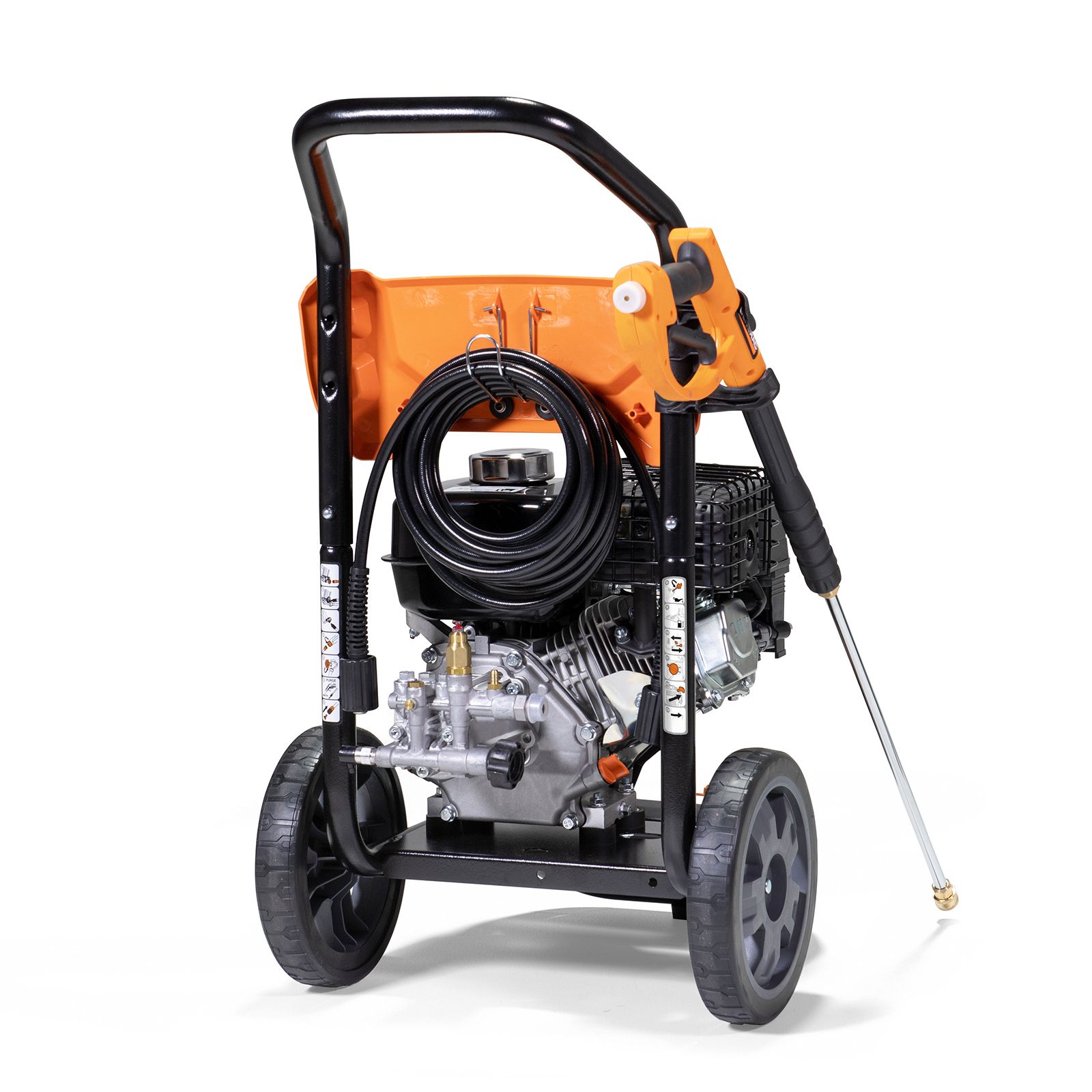Pressure washer, spray gun and holder, lance, hose, detergent tank, four nozzle tips, wheel kit, owner's manual Ergonomic spray gun - cushion grip and easy-to-pull trigger reduce fatigue and improve comfort Integrated spray gun holder - holds spray gun securely during transport and storage Quick-change nozzle tips - 0, 25 and 40 degree, soap and 1/2 gallon convenient on-board detergent tank High pressure hose - connects to the rear of the spray guy for maximum convenience High Performance Axial Cam Pump – With convenient, easy-to-reach pump connections Easy maneuverability - engine and pump are perfectly balanced over the axle for almost effortless maneuverability User-friendly controls - all in a single location, including on/off, choke and fuel shutoff Powerful Generac OHV engine - for maximum cleaning performance Never-flat wheels - easy transport on rugged terrain and up stairs