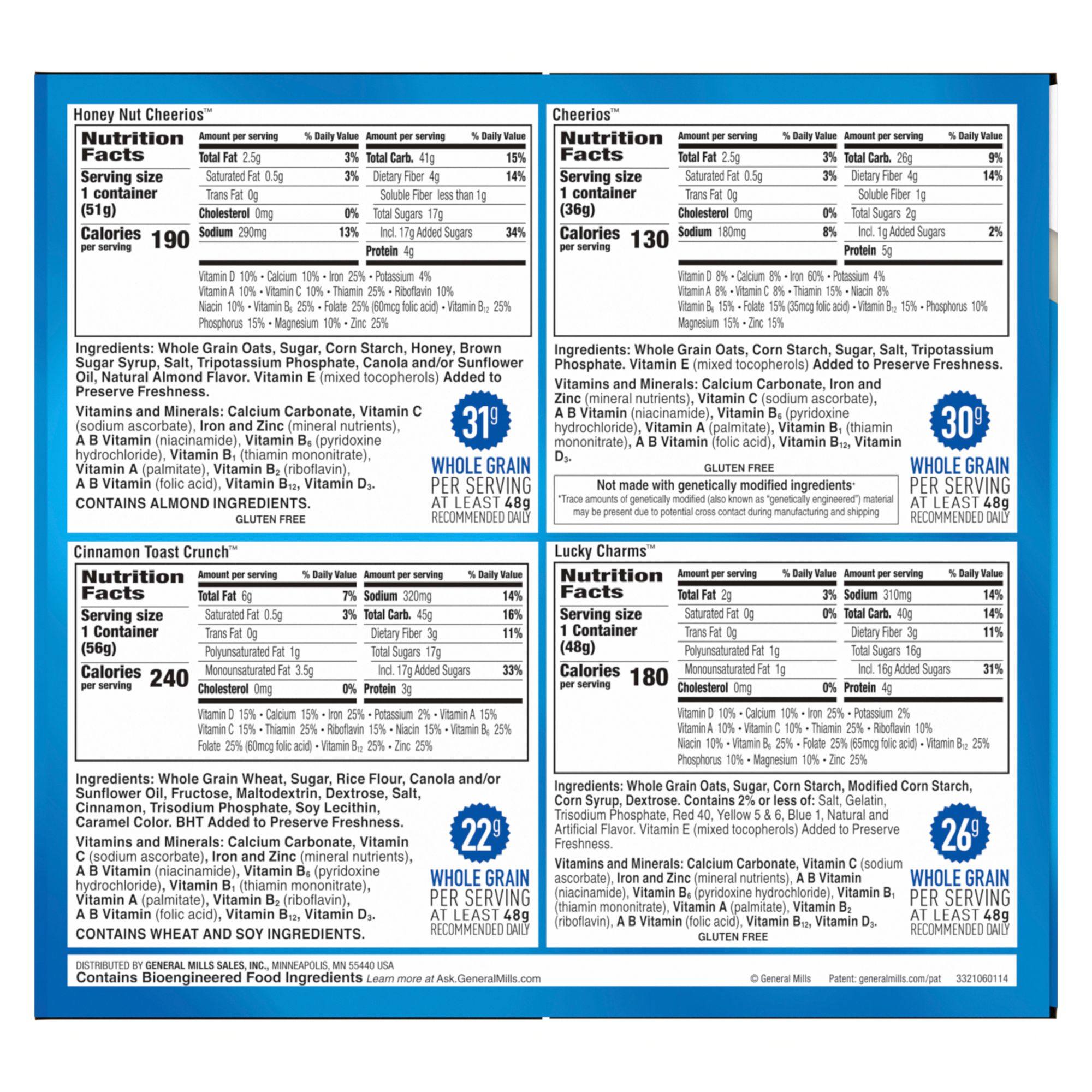 Contains: one 20.9 oz. General Mills Breakfast Pack with 12 cereal cups; 3 Lucky Charms, 3 Cinnamon Toast Crunch, 2 Cheerios, and 4 Honey Nut Cheerios