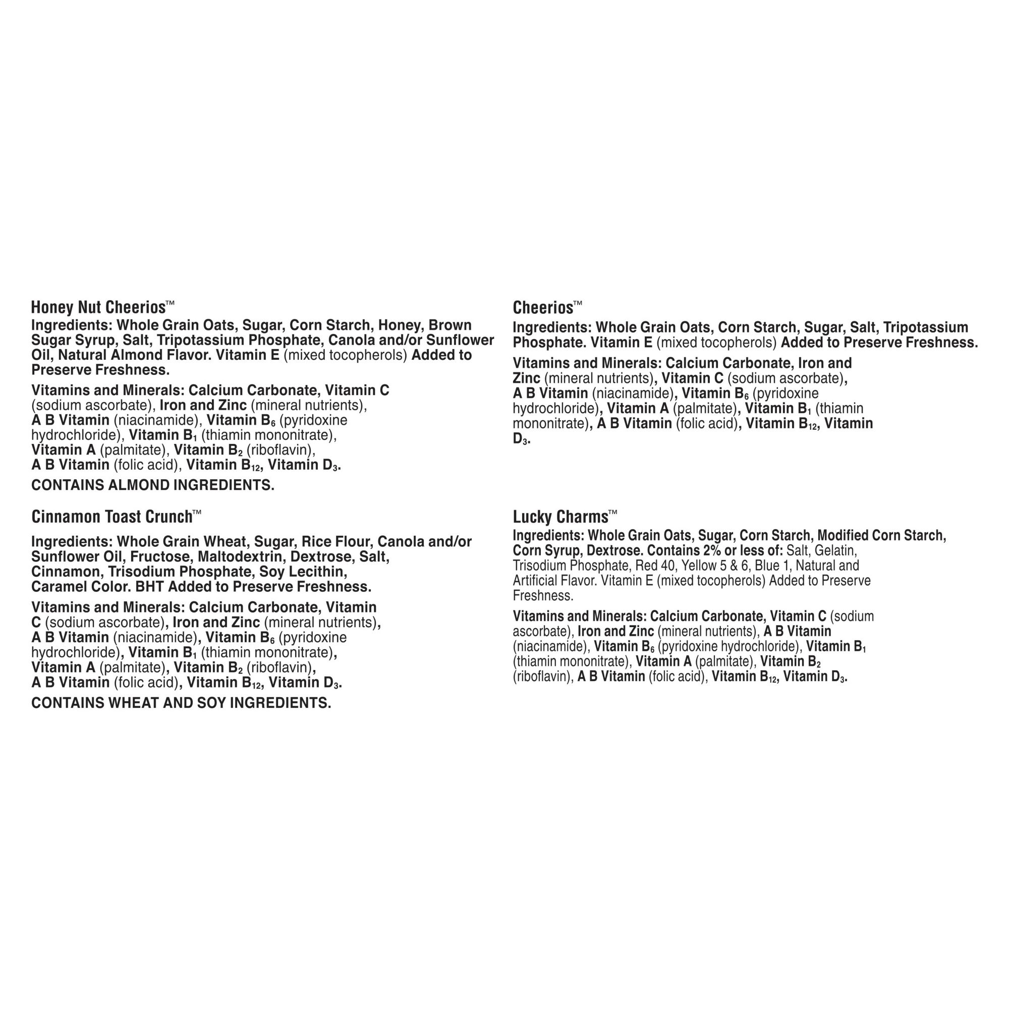 Ingredients Honey Nut Cheerios Ingredients: Whole Grain Oats, Sugar, Corn Starch, Honey, Brown Sugar Syrup, Salt, Tripotassium Phosphate, Canola And/or Sunflower Oil, Natural Almond Flavor. Vitamin E (Mixed Tocopherols} Added To Preserve Freshness. Vitamins And Minerals: Calcium Carbonate, Vitamin C (Sodium Ascorbate), Iron And Zinc (Mineral M.itrients), A B Vitamin (Niacinamide), Vitamin B6 (Pyridoxine Hydrochloride), Vitamin B1 (Thiamin mononitrate), Vitamin A (Palmitate), Vitamin B2 (Riboflavin), A B Vitamin (Folic Acid), Vitamin B12, Vitamin D3. Contains Almond Ingredients. Cinnamon Toast Crunch Ingredients: Whole Grain Wheat, Sugar, Rice Flour, Canola And/or Sunflower Oil, Fructose, Maltodextrin, Dextrose, Salt, Cinnamon, Trisodium Phosphate, Soy Lecithin, Caramel Color. Bht Added To Preserve Freshness. Vitamins And Minerals: Calcium Carbonate, Vitamin C (Sodium Ascorbate), Iron And Zinc (Mineral Nutrients), A B Vitamin (Niacinamide), Vitamin B6 (Pyridoxine Hydrochloride)1 Vitamin B1 (Thiamin Mononitrate), Vitamin A (Palmitate), Vitamin B2 (Riboflavin), A B Vitamin (Folic Acid), Vitamin B12, Vitamin D1. Contains Wheat and Soy Ingredients. Cheerios Ingredients: Whole Grain Oats, Corn Starch, Sugar, Salt, Tripotassium Phosphate. Vitamin E (Mixed Tocopherols) Added To Preserve Freshness. Vitamins And Minerals: Calcium Carbonate, Iron And Zinc (Mineral Nutrients), Vitamin C (Sodium Ascorbate), A B Vitamin (Niacinamide). Vitamin B6 (Pyridoxine Hydrochloride), Vitamin A (Palmitate), Vitamin B1 (Thiamin Mononitrate), A B Vitamin (Folic Acid), Vitamin B12, Vitamin D3. Lucky Charms Ingredients: Whole Grain Oats, Sugar, Corn Starch, Modified Corn Starch, Corn Syrup, Dextrose. Contains 2% Or Less Of: Sall, Gelatin, Trisodium Phosphale, Red40, Yellow 5 & 6, Blue 1,natural And Artificial Flavor. Vitamin E (Mixed Tocopherols) Added To Preserve Freshness. Vitamins And Minerals: Calcium Carbonate, Vitamin C (Sodium Ascorbate), Iron And Zinc (Mineral Nutrients), Ab Vitamin (Niacinamide), Vitamin B6 (Pyridoxine Hydrochlolide), Vitamin B1 (Thiamin Mononilrate), Vitamm A (Palmitale), Vitamin B2 (Riboflavin), A B Vitamin (Folic Acid), Vitamin B12, Vitamin D3.