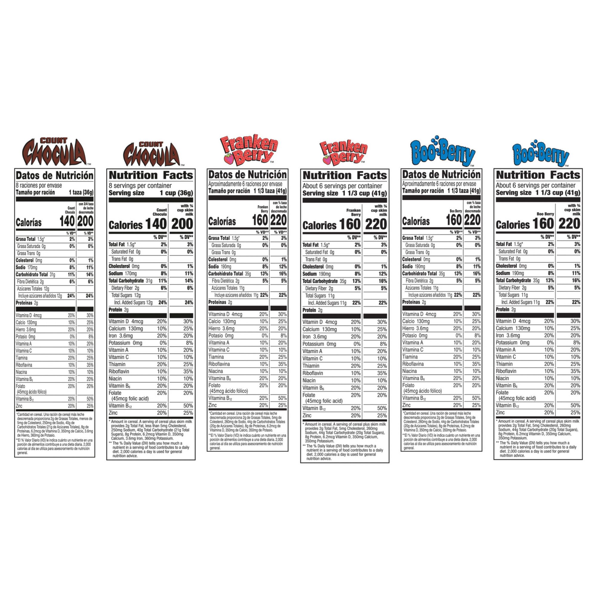 Ingredients Franken Berry Cereal Ingredients: Whole Grain Corn, Corn Meal, Sugar, Corn Syrup, Dextrose, Canola and/or Sunflower Oil, Modified Corn Starch, Salt, Gelatin, Trisodium Phosphate, Natural and Artificial Flavor, Red 40, Blue 1 & 2, Malic Acid, Citric Acid, Rosemary Extract. Vitamins and Minerals: Tricalcium Phosphate, Calcium Carbonate, Vitamin C (sodium ascorbate), Iron and Zinc (mineral nutrients), A B Vitamin (niacinamide), Vitamin B6 (pyridoxine hydrochloride), Vitamin B1 (thiamin mononitrate), Vitamin A (palmitate), Vitamin B2 (riboflavin), A B Vitamin (folic acid), Vitamin B12, Vitamin D3. Boo Berry Cereal Ingredients: Whole Grain Corn, Corn Meal, Sugar, Corn Syrup, Dextrose, Canola and/or Sunflower Oil, Modified Corn Starch, Salt, Gelatin, Trisodium Phosphate, Red 40, Blue 1 & 2, Natural and Artificial Flavor, Malic Acid, Citric Acid, Rosemary Extract. Vitamins and Minerals: Tricalcium Phosphate, Calcium Carbonate, Vitamin C (sodium ascorbate), Iron and Zinc (mineral nutrients), A B Vitamin (niacinamide), Vitamin B6 (pyridoxine hydrochloride), Vitamin B1 (thiamin mononitrate), Vitamin A (palmitate), Vitamin B2 (riboflavin), A B Vitamin (folic acid), Vitamin B12, Vitamin D3. Count Chocula Cereal Ingredients: Whole Grain Corn, Sugar, Corn Meal, Corn Syrup, Canola and/or Sunflower Oil, Modified Corn Starch, Cocoa Processed with Alkali, Red 40, Yellow 5 & 6, Blue 1 and Other Color Added, Dextrose, Salt, Natural and Artificial Flavor, Gelatin, Trisodium Phosphate, Rosemary Extract. Vitamins and Minerals: Tricalcium Phosphate, Calcium Carbonate, Vitamin C (sodium ascorbate), Iron and Zinc (mineral nutrients), A B Vitamin (niacinamide), Vitamin B6 (pyridoxine hydrochloride), Vitamin B1 (thiamin mononitrate), Vitamin A (palmitate), Vitamin B2 (riboflavin), A B Vitamin (folic acid), Vitamin B12, Vitamin D3.
