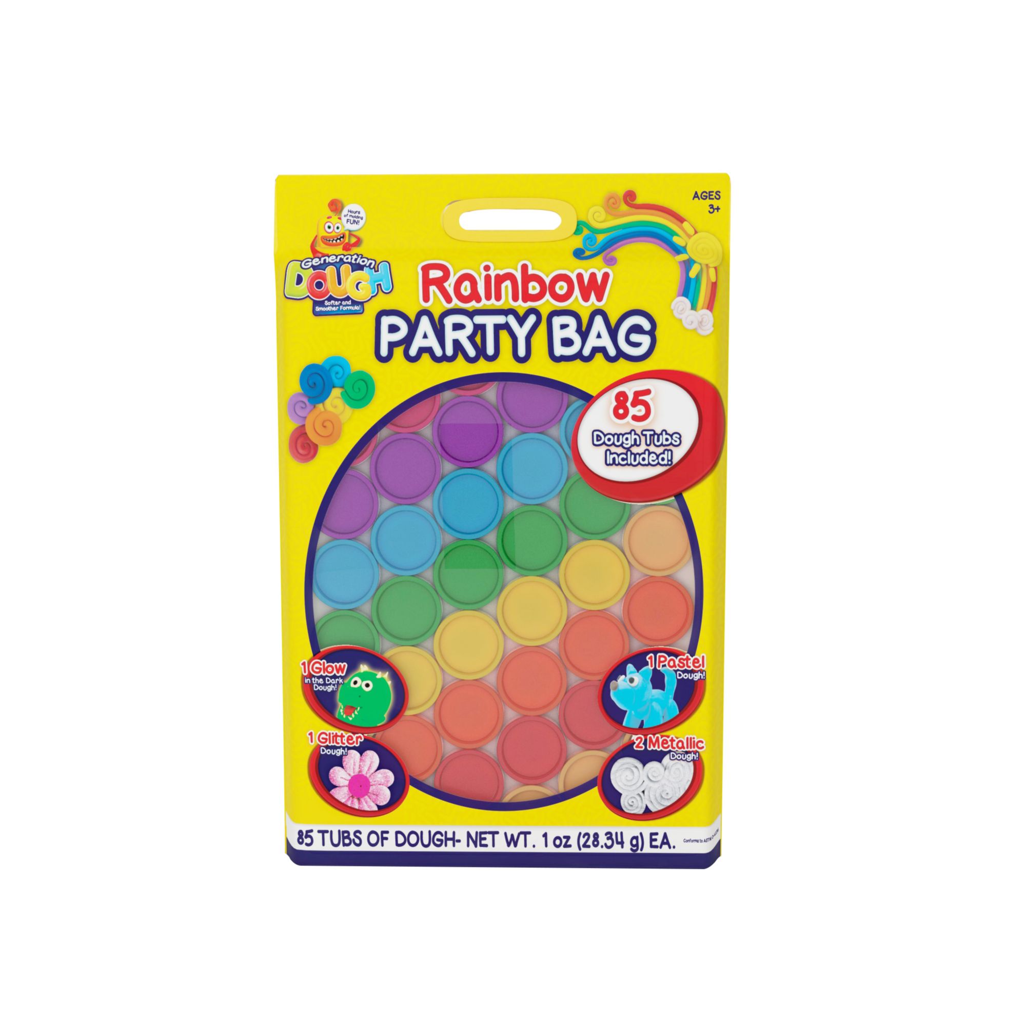 Bring creative fun and excitement to your child's party with the Generation Dough Rainbow Party Bag. Each bag contains 85 packs of 1-oz. dough. From glow in the dark, glitter, metallic, pastel, and regular colors, these small, colorful dough packs will add some sensory fun to any party you are throwing. They also make for a great trick-or-treat alternative to candy for Halloween! Share the creativity for any occasion! Perfect for use in classrooms, at birthday parties, as goodie bag fillers, for Valentine’s Day, and even wedding kids table activities. With multiples of every color including teal, pink, purple, bright red, neon orange, yellow, neon green, bright blue, there are lots of colors to go around in this Generation Dough Rainbow Party Bag. Let your creativity flow as you make and mold fun shapes, animals, or other creations of your design. A dinosaur, a unicorn, a plane, or a flower the options are limitless.