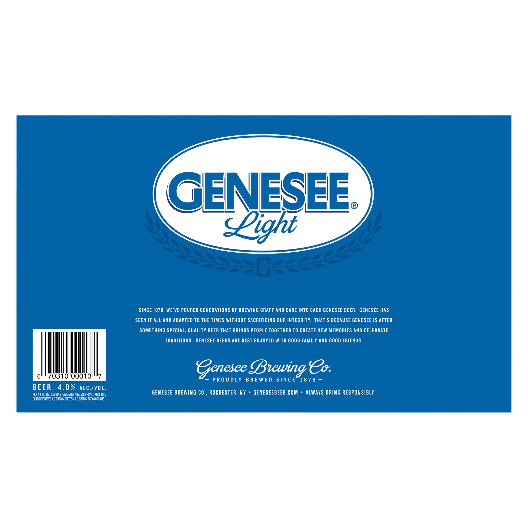 Introduced in 1978, Genesee Light Lager Beer is a refreshing light beer that is brewed with both two-row and six-row barley malts. Genesee Light Lager Beer is a smooth-drinking, refreshing, light-bodied beer that goes down easy for any occasion. Genesee Light is a true light beer, and doesn't sacrifice flavor for it's light body. Proudly brewed in Rochester, NY and a long time local favorite, lovingly nicknamed "Genny Light." Genesee Light can be enjoyed at any social occasion with friends and family, or your favorite tailgate event. Always enjoy responsibly.