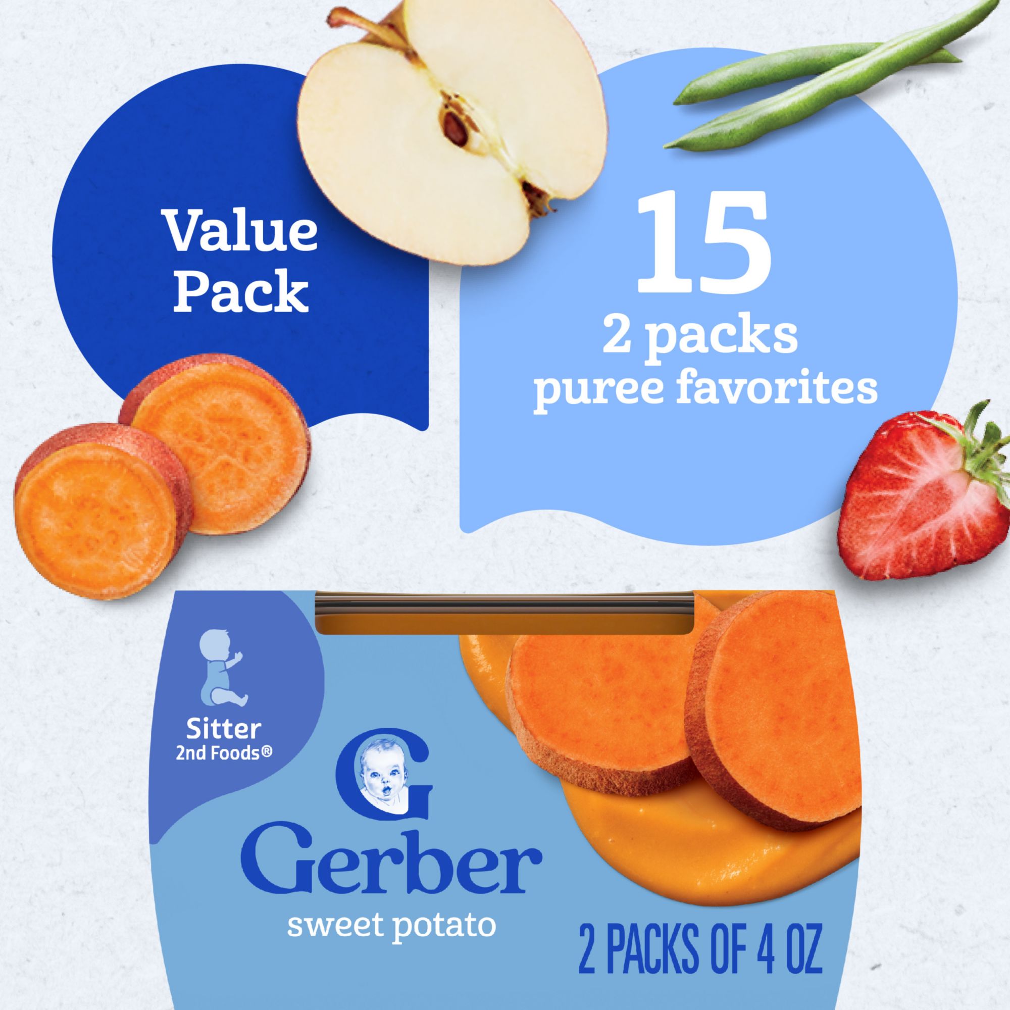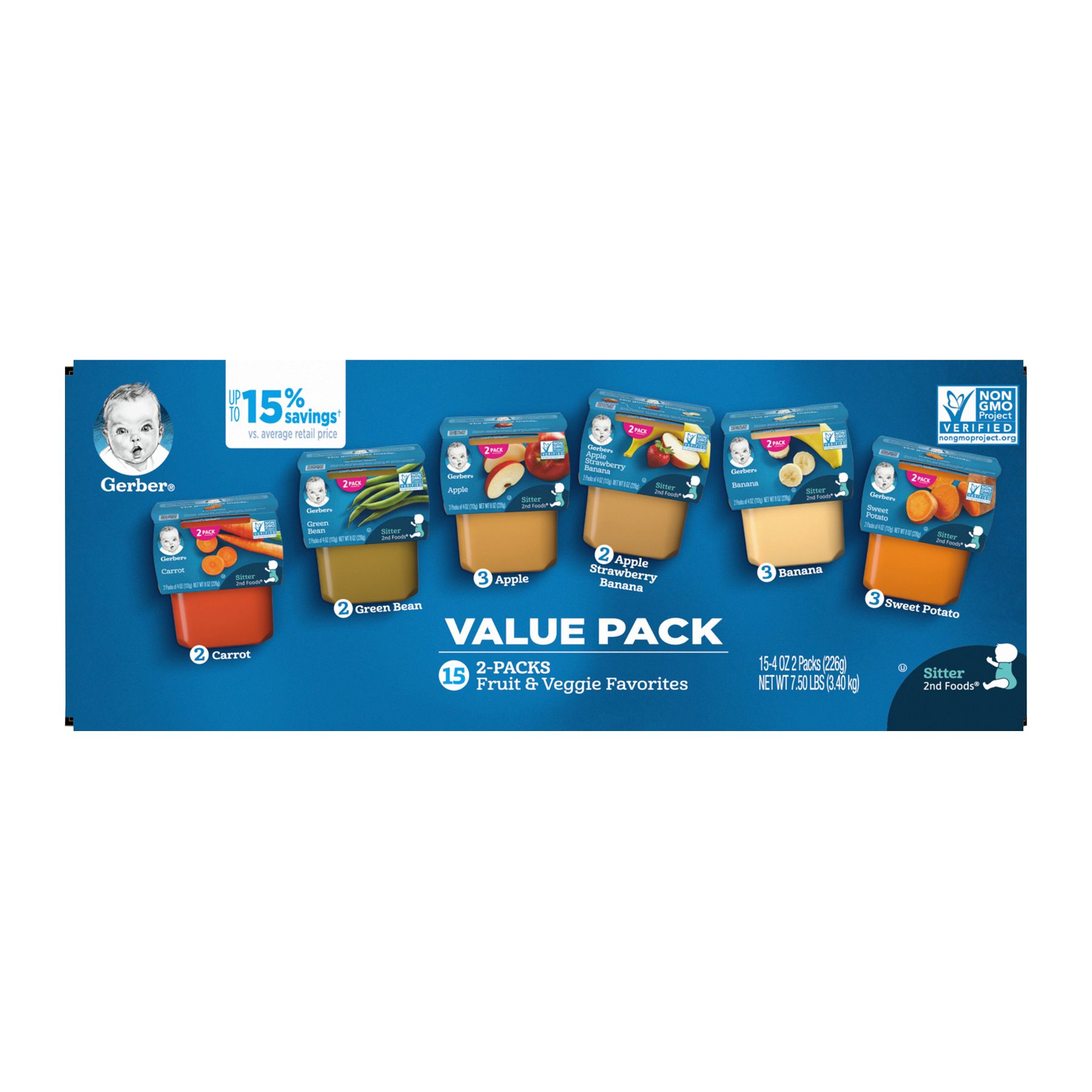 Gerber Stage 2 Baby Food Variety Pack Tubs are a premium choice for your child’s early stages. Crafted to help support their nutritional needs, along with meeting the busy lifestyle needs of caretakers and parents. Each baby puree tub comes in a portable, easy-to-store format – making it perfect for life’s busy moments. This stage 2 baby food puree is designed for babies who are 6 months + and are ready to explore new textures and flavors. The fruits and veggies are finely pureed to ensure a smooth and enjoyable eating experience for your little one. Gerber understands the importance of providing wholesome ingredients during the crucial developmental stages of your child's life -- that’s why this Gerber variety pack is Non-GMO Project Verified. These baby purees have no added salt or sweeteners, and have no added colors or flavors. They need to be refrigerated after opening and must be used after 1 day. Gerber baby puree is ideal for parents who seek a convenient and high-quality option in their baby's diet. This baby food variety pack comes with 15 two packs.