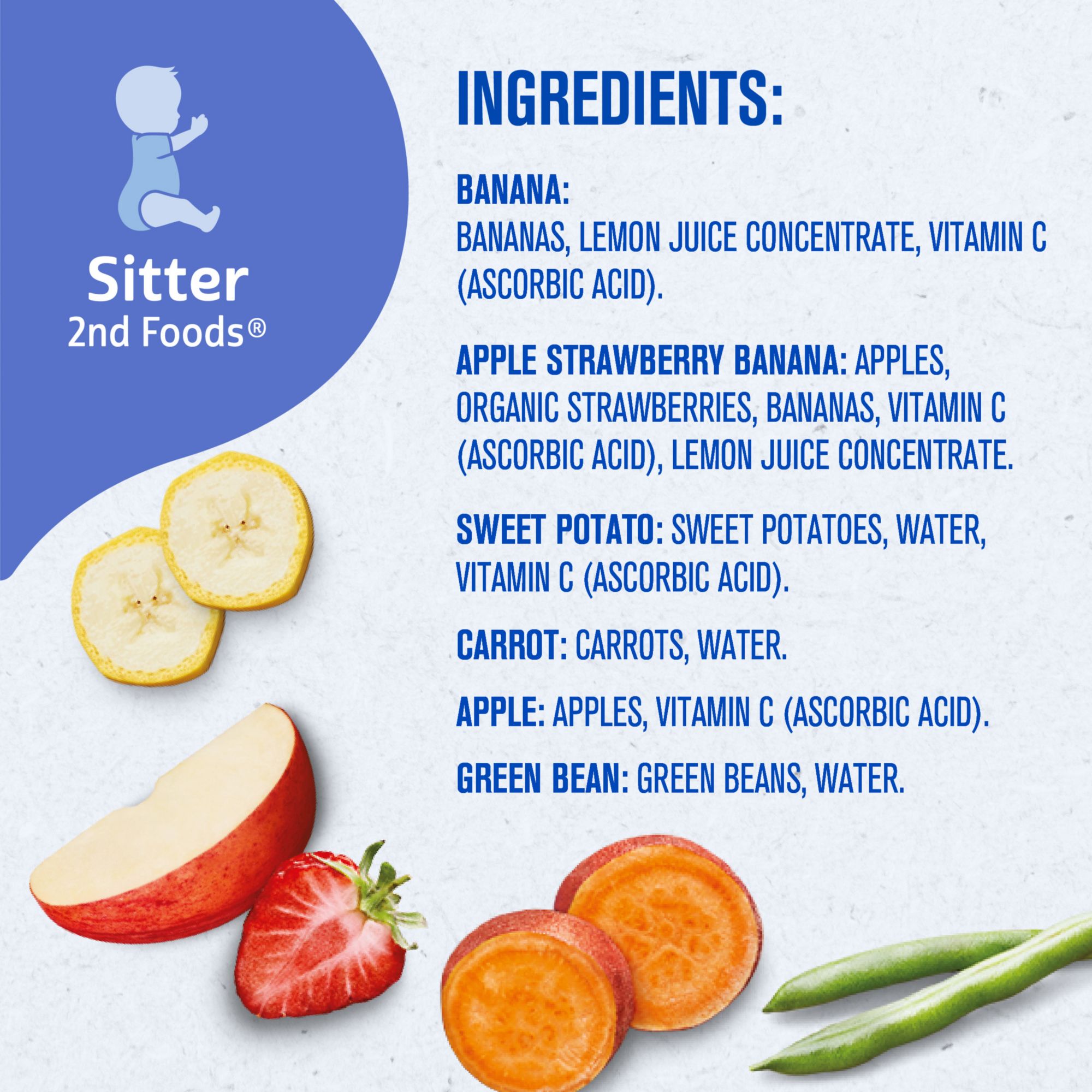 Ingredients: APPLE INGREDIENTS: APPLES, VITAMIN C (ASCORBIC ACID). APPLE STRAWBERRY BANANA INGREDIENTS: APPLES, ORGANIC STRAWBERRIES, BANANAS, VITAMIN C (ASCORBIC ACID), LEMON JUICE CONCENTRATE. BANANA INGREDIENTS: BANANAS, LEMON JUICE CONCENTRATE, VITAMIN C (ASCORBIC ACID). CARROT INGREDIENTS: CARROTS, WATER. GREEN BEAN INGREDIENTS: GREEN BEANS, WATER. SWEET POTATO INGREDIENTS: SWEET POTATO, WATER, VITAMIN C (ASCORBIC ACID).