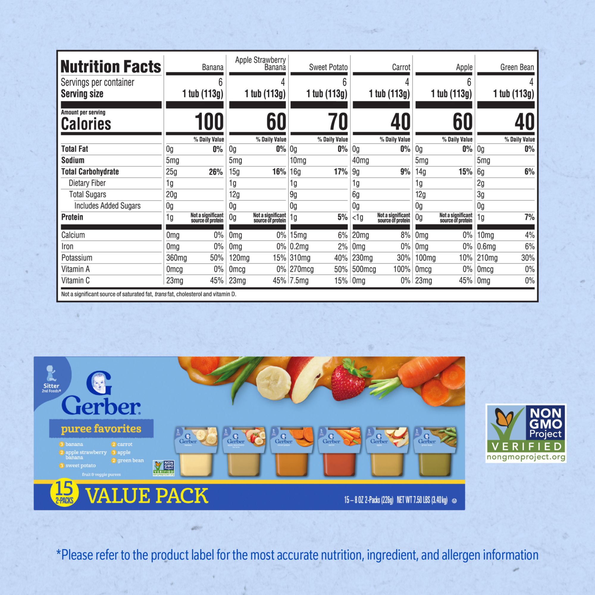 VARIETY PACK: This nutritious baby food variety pack comes with 6 puree favorites: banana, apple strawberry banana, sweet potato, carrot, apple & green bean STAGE 2 BABY FOOD: These stage two baby purees are made for babies who are ready to explore new textures and flavors, making them a great addition to your baby's diet BABY FOOD PUREE: The fruits and veggies in this baby food variety pack have been pureed to ensure a smooth and enjoyable eating experience for your little one. With a convenient on-the-go packaging, our baby puree is something you and your little one will love NO ADDED COLORS OR FLAVORS: These fruit and vegetable baby food purees have no added colors or flavors, and no added sweeteners or salt TRUSTED FAMILY FAVORITE: We are leading the way in quality and testing standards for babies. Our dedication to quality ensures that your baby receives the finest food available. Gerber baby food puree is a trusted choice for countless families Includes Infant Puree