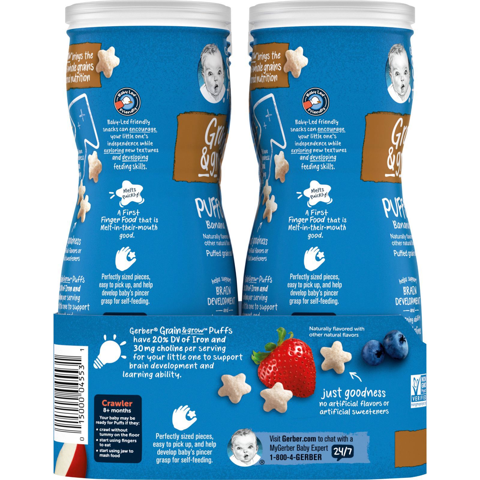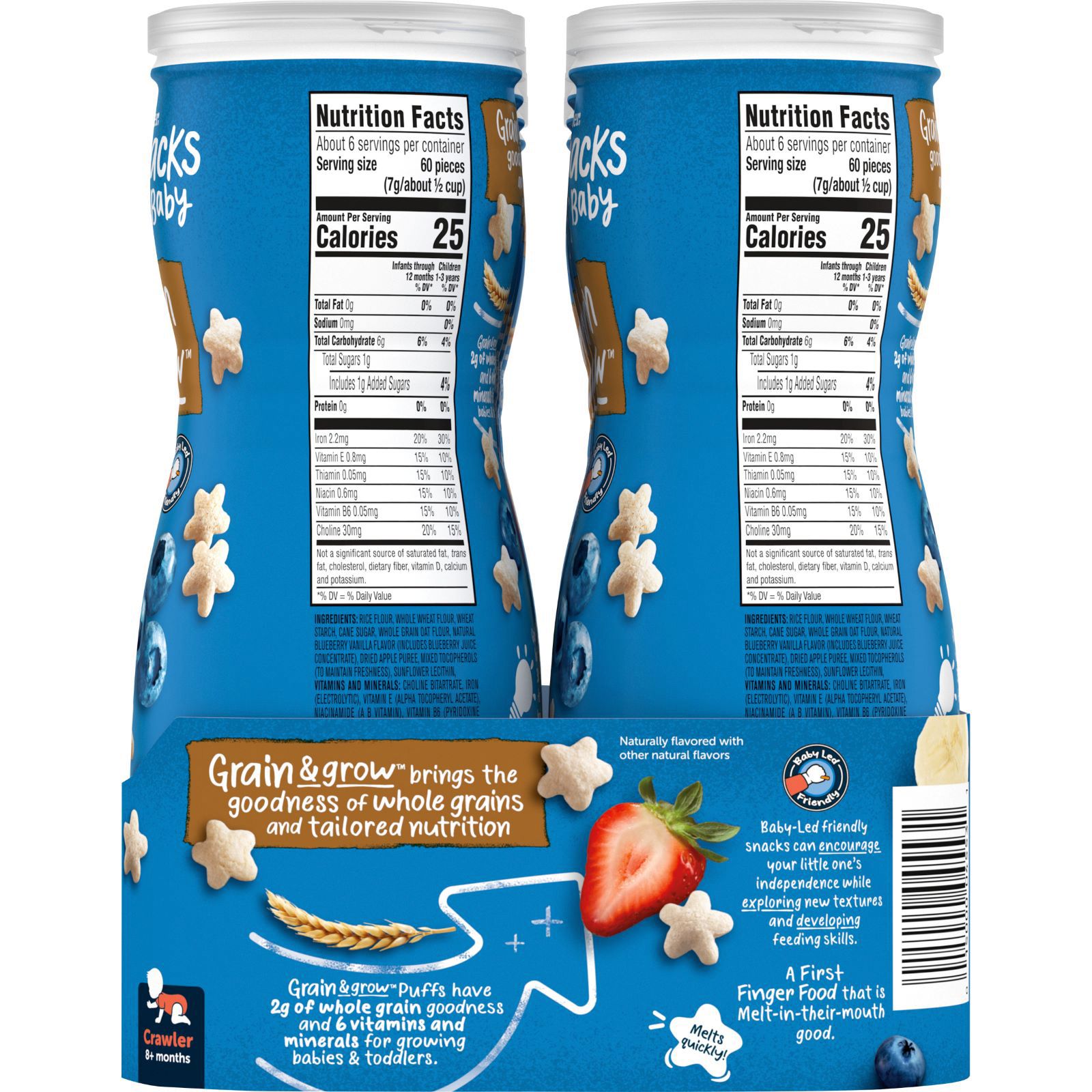 Satisfy your baby’s taste buds with the oh-so-delicious and exciting variety of naturally flavored Gerber Baby Snacks Puffs, crafted with fruit and wholesome goodness. These snacks are non-GMO, and made without any artificial flavors or artificial sweeteners for your baby. Your little one is learning to mash and chew and is even beginning to self-feed with their fingers, and these puffs are perfectly sized for tiny hands. These snacks allow them to practice picking up food, and to be more independent. Gerber Baby Snacks Puffs are perfect for your little one to munch on. These snacks are crafted with 2 grams of whole grains per serving and six vitamins and minerals to make every bite count at snack time.