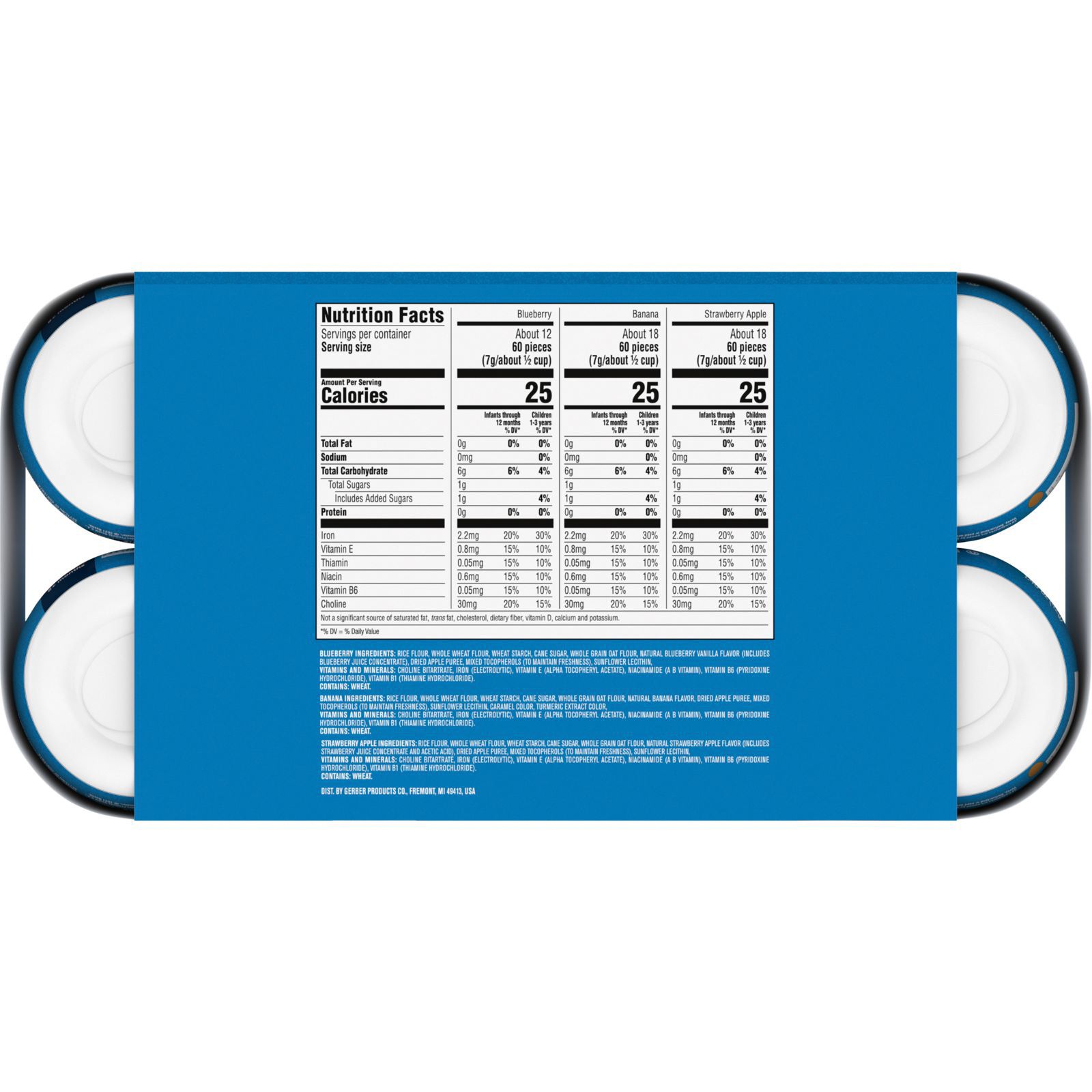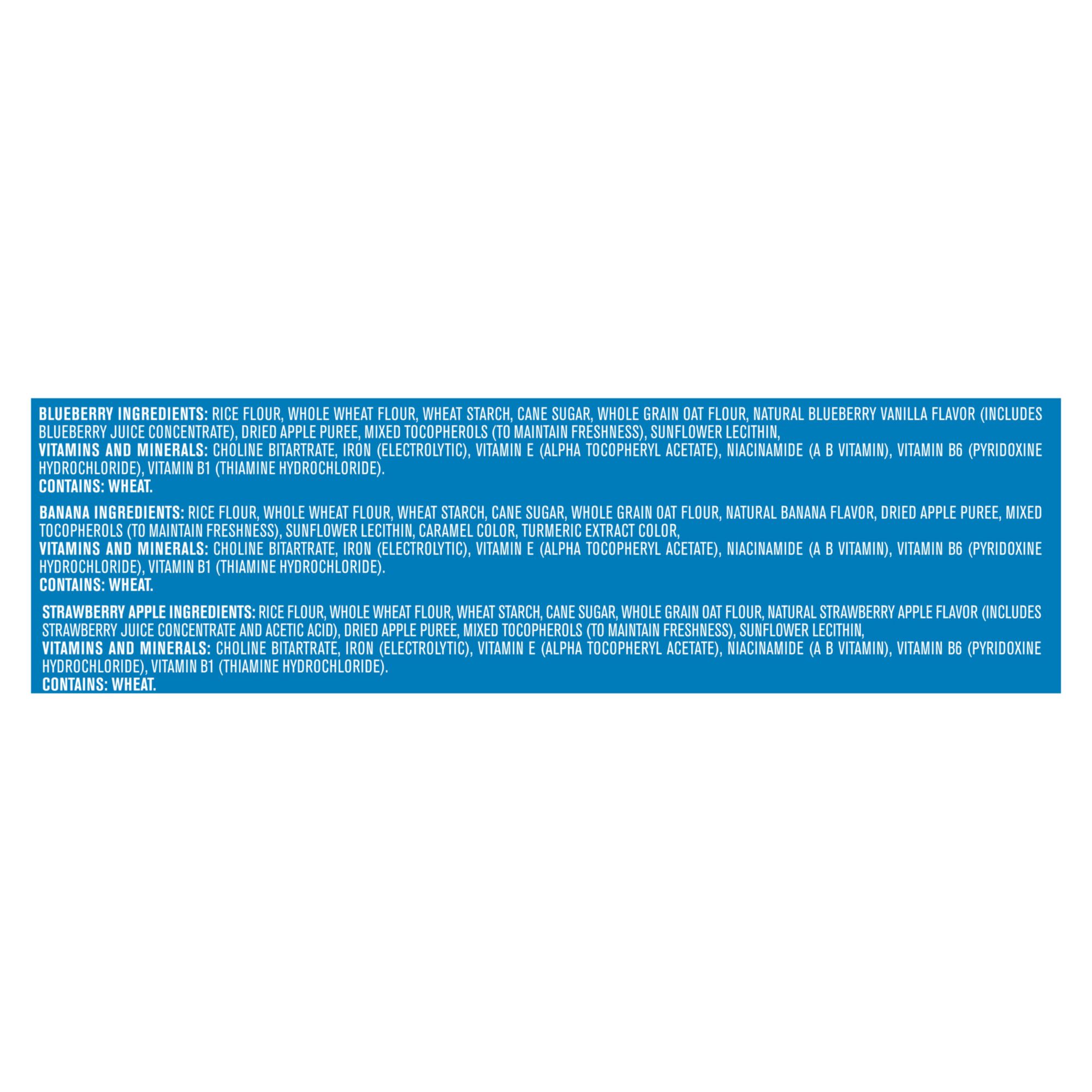 Ingredients: Blueberry Ingredients: Rice Flour, Whole Wheat Flour, Wheat Starch, Cane Sugar, Whole Grain Oat Flour, Natural Blueberry Vanilla Flavor (Includes Blueberry Juice Concentrate), Dried Apple Puree, Mixed Tocopherols (To Maintain Freshness), Sunflower Lecithin, Vitamins And Minerals: Choline Bitartrate, Iron (Electrolytic), Vitamin E (Alpha Tocopheryl Acetate), Niacinamide (A B Vitamin), Vitamin B6 (Pyridoxine Hydrochloride), Vitamin B1 (Thiamine Hydrochloride).banana Ingredients: Rice Flour, Whole Wheat Flour, Wheat Starch, Cane Sugar, Whole Grain Oat Flour, Natural Banana Flavor, Dried Apple Puree, Mixed Tocopherols (To Maintain Freshness), Sunflower Lecithin, Caramel Color, Turmeric Extract Color, Vitamins And Minerals: Choline Bitartrate, Iron (Electrolytic), Vitamin E (Alpha Tocopheryl Acetate), Niacinamide (A B Vitamin), Vitamin B6 (Pyridoxine Hydrochloride), Vitamin B1 (Thiamine Hydrochloride).strawberry Apple Ingredients: Rice Flour, Whole Wheat Flour, Wheat Starch, Cane Sugar, Whole Grain Oat Flour, Natural Strawberry Apple Flavor (Includes Strawberry Juice Concentrate And Acetic Acid), Dried Apple Puree, Mixed Tocopherols (To Maintain Freshness), Sunflower Lecithin, Vitamins And Minerals: Choline Bitartrate, Iron (Electrolytic), Vitamin E (Alpha Tocopheryl Acetate), Niacinamide (A B Vitamin), Vitamin B6 (Pyridoxine Hydrochloride), Vitamin B1 (Thiamine Hydrochloride).