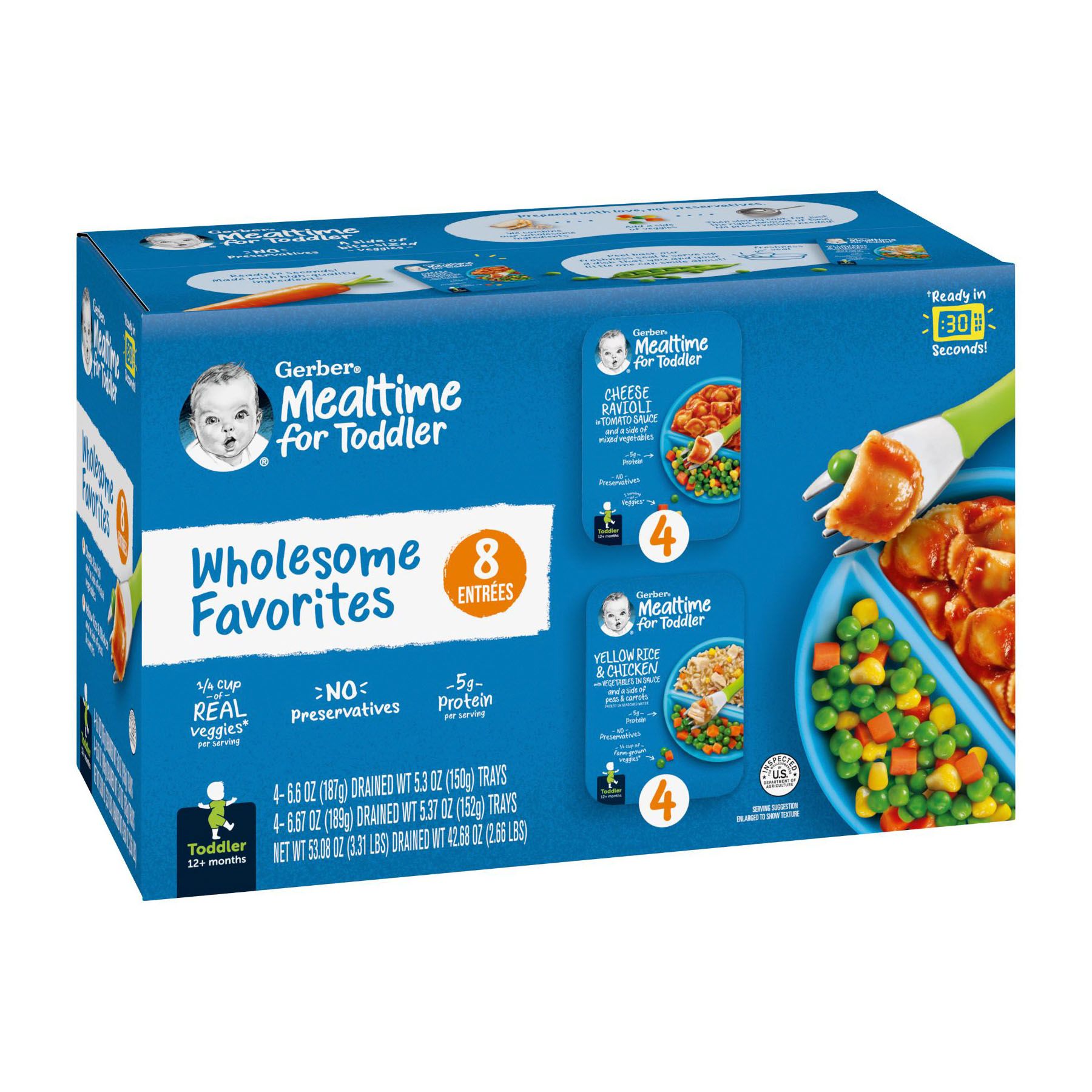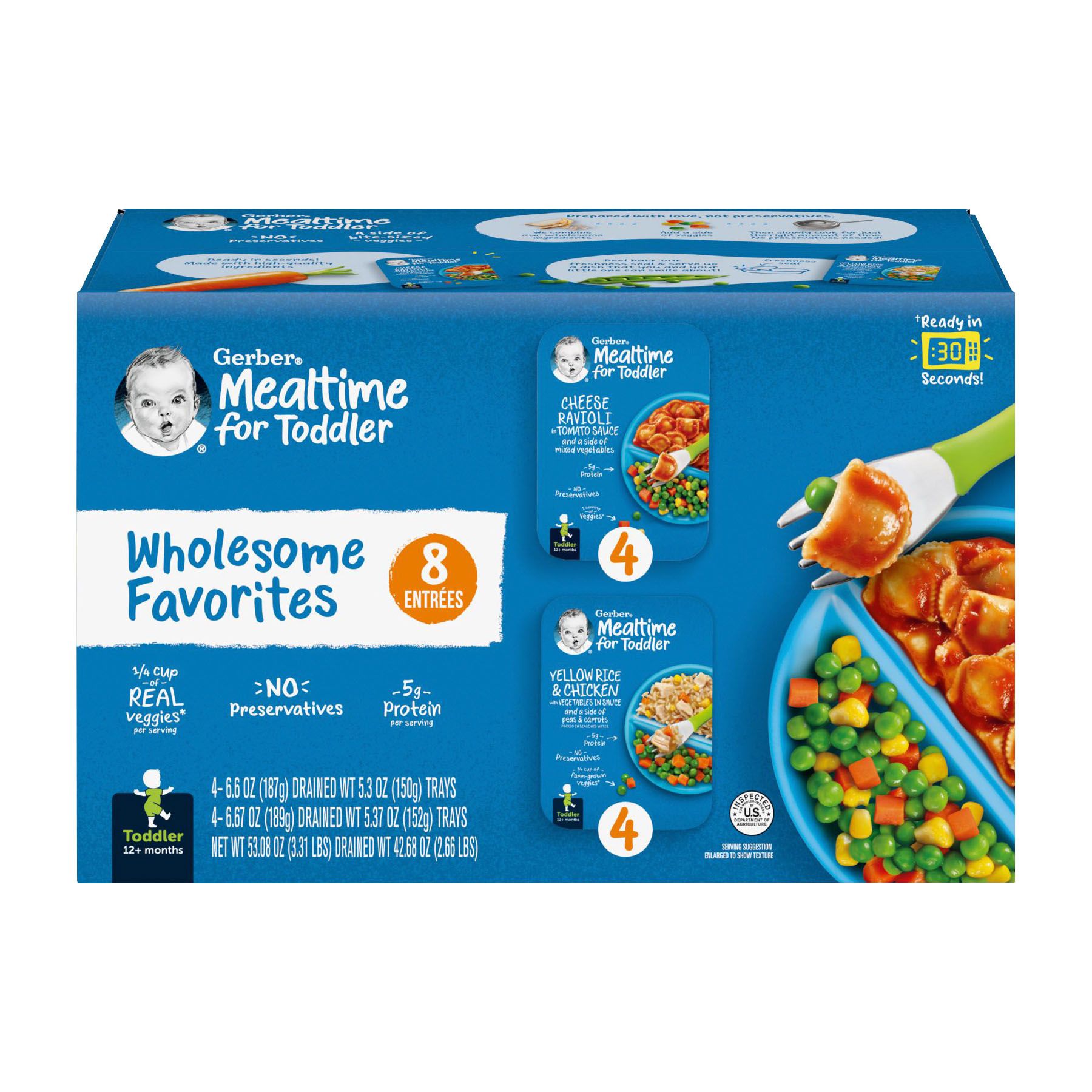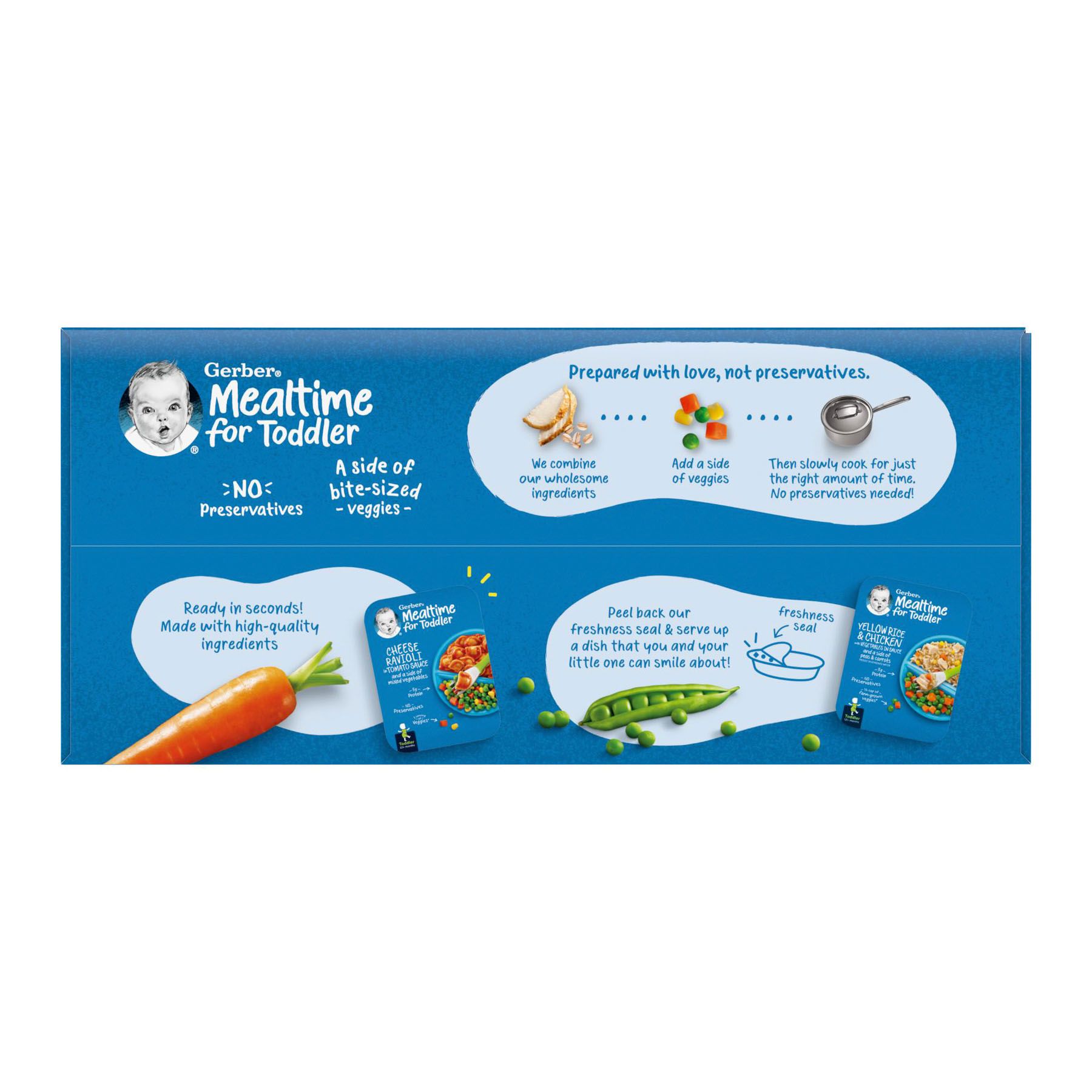 Simply the good stuff. Gerber's Mealtime for Toddlers entrees are made with love, not preservatives. First, we combine the ingredients and seal them up tight. Then we slowly cook for just the right amount of time for a taste your little one will love with no preservatives. Wholesome Nutrition with none of the hassle. An easy-to-serve meal that meets your toddler's developmental needs. Good source of protein and an excellent source of Vitamin A. Provides a full serving of farm-fresh veggies.