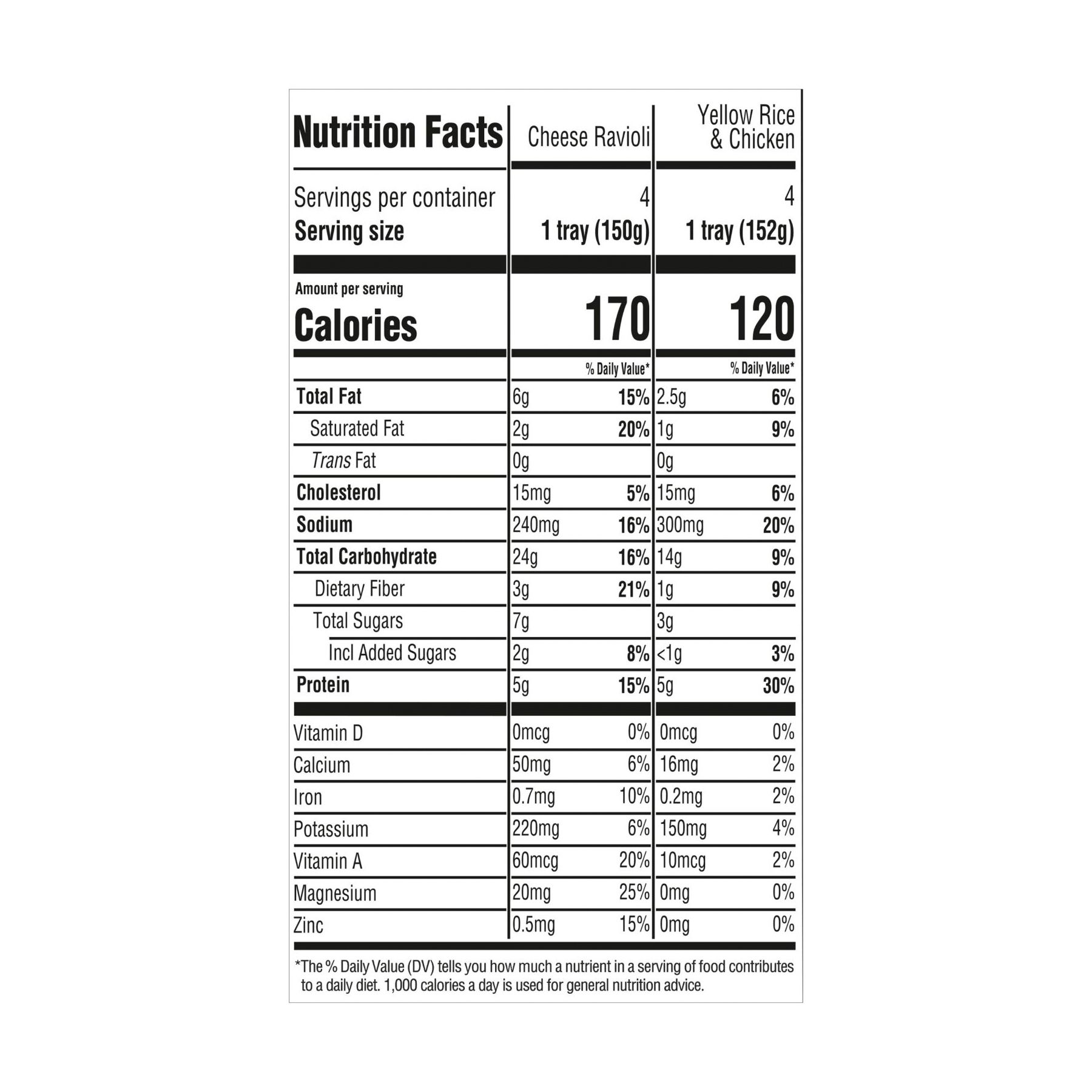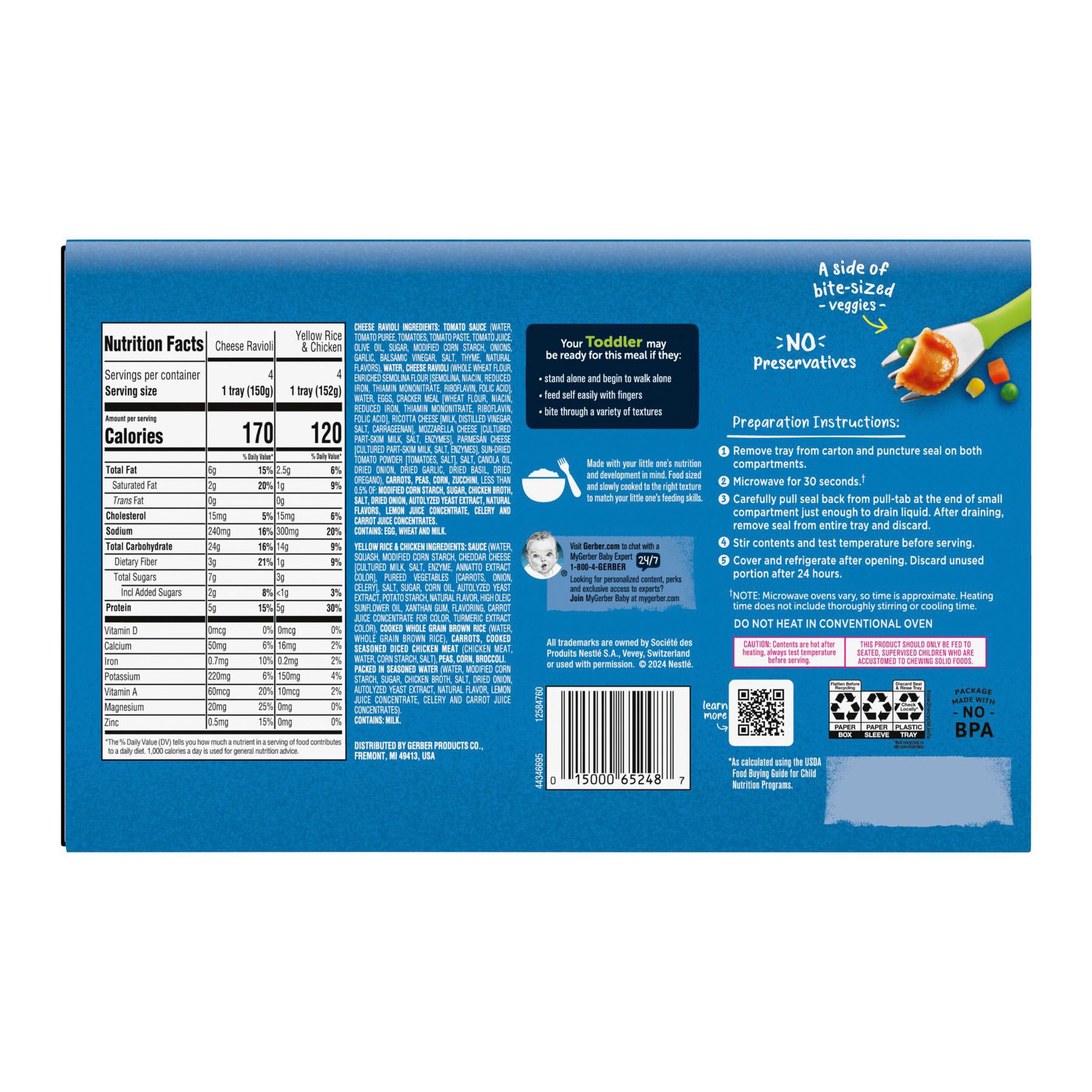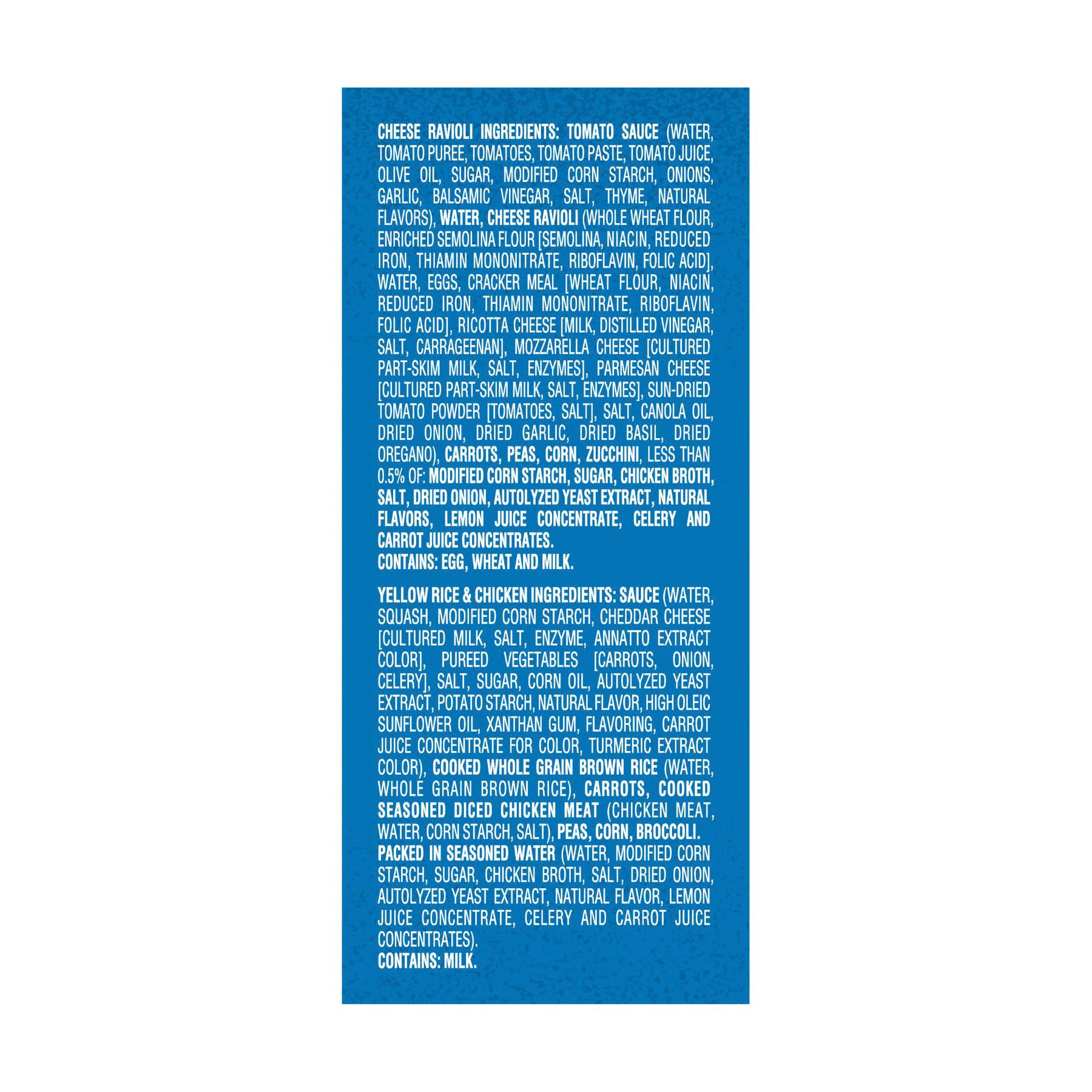 Package made with no BPA 5g of protein and 9g of whole grains per serving No artificial flavors or preservatives 1/4 cup of real vegetables Ready in 30 seconds Includes 8 entrees (4 cheese ravioli, 4 yellow rice and chicken)