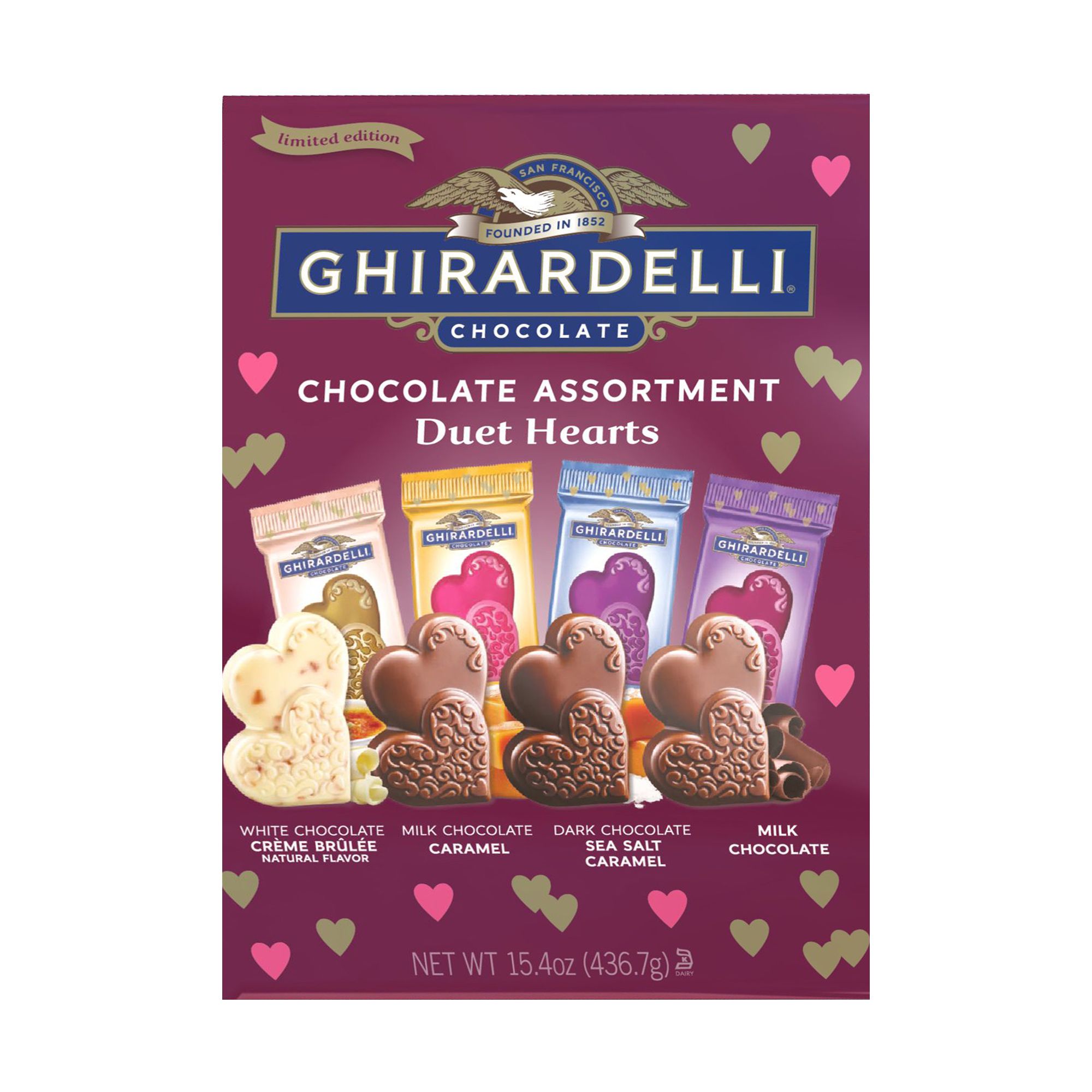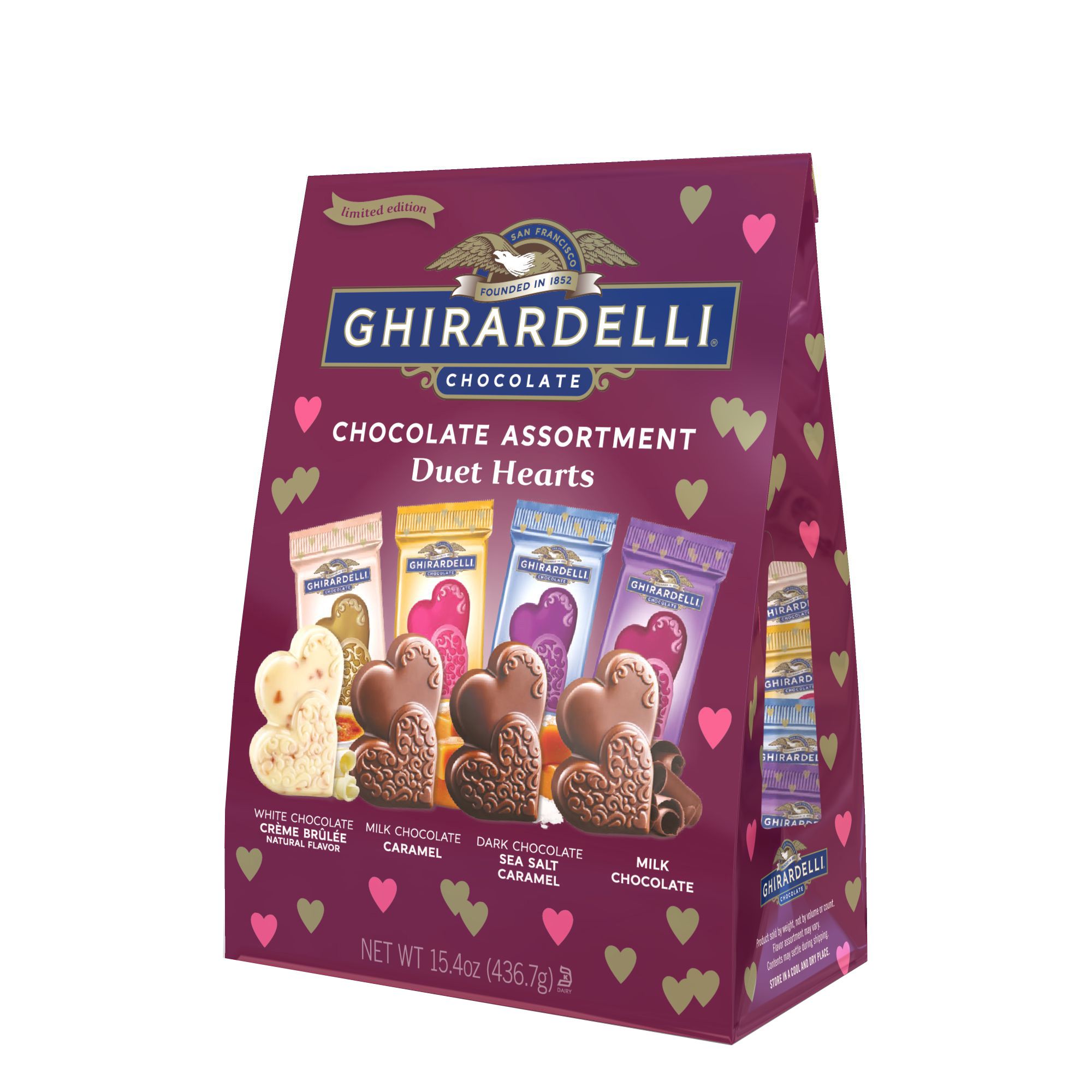 Celebrate the season of love with Ghirardelli's rich indulgent chocolate assortment in a unique two hearts shape designed to make this occasion extra special for all relationships. This year's Duet Hearts assortment includes 4 Ghirardelli signature flavors: Milk Chocolate & Caramel, Dark Chocolate Sea Salt Caramel, Milk Chocolate, and new Creme Brulee. Whether with friends, family or a special someone, these decadent chocolates are the perfect way to express that love is, in fact, better together. Ghirardelli Chocolate Duet Hearts are individually foil wrapped chocolates perfect for Valentine's Day candy dish, basket/gift fillers, and to share with friends and loved ones. Ghirardelli Premium Chocolate is made in the USA.