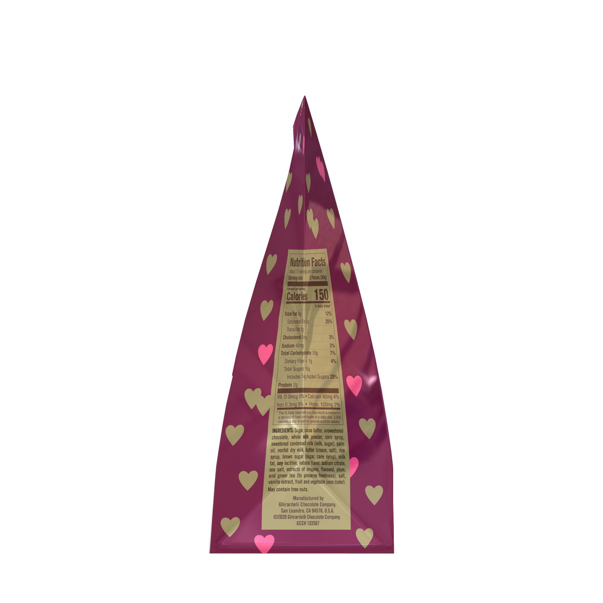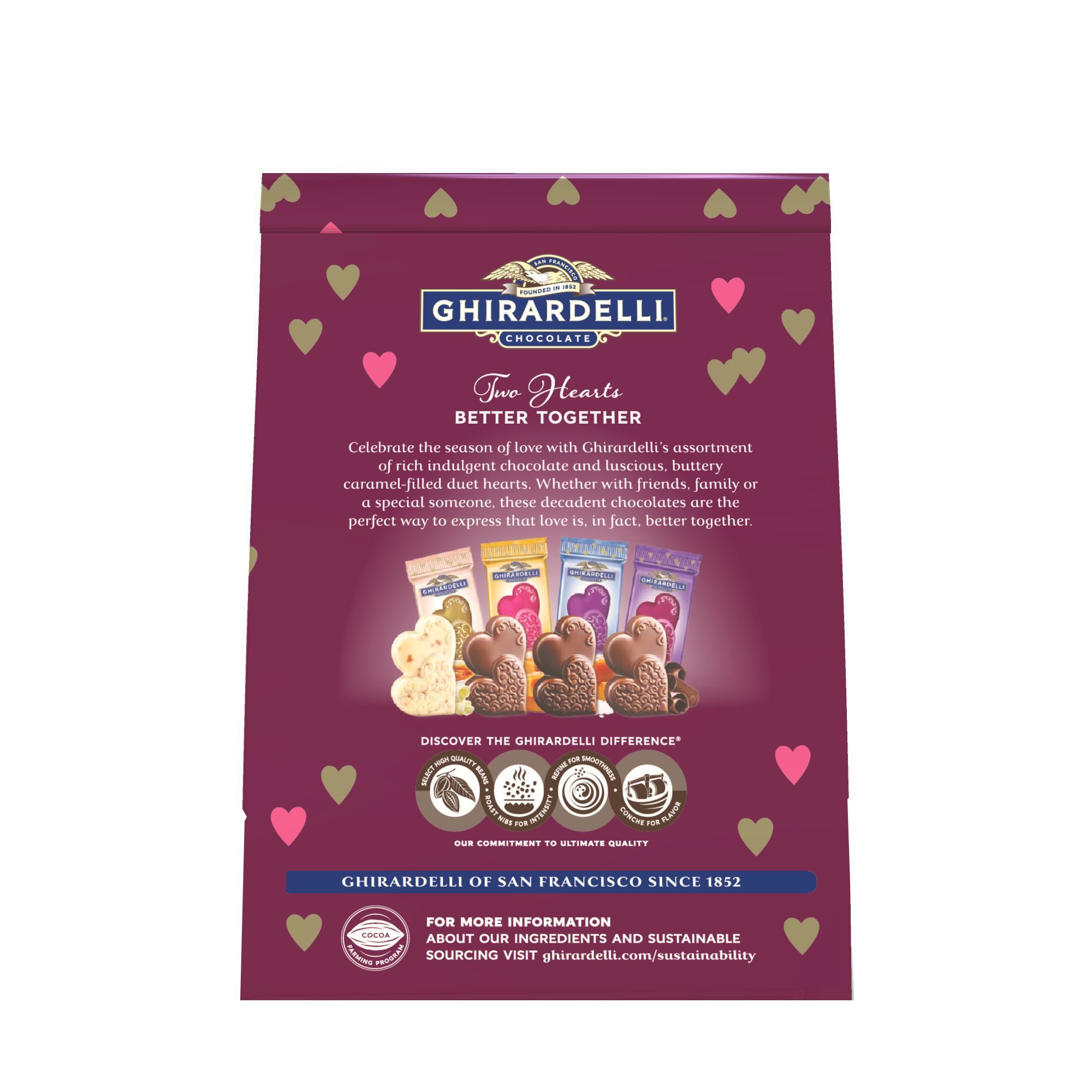 Contains Ghirardelli Milk Chocolate and Dark Chocolate Sea Salt signature recipes of slow melting chocolate with luscious caramel on the inside Non GMO Kosher Ghirardelli Chocolate designed a unique two hearts shape for Valentine's Day to make the occasion extra special for all relationships