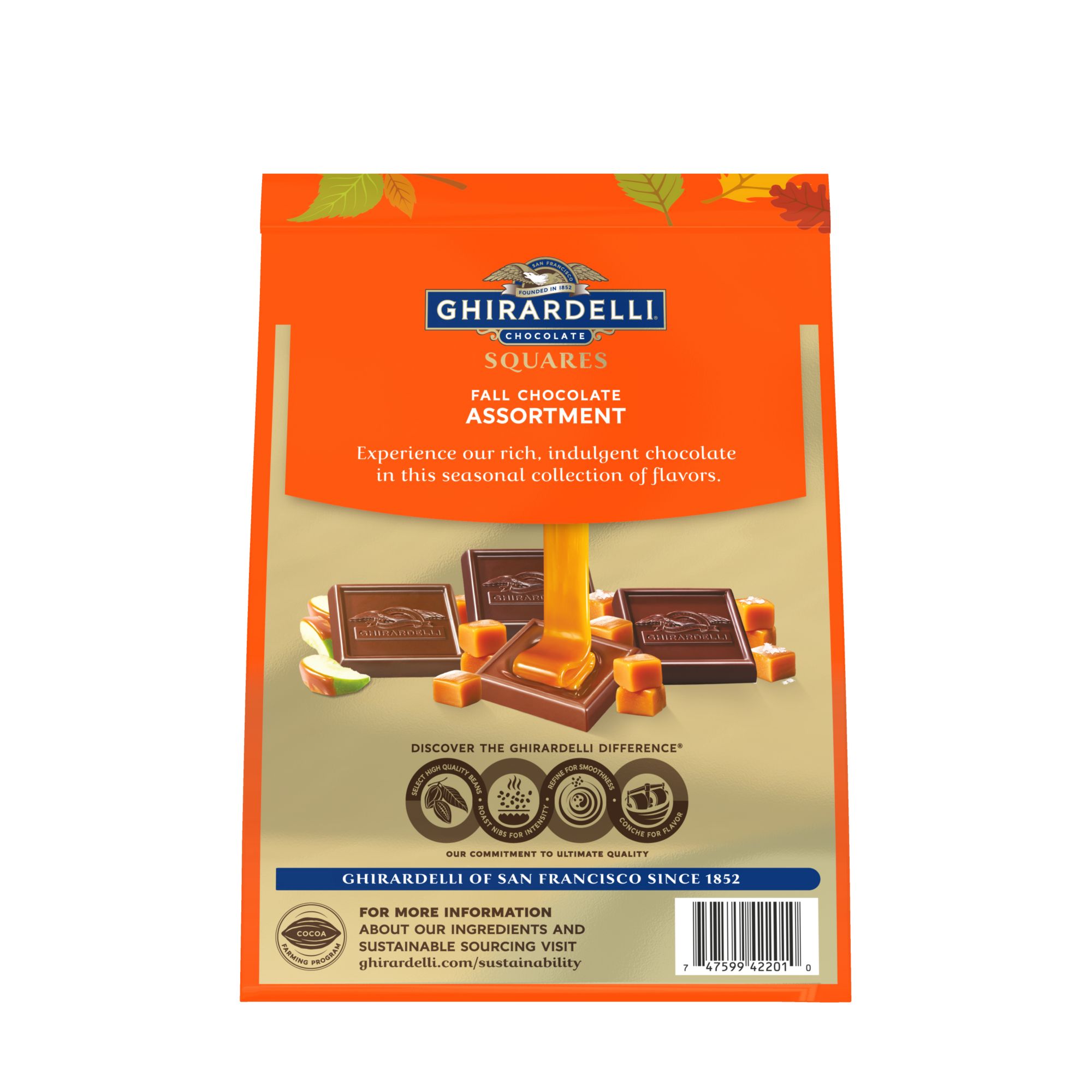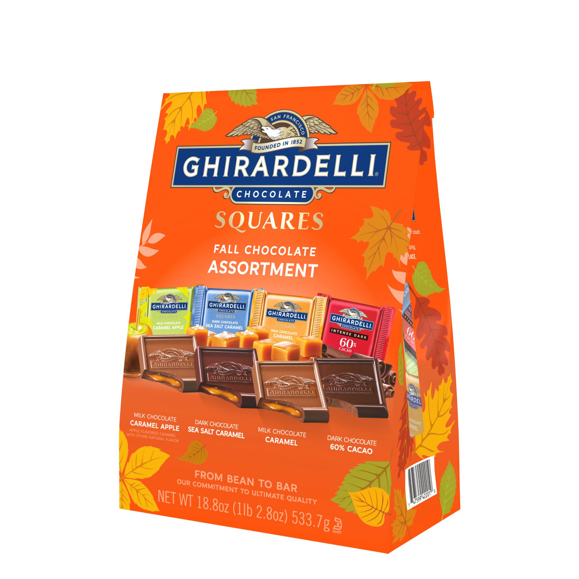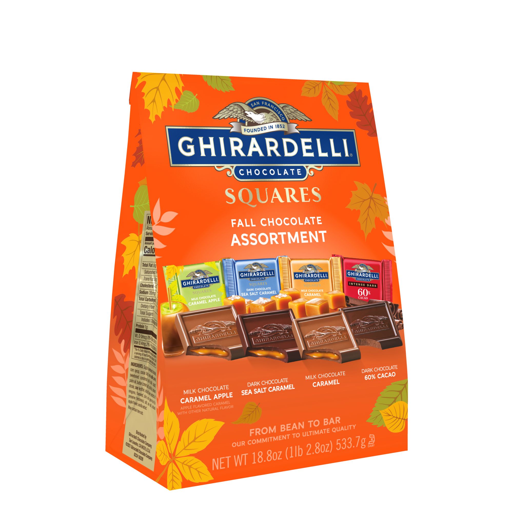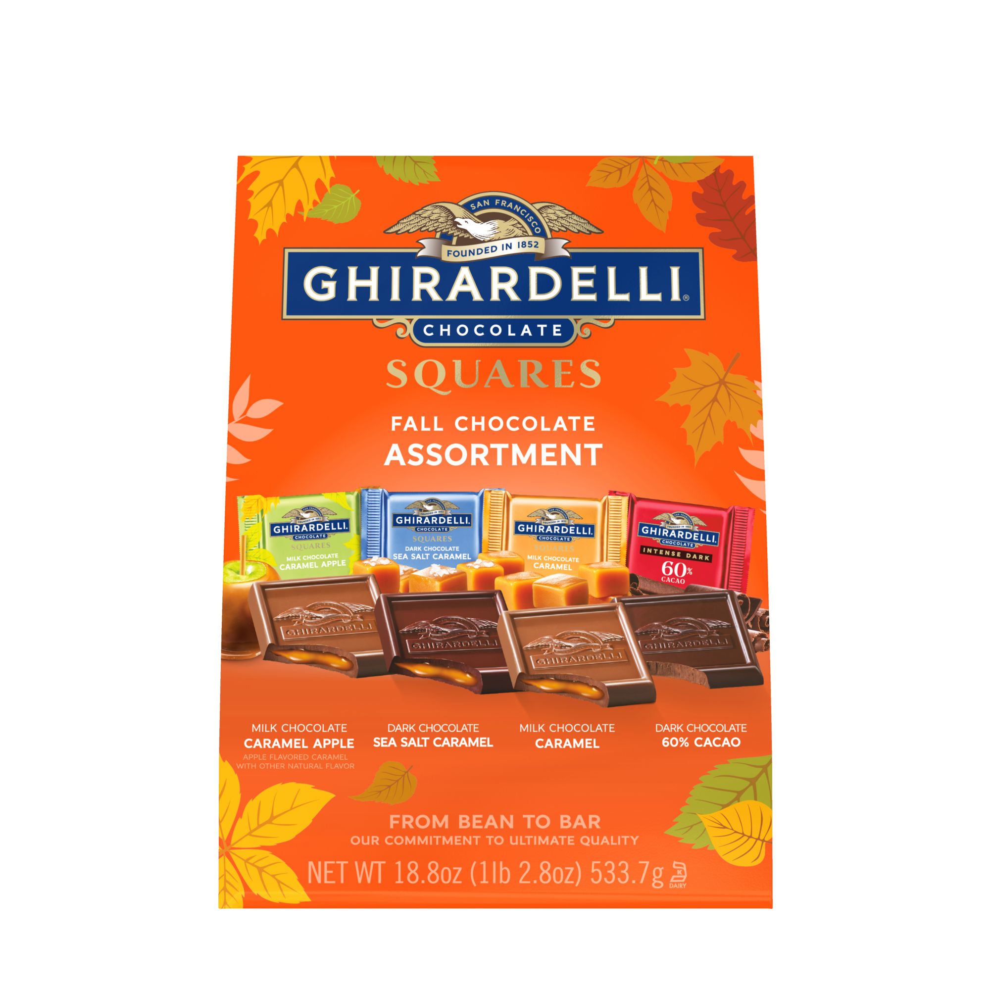 Assortment includes new milk chocolate caramel apple, milk and caramel, dark sea salt caramel, and 60% cacao squares Give the gift of Ghirardelli with an assortment of fall squares Share a fall caramel apple favorite with loved ones. Bring sparkle to any candy dish with festive Ghirardelli Dfall assorted squares From Bean to Bar: The commitment to ultimate quality Sustainably sourced cocoa beans: visit ghirardelli.com/sustainability for more information Inspired by the home San Francisco we pour the hearts into everything we do to create a range of truly exceptional chocolate experiences Kosher Made in the USA