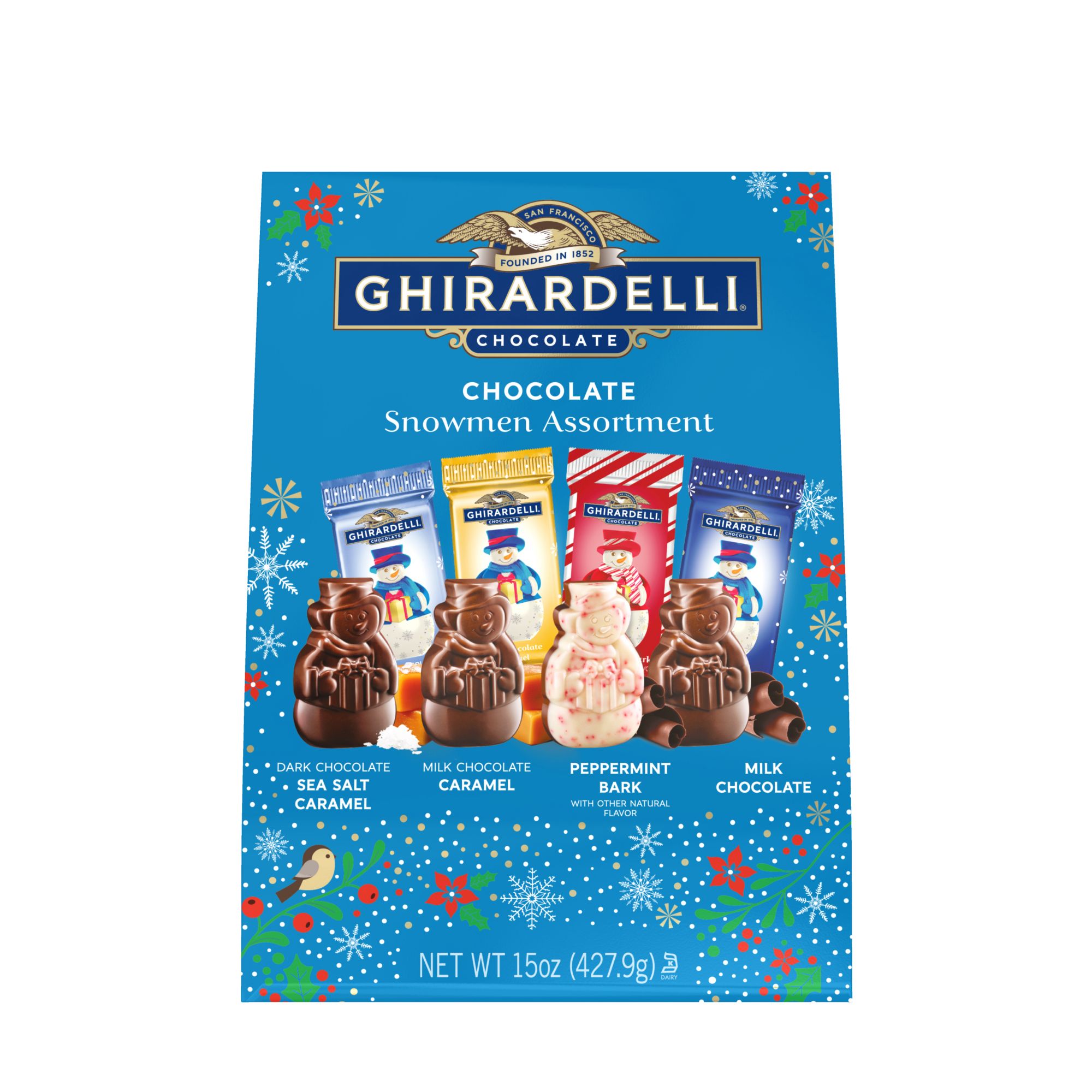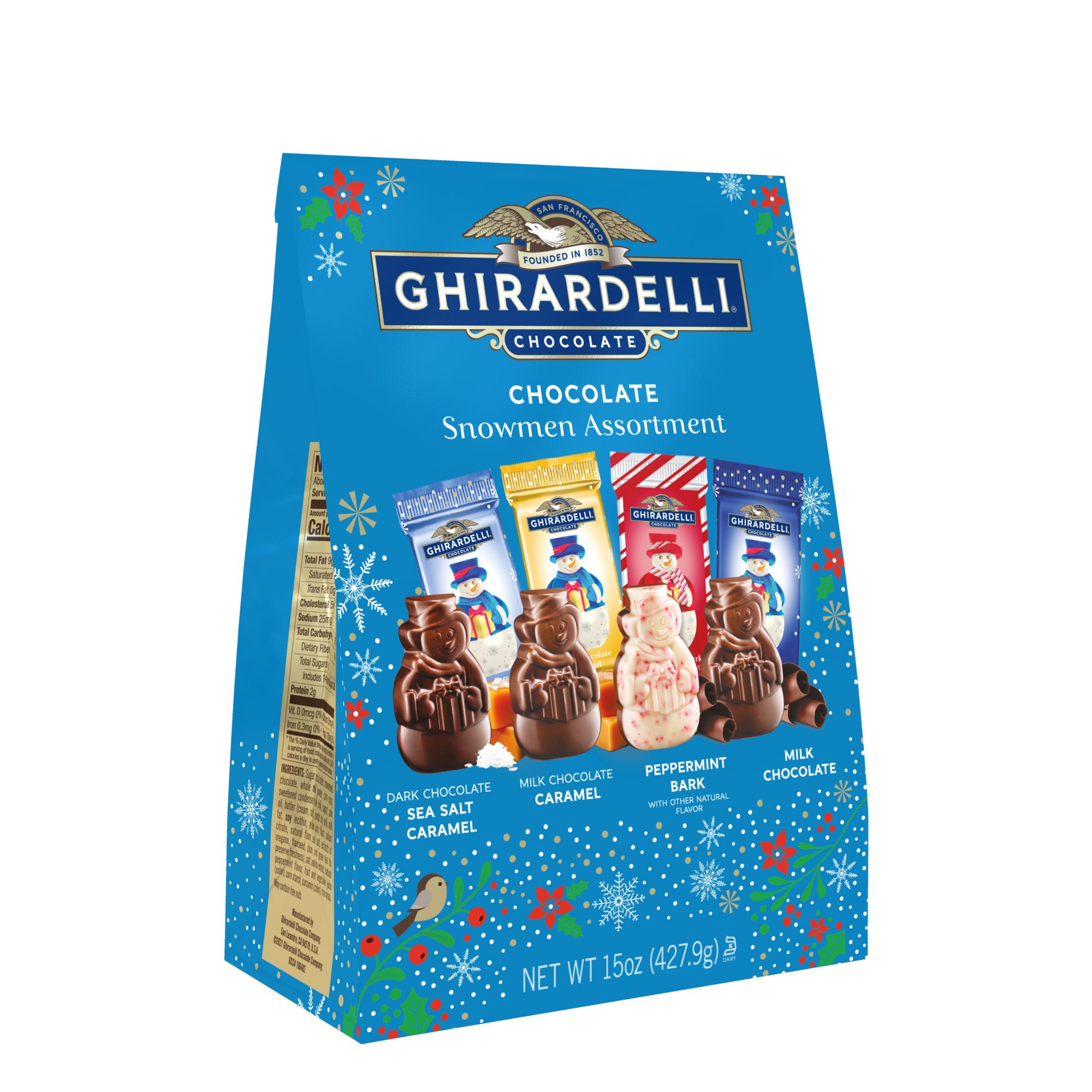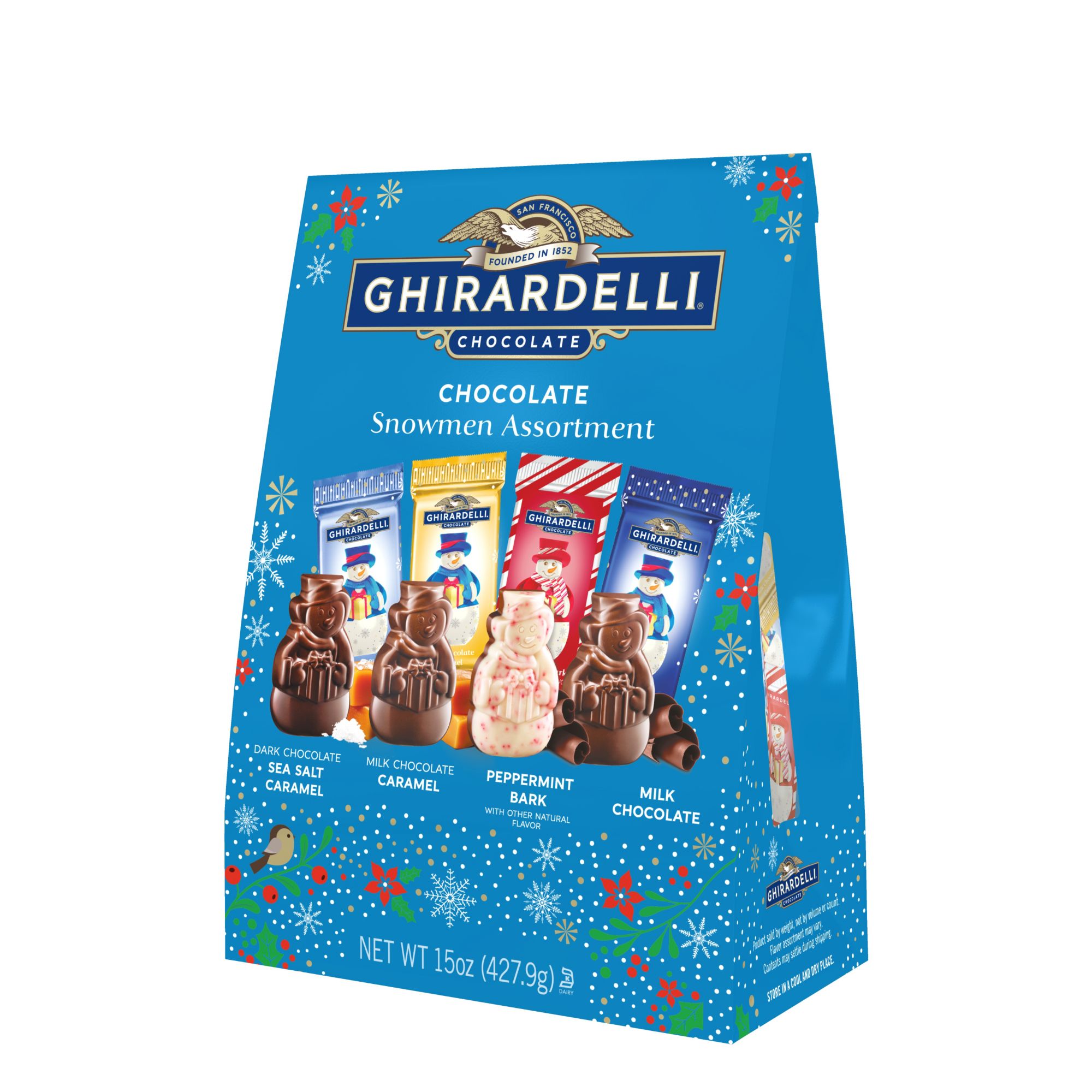 Assortment includes: milk caramel snowmen, dark chocolate sea salt caramel snowmen, peppermint bark snowmen, milk chocolate snowmen Give the gift of Ghirardelli with an assortment of holiday snowman-shaped premium chocolates Share a premium treat with loved ones. Bring sparkle to any candy dish with festive Ghirardelli snowman shapes From Bean to Bar: The commitment to ultimate quality Sustainably sourced cocoa beans: visit ghirardelli.com/sustainability for more information Inspired by the home of San Francisco we pour our hearts into everything we do to create a range of truly exceptional chocolate experiences Kosher Made in the USA