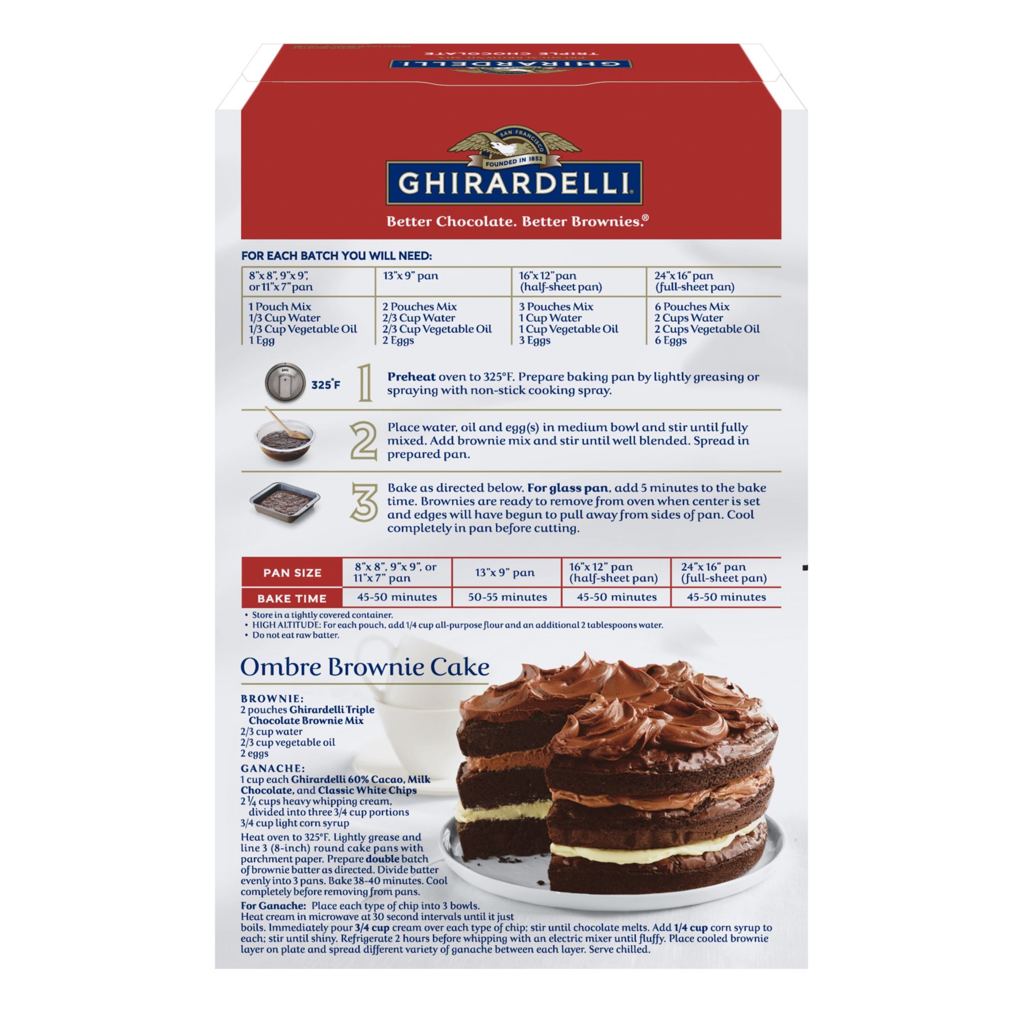 Indulge in the rich, decadent chocolate taste that you expect from Ghirardelli. Crafted with semi-sweet, bittersweet, and milk chocolate chips, this Triple Chocolate Brownie creates an intense chocolate experience making this timeless classic even better. This exclusive formula of brownie mix has been a customer favorite. The blend of chocolate has the perfect chocolate sweetness balance that makes the product such a great brownie.