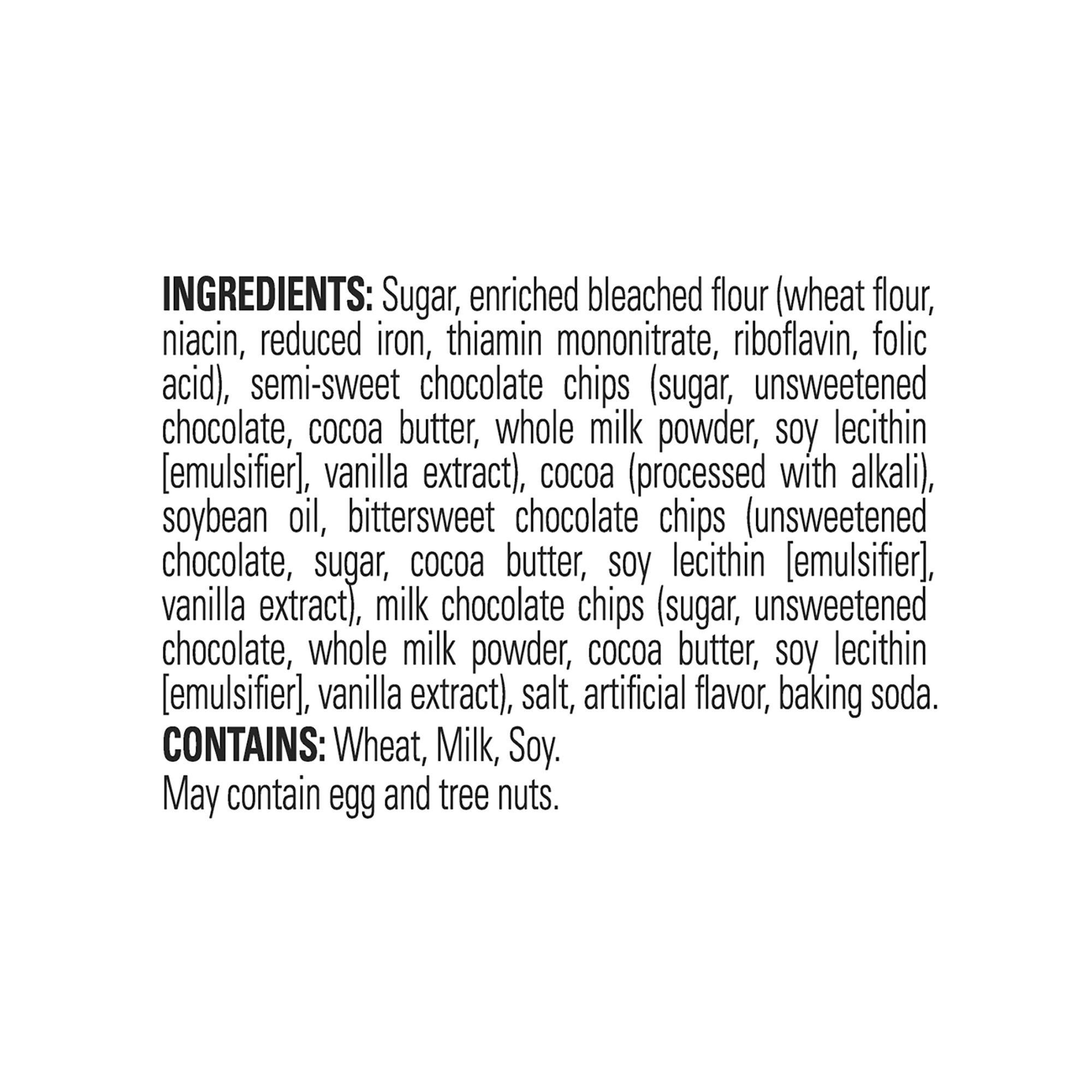 Ingredients: Sugar, Enriched Bleach Flour, Semi-Sweet Chocolate Chips, Milk Chocolate Chips, Bittersweet Chocolate Chips, Brown Sugar, And Vanilla Extract.