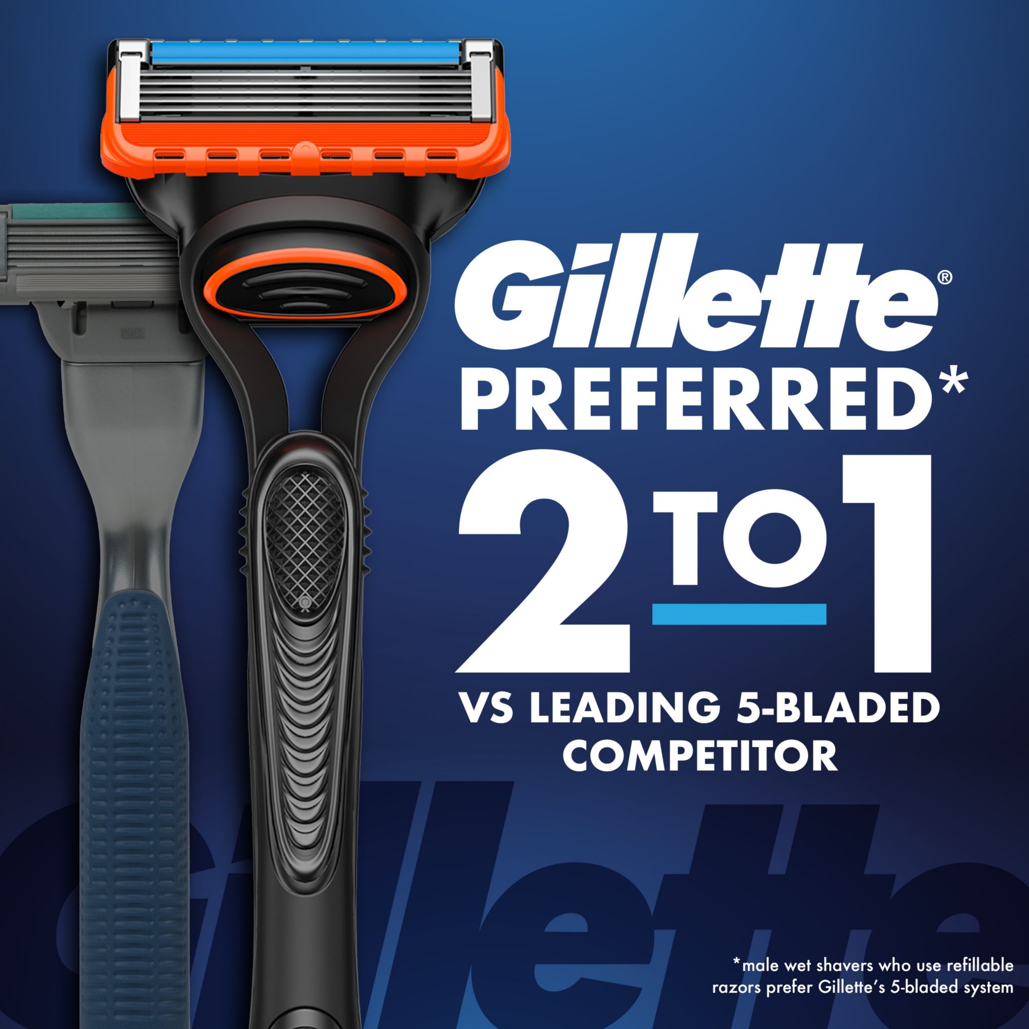 Experience closeness and long-lasting comfort with the Fusion5 men's razor and refills. Featuring a durable, ergonomic razor handle to give you control and five sharp anti-friction blades for a close, long-lasting shave you can barely feel. A single precision blade on the back is designed to create precise edges and shave tricky areas like sideburns, corners of the mouth, and under the nose. These razor blades for men are equipped with soft elastomer microfins to gently stretch your skin before the blades and a microcomb that helps guide your hair to the blades. The simple yet effective blade stabilization maintains optimal blade spacing for comfort while allowing the blades to adjust to the contours of your face. The larger* lubrication strip, which releases lubricants that help your razor glide across your face, provides a smoother glide. The handle, with a modern ergonomic design, has a great grip for great control and easily rolls through the fingers to change from the front to the back of the cartridge. And with each blade refill providing up to 20 shaves** you're given long-lasting value. Concerned your Gillette handle won't fit? All Fusion5 razor blades fit all Gillette five-blade razor handles (excluding GilletteLabs). Pairs perfectly with Gillette Fusion Sensitive Shaving Gel for added protection from shaving irritation. This package contains 1 razor handle and 9 Fusion5 razor blade refills. (*vs previous Fusion5, **based on 3 shaves per week).