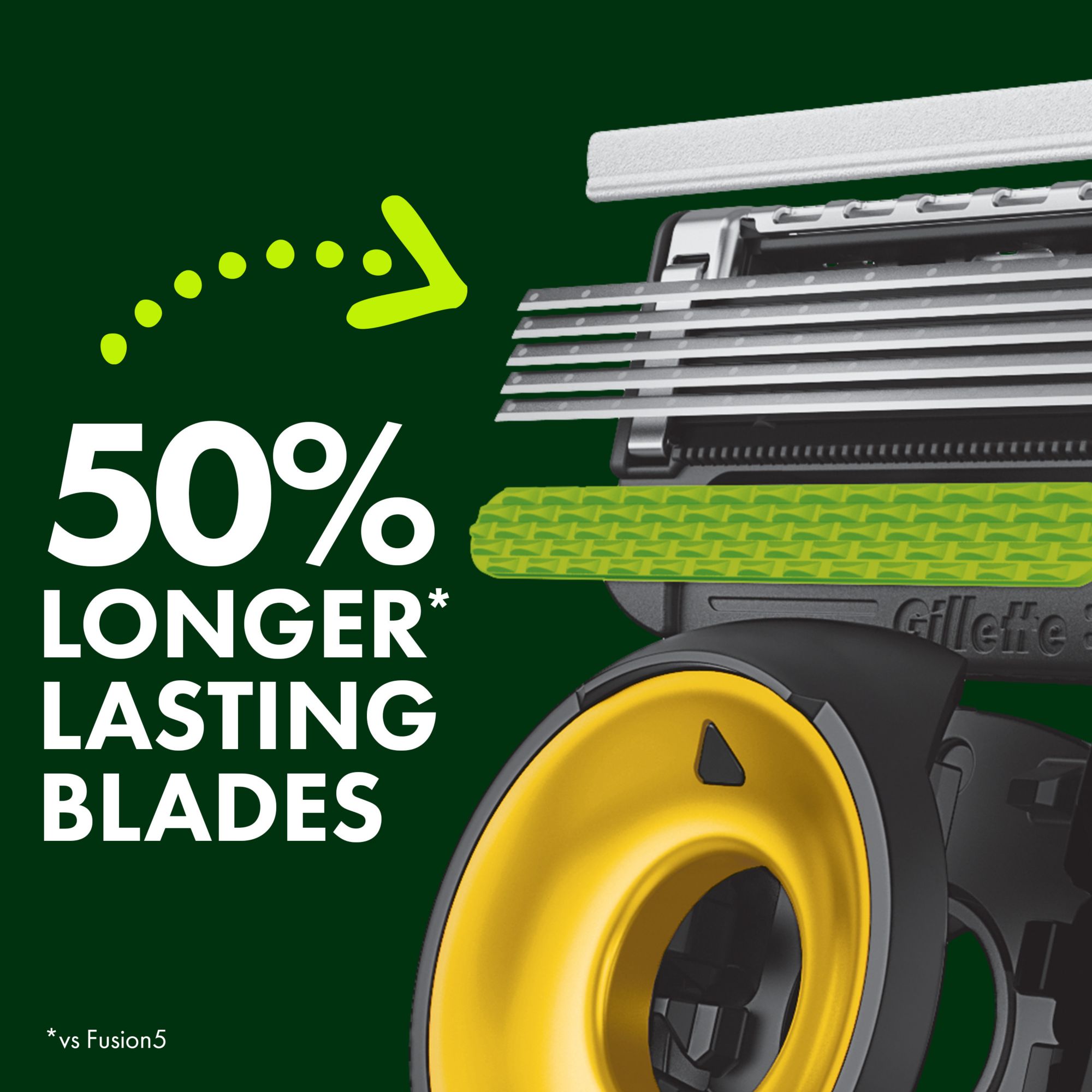 50% Longer-lasting blades*: So you'll be ready for every touchdown and tailgate. *per cartridge vs Fusion5
