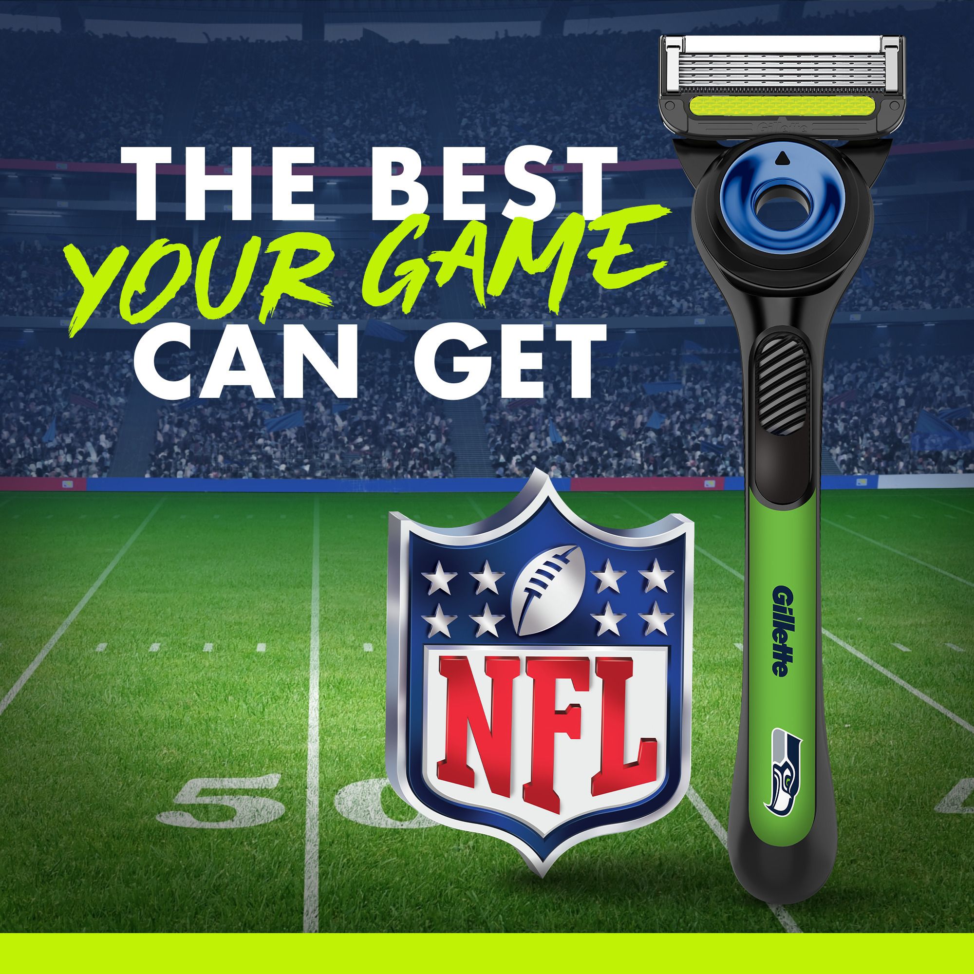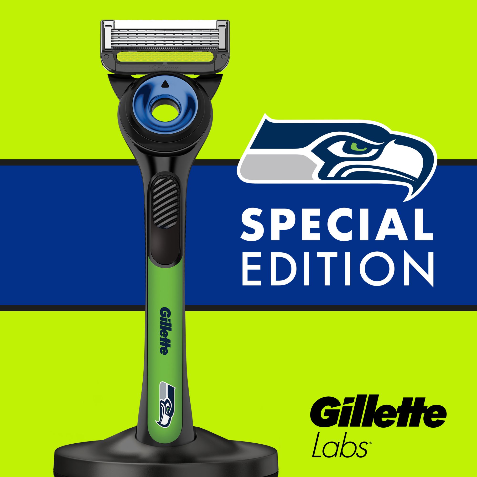 Get game day ready with the Special Edition GilletteLabs Seattle Seahawks Razor, the ultimate shaving tool to celebrate your team. This razor is the Best Your Game Can Get, featuring five of Gillette's Best Blades* that last 50% longer than Fusion, per cartridge. This Special Edition NFL Razor features GilletteLabs' five integrated technologies to help you cheer on your team with confidence. Equipped with an exfoliating bar to release trapped hairs for a smooth shave, a precision trimmer for tricky areas, a lubrastrip for incredible comfort, and a flexdisc that contours to your face, you'll be looking sharp for every touchdown. Plus, it's compatible with GilletteLabs razor blade refills and the Gillette Heated Razor. *Blades are also available on other Gillette products.