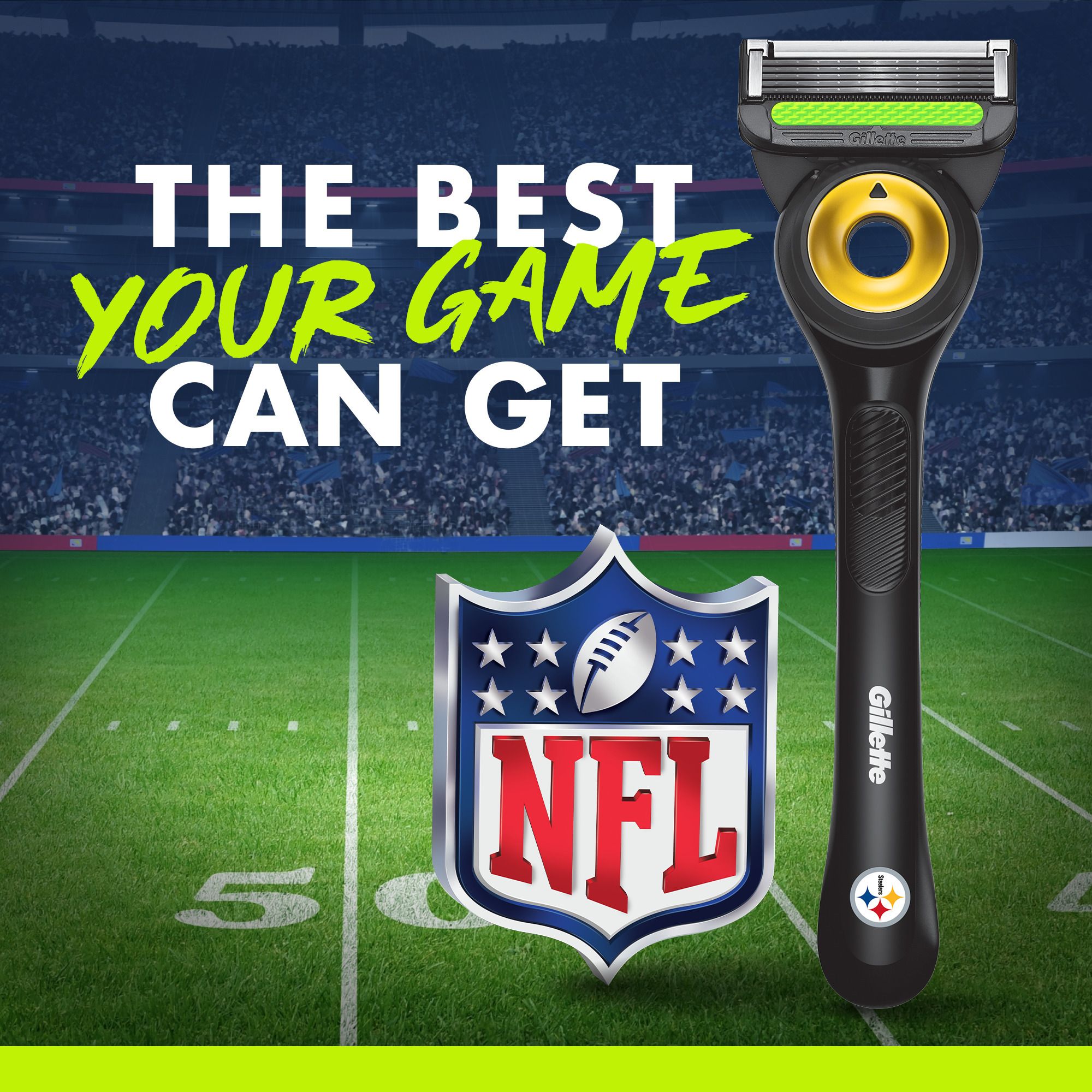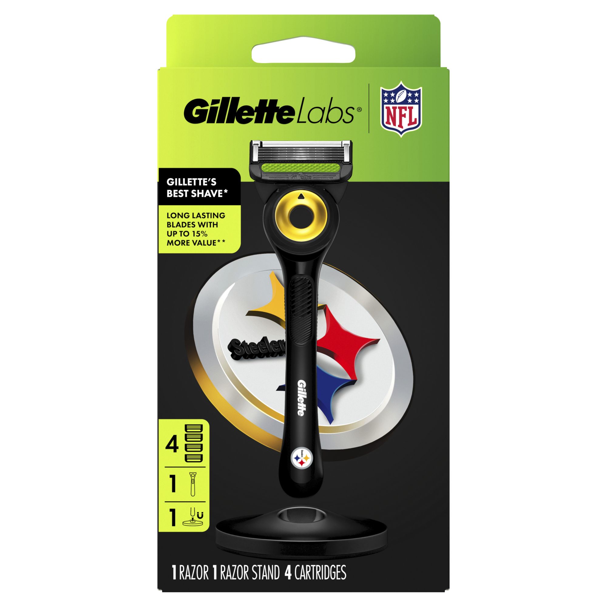 Get game day ready with the Special Edition GilletteLabs Pittsburgh Steelers Razor, the ultimate shaving tool to celebrate your team. This razor is the Best Your Game Can Get, featuring 5 of Gillette's Best Blades* that last 50% longer than Fusion, per cartridge. This Special Edition NFL Razor features GilletteLabs' five integrated technologies to help you cheer on your team with confidence. Equipped with an exfoliating bar to release trapped hairs for a smooth shave, a precision trimmer for tricky areas, lubrastrip for incredible comfort, and a flex disc that contours to your face, you'll be looking sharp for every touchdown. Plus, it's compatible with GilletteLabs razor blade refills and the Gillette Heated Razor. *Blades are also available on other Gillette products.