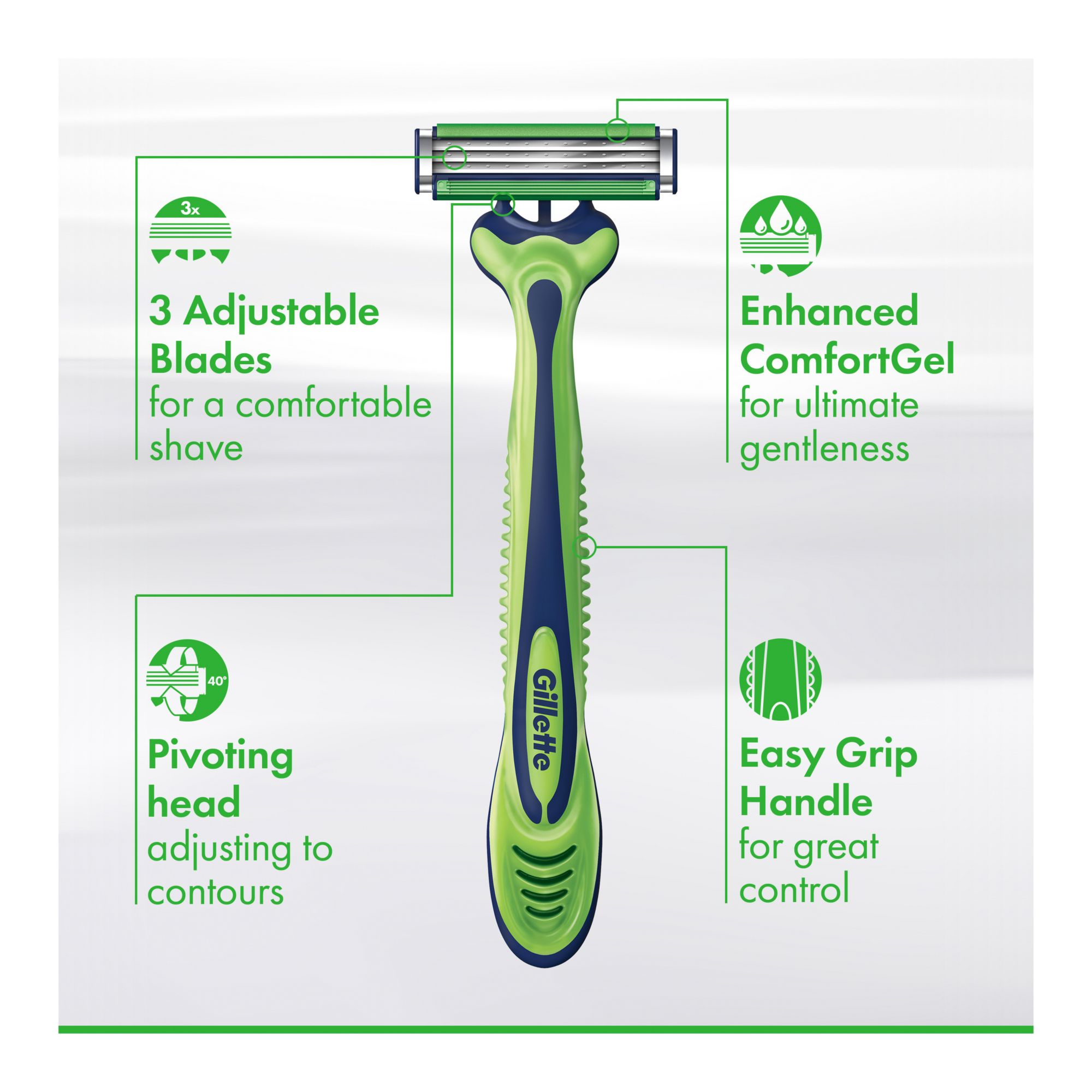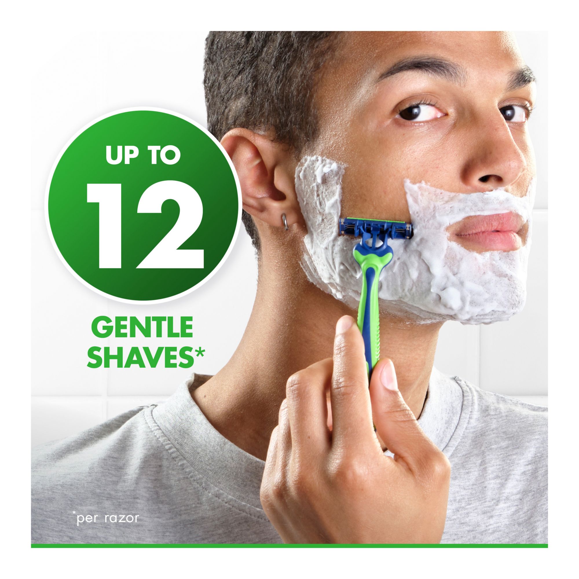 Looking for a men's disposable razor that can get you up to twelve gentle shaves per razor? Gillette's Sensor3 Sensitive disposable razors do just that thanks to its three, chromium coated, skin sensing, adjustable blades and a forty degree pivoting head that automatically adjusts to the contours of the skin's surface to give a close, smooth, and comfortable shave. Additionally, the skin guard fins have five elastomer fins that gently stretch the skin to create a smooth, even surface for an optimal shave. Each razor can last up to twelve gentle shaves. Enjoy a gentler shave with less irritation (vs Sensor2 Plus). Sensor3 disposable razors for men feature an enhanced Lubrastrip with water activated Comfortgel technology for ultimate comfort and gentle shaving on your sensitive skin. Complete with an ergonomic shaped, non slip, easy grip rubber handle for great control and easy rinse blades for two times better rinsing (vs Sensor2 Plus disposable razors) to help avoid razor clog. See why the Gillette Sensor3 Men's Disposable razor is the world's number one selling three bladed disposable razor*. For best results, use with your favorite Gillette shave gel, cream, or foam. Each pack of 24 Sensor3 Sensitive disposable razors last up to 288 shaves. Made with 50% recycled plastics. Just toss when you are ready for a new one. See why *Based on Nielsen sales data among three bladed male disposable razors.