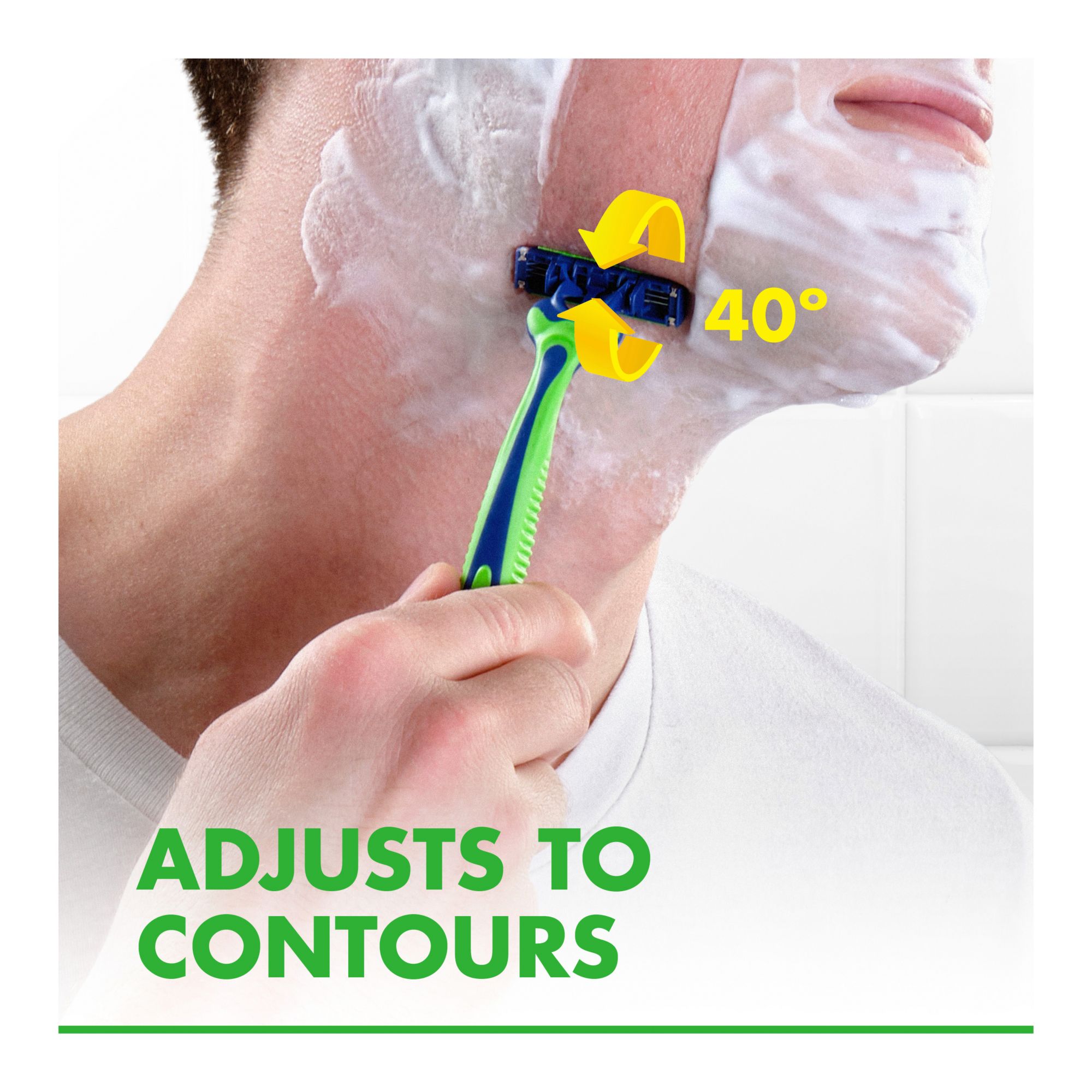40 degree pivoting head which adjusts to the contours of the face