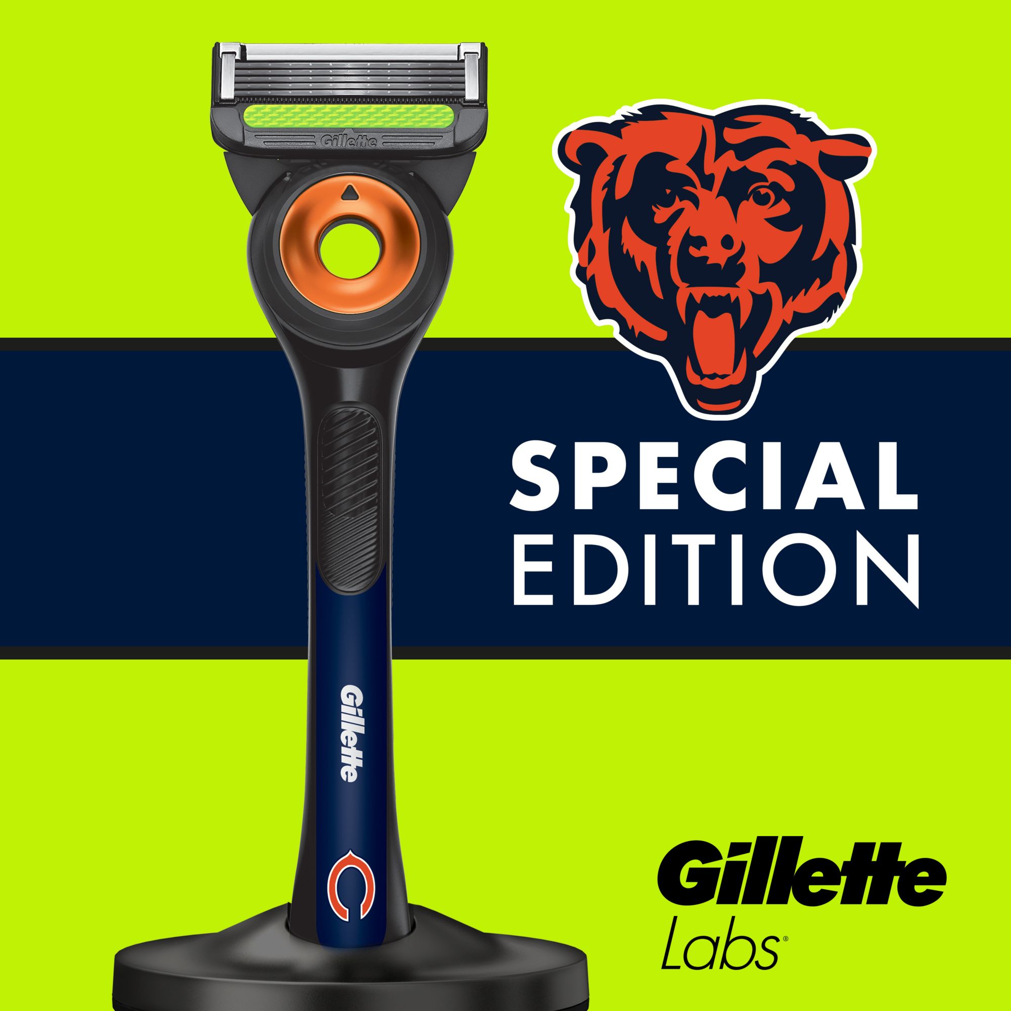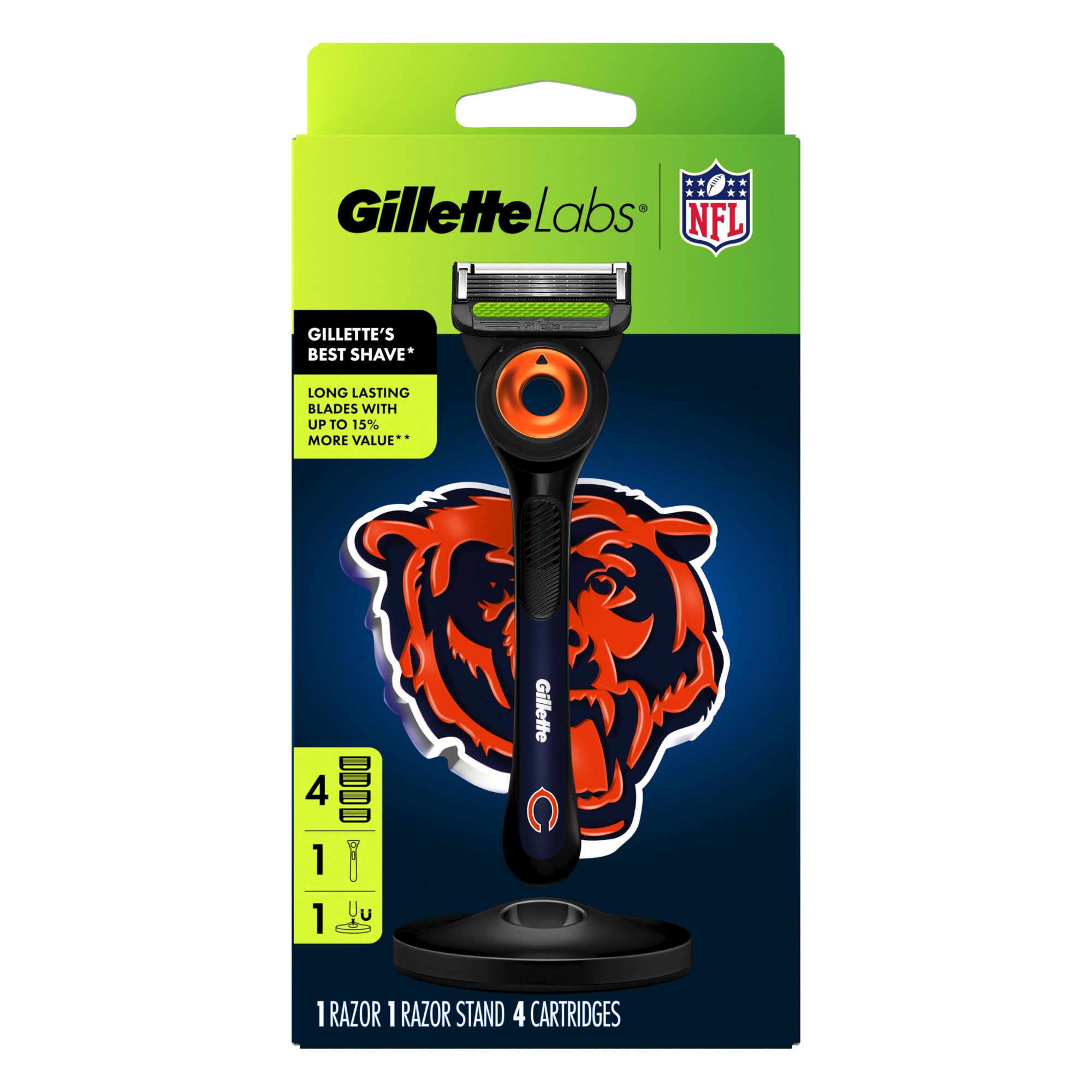 Get game day ready with the Special Edition GilletteLabs Chicago Bears Razor, the ultimate shaving tool to celebrate your team. This razor is the Best Your Game Can Get, featuring five of Gillette's Best Blades* that last 50% longer than Fusion, per cartridge. This Special Edition NFL Razor features GilletteLabs' five integrated technologies to help you cheer on your team with confidence. Equipped with an exfoliating bar to release trapped hairs for a smooth shave, a precision trimmer for tricky areas, a lubrastrip for incredible comfort, and a flexdisc that contours to your face, you'll be looking sharp for every touchdown. Plus, it's compatible with GilletteLabs razor blade refills and the Gillette Heated Razor. *Blades are also available on other Gillette products.