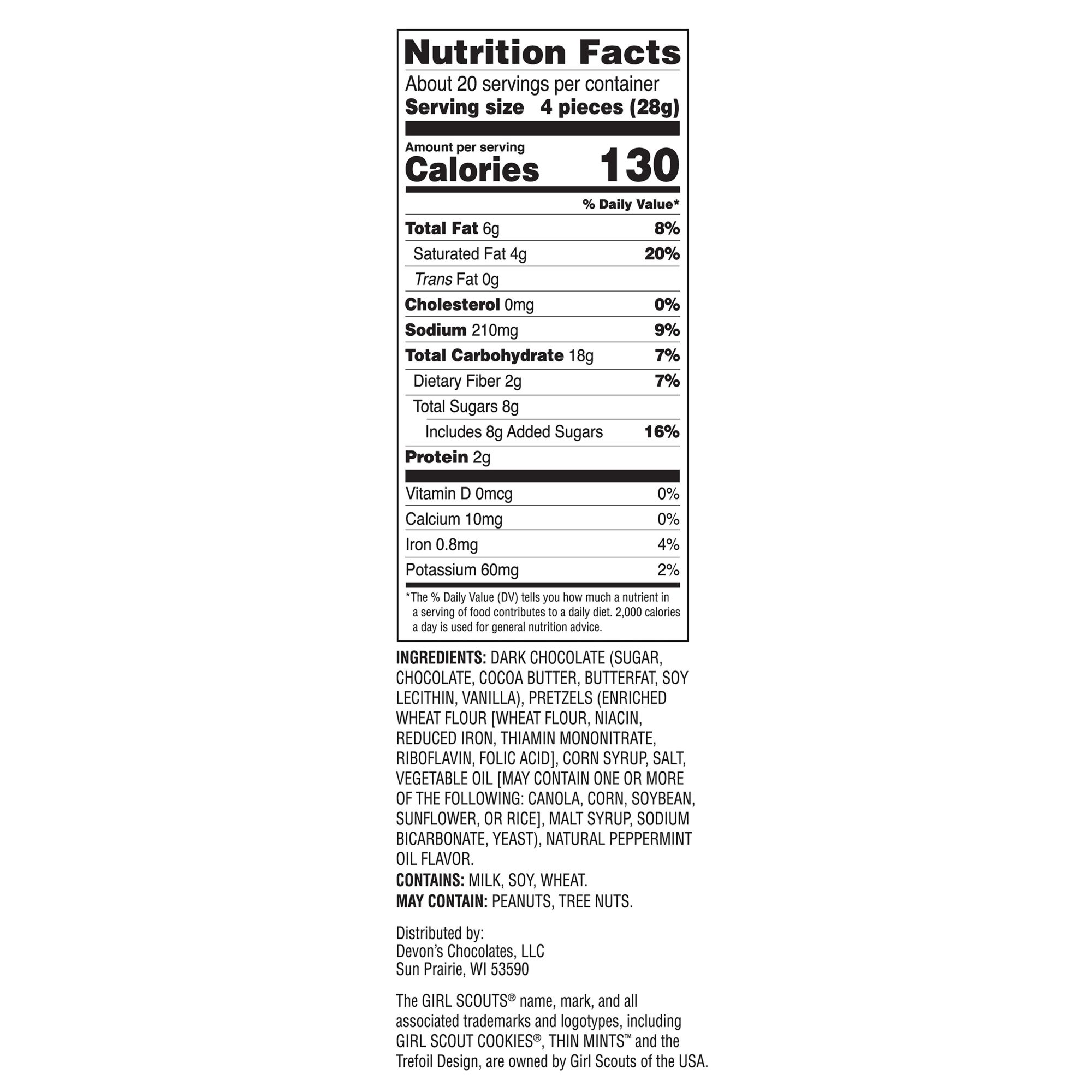 Ingredients: Dark Chocolate (Sugar, Chocolate, Cocoa Butter, Butterfat, Soy Lecithin, Vanilla), Pretzels (Enriched Wheat Flour)(Wheat Flour, Niacin, Reduced Iron, Thiamin Mononitrate, Riboflavin, Folic Acid), Corn Syrup, Salt, Vegetable Oil (May Contain One or More Of The Following: Canola, Corn, Soybean, Sunflower or Rice), Malt Syrup, Sodium Bicarbonate, Yeast), Natural Peppermint Oil Flavor.