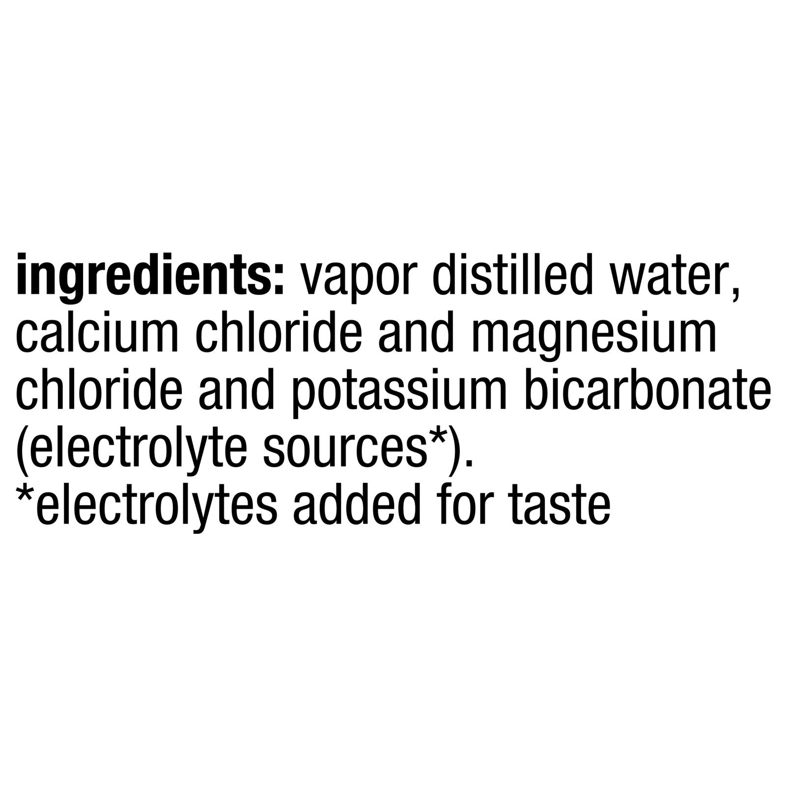 Ingredients:Vapor distilled water, calcium chloride and magnesium chloride and potassium bicarbonate (electrolyte sources*) *electrolytes added for taste