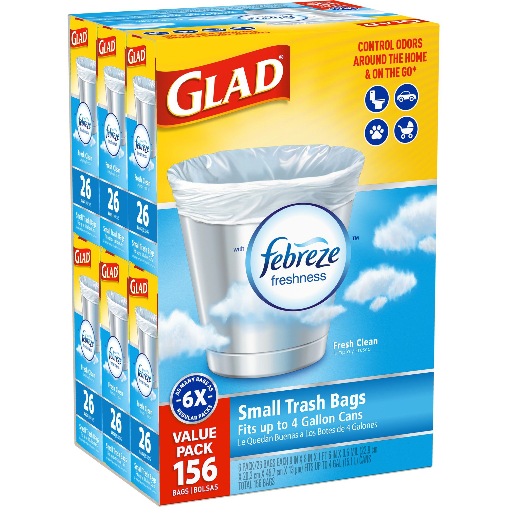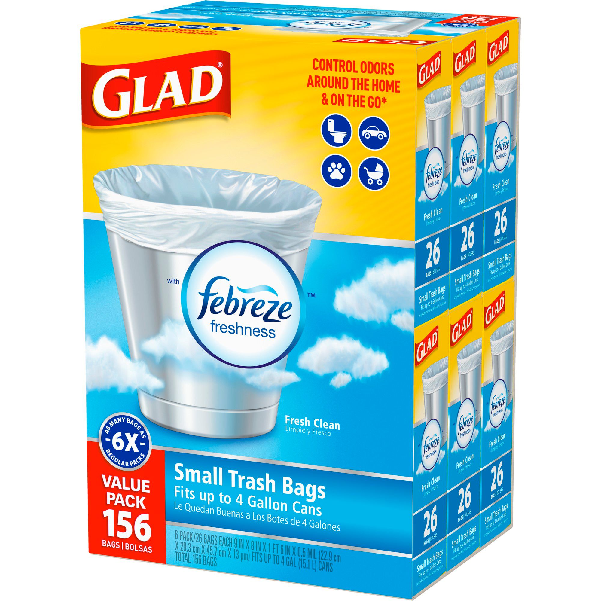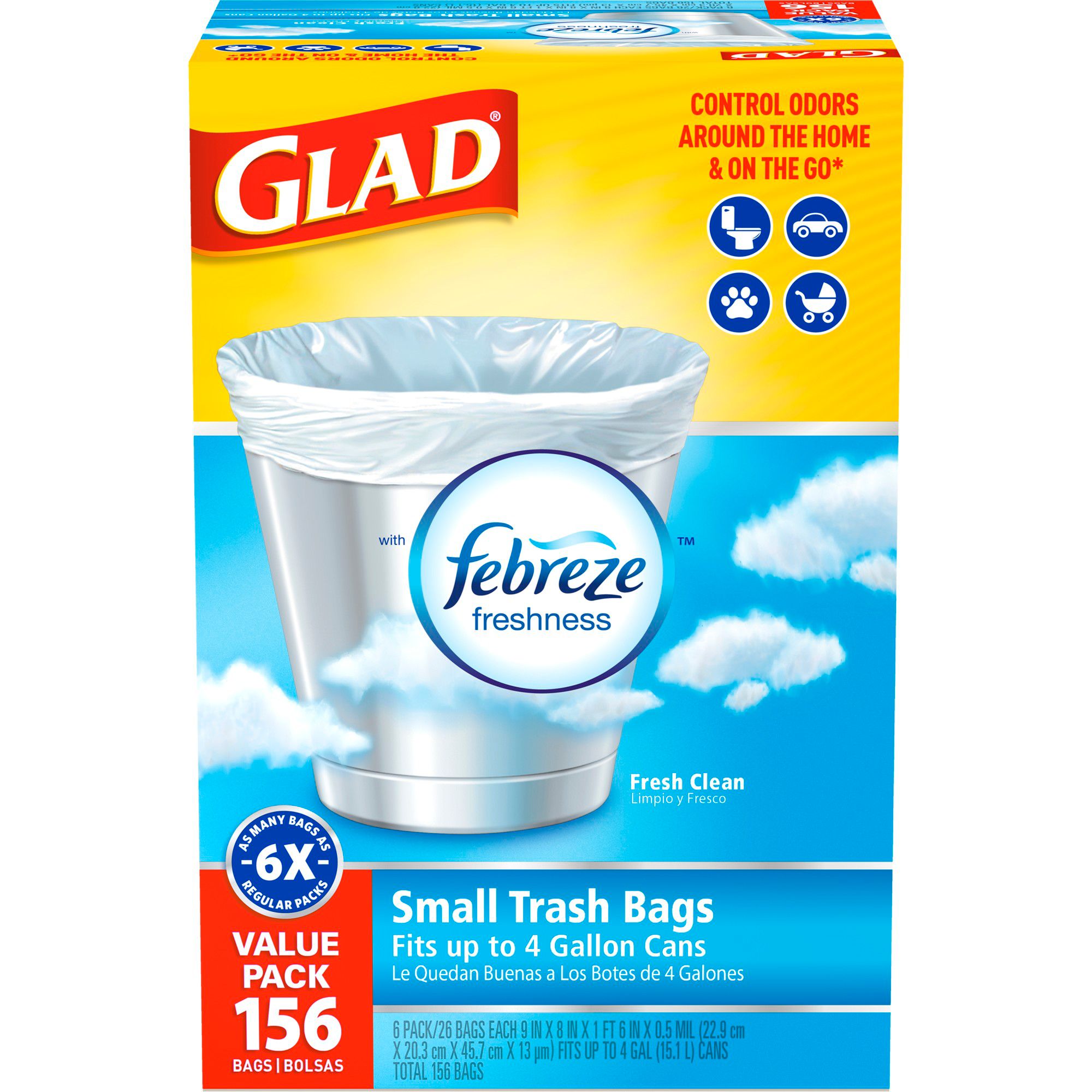 Glad 4-Gal. Small Trash Bags are the perfect solution for small wastebaskets, general household needs, cars and on-the-go travel. OdorShield technology provides guaranteed protection against the strongest trash odors and infuses any space with a clean, refreshing scent. Meanwhile, thicker plastic bottoms guard against leaks and convenient quick-tie closures enable you to secure and carry the bags for no-mess handling and disposal.