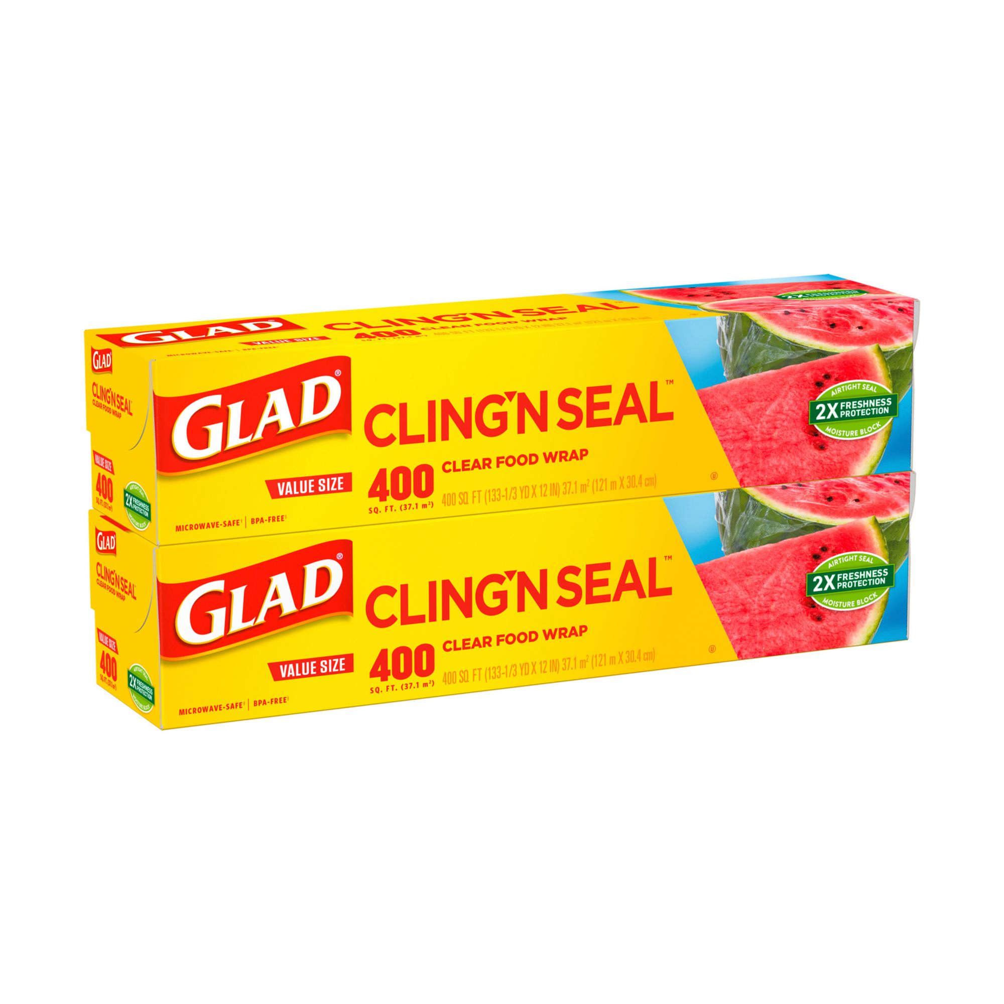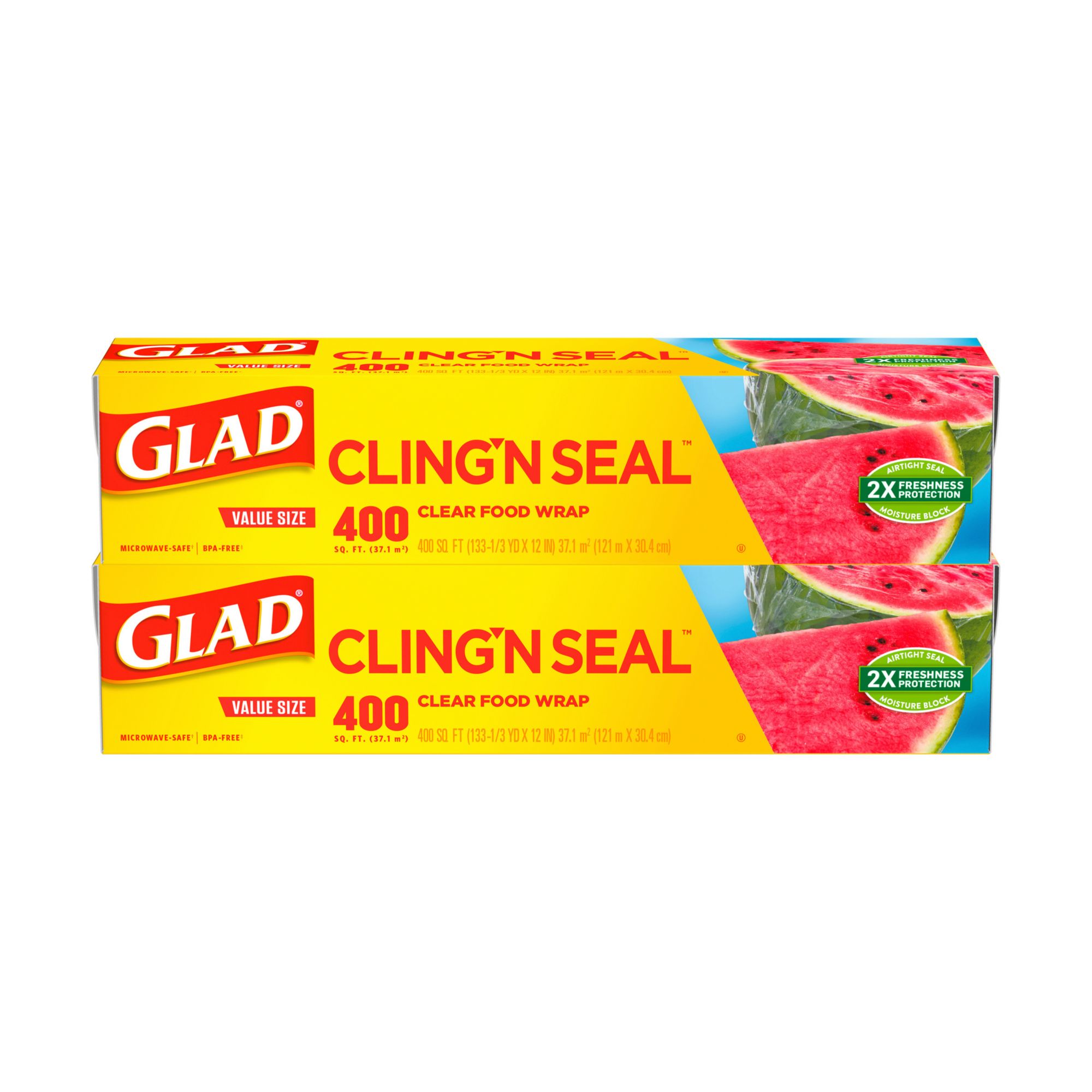 Glad Cling ‘N Seal Wrap: Extend foods' freshness with 2X Freshness Protection with an airtight seal and moisture block technology; Packaging may vary Plastic Food Wrap: Clings to multiple surfaces including glass, metal and wood to keep leftovers fresh and prevent unwanted odors Cling Tight without a Fight: Grips tight, seals easy and is an ideal clinging wrap for steaming, protecting and reheating food with superior cling technology Microwave Safe: Made without BPA and stretches to fit a variety of foods Multipurpose Use: Designed for a busy kitchen but doubles as a household staple for wrapping and storing everyday items with a superior, easy to use cling for all ages Includes Glad Cling ‘N Seal Plastic Food Wrap, 2 pk./400 Sq. Ft. Roll