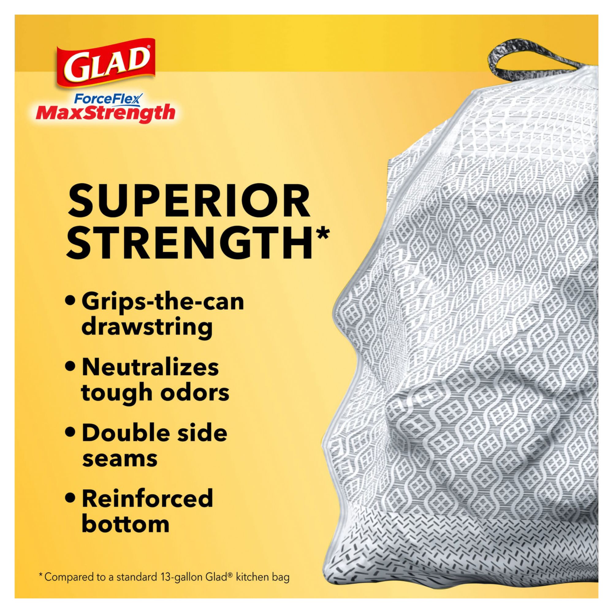 2X REINFORCED TOP**: The 2X reinforced top** helps prevent rips and tears at the top of the bag when you pull it out of the trash can and carry it out 25% MORE DURABLE*: Glad ForceFlex MaxStrength Tall Kitchen Trash Bags are 25% more durable versus Glad 13 gallon ForceFlex tall kitchen bags; packaging may vary FORCEFLEX MAXSTRENGTH: These bags feature double side seams and grips the can drawstring plus LeakGuard plus RipGuard provide protection against leaks, rips and tears NEUTRALIZES TOUGH TRASH ODORS: OdorShield technology and Gain with Febreze freshness work to trap odors and help control garbage smells in your kitchen MADE WITH 100% RENEWABLE ELECTRICITY***: For bags manufactured in our US plants; all electrical energy offset by virtual power purchase agreements and purchased renewable energy certificates (RECs) Includes 120 trash bags
