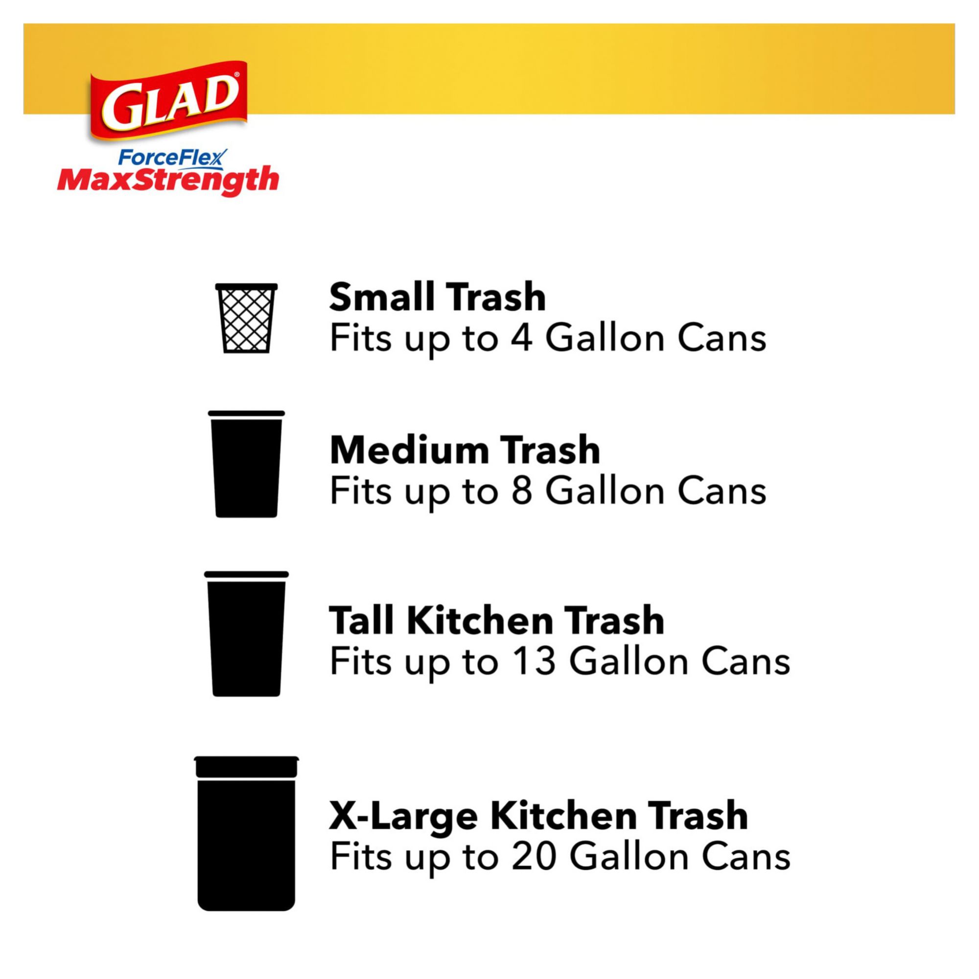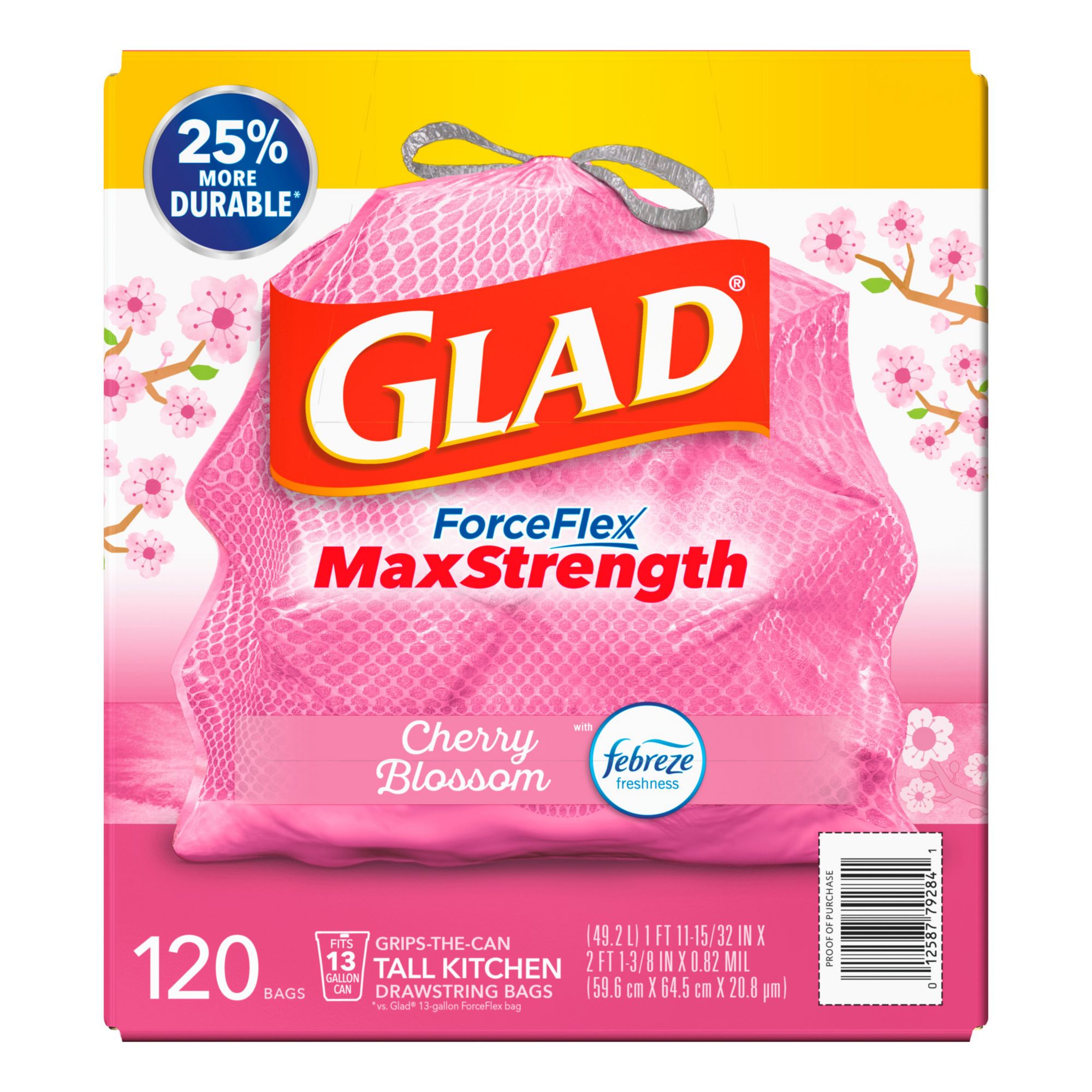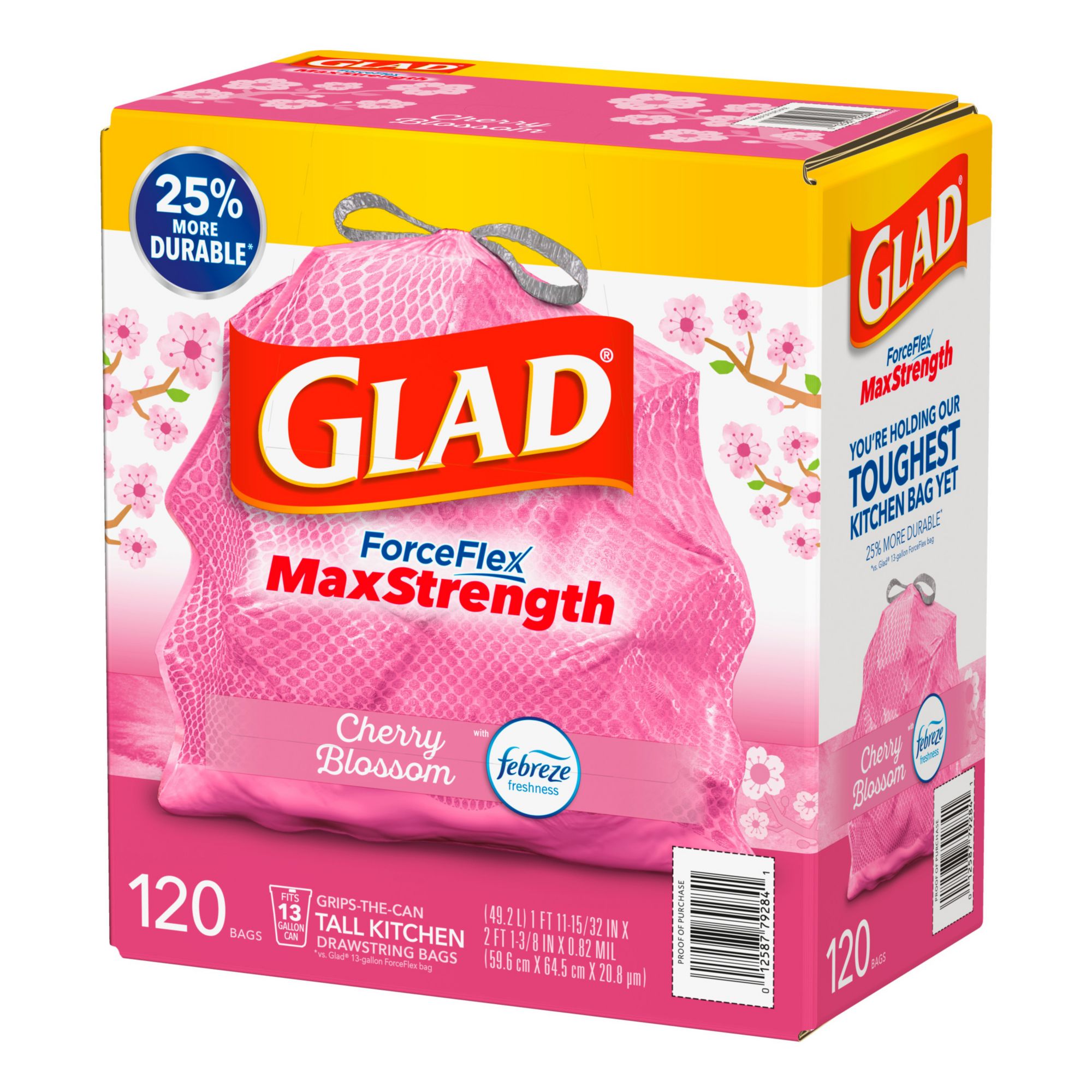 25% More Durable*: Glad ForceFlex MaxStrength Tall Kitchen Trash Bags are 25% more durable versus Glad 13 gallon ForceFlex tall kitchen bags; packaging may vary ForceFlex MaxStrength: These bags feature double side seams, a reinforced bottom and grips the can drawstring plus leak and rip protection against leaks, rips and tears Neutralizes Tough Trash Odors: Febreze freshness in a delightful Cherry Blossom scent works to trap odors and help eliminate garbage smells in the kitchen Products with Less Plastic: Glad ForceFlex MaxStrength Tall Kitchen Trash Bags are made with less plastic than the competition** without sacrificing strength Doing More to Waste Less: If everyone in the U.S. chose Glad drawstring trash bags it would save 100 million lbs. of plastic from going into landfills every year** Includes Glad ForceFlex MaxStrength Tall Trash Bags, Cherry Blossom with Febreze Freshness, 120 ct./13 gal.