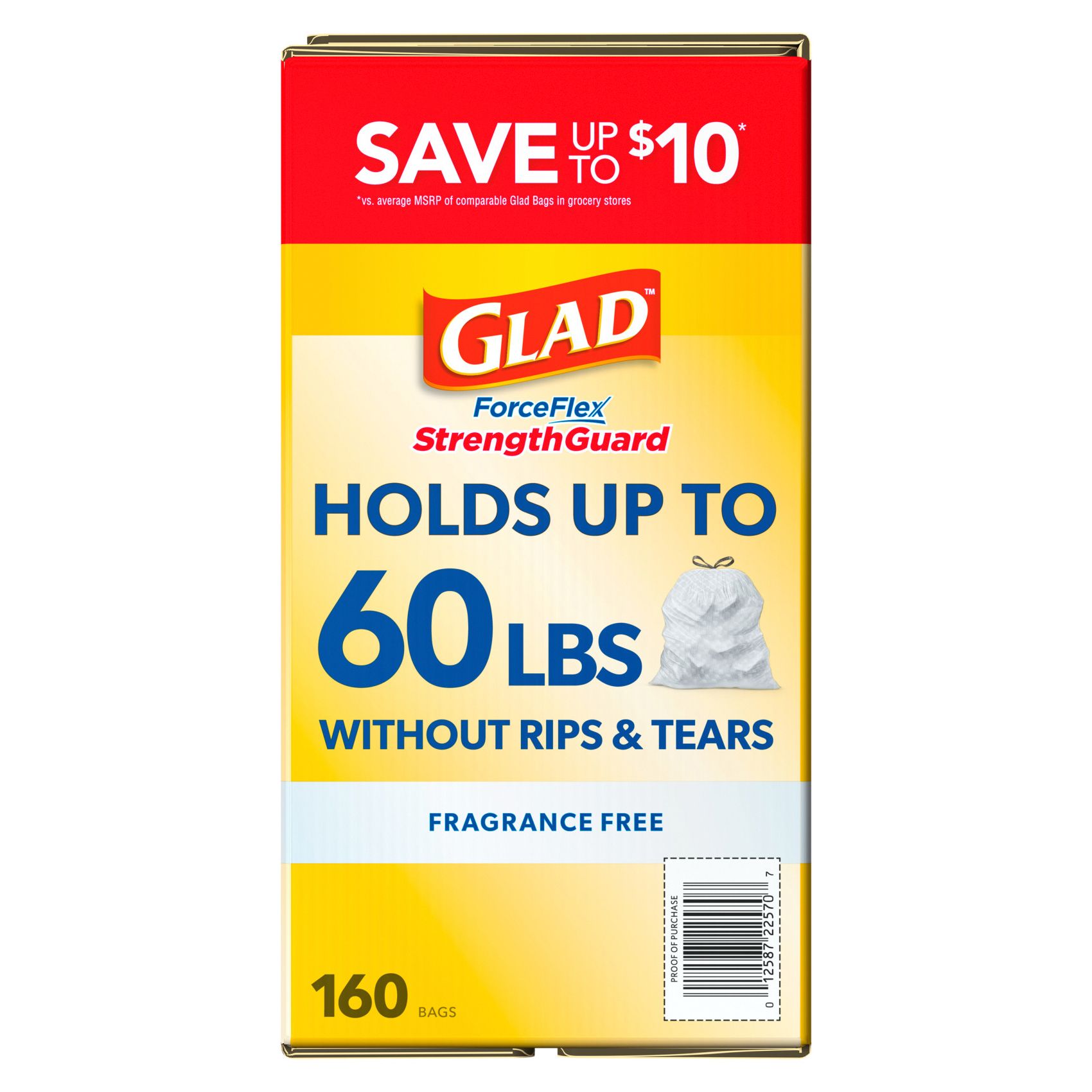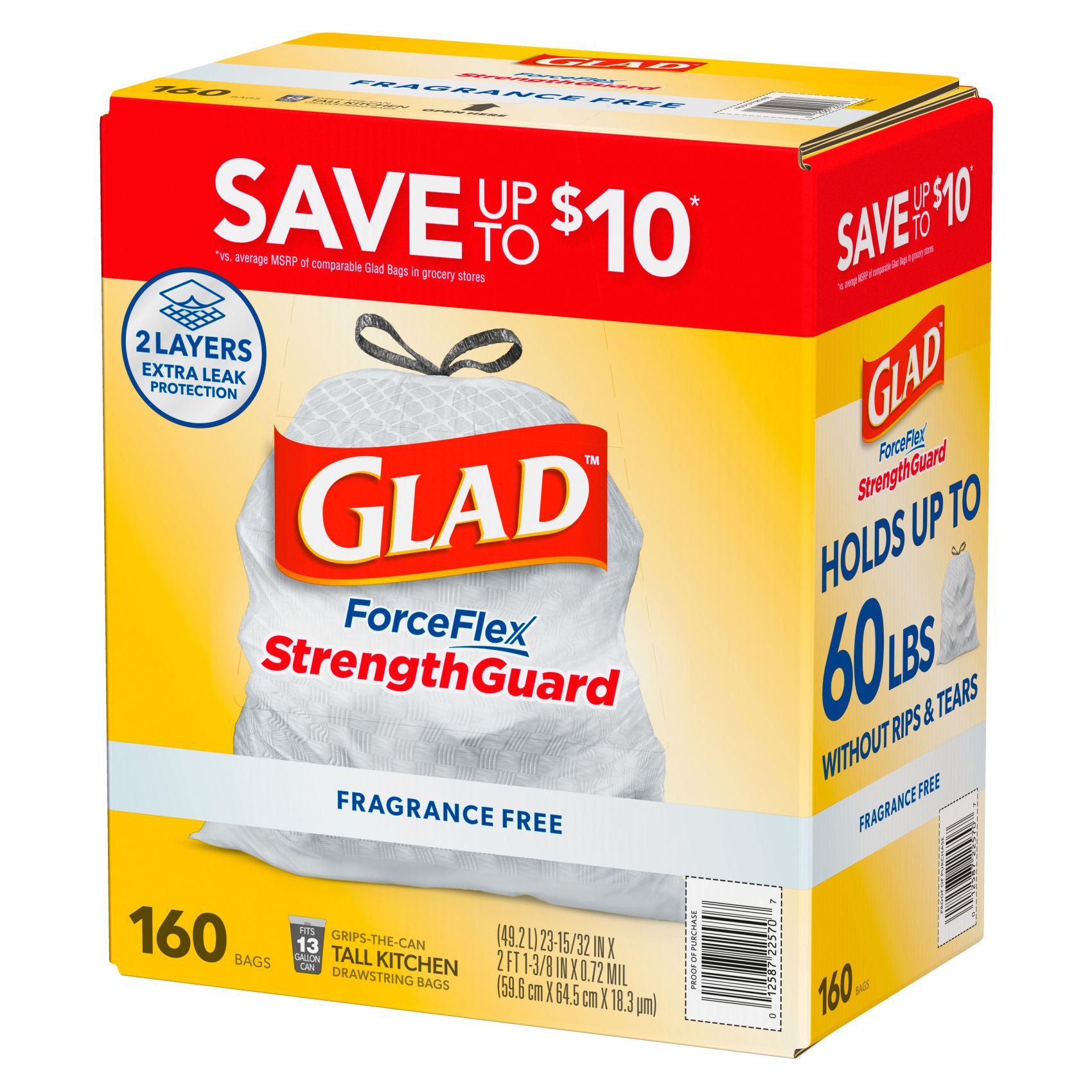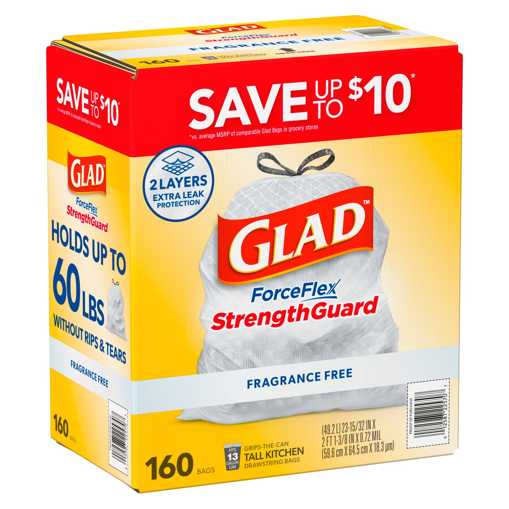 FORCEFLEX STRENGTH: Glad’s trusted ForceFlex technology allows the bag to stretch and expand over heavy loads with sharp edges, delivering durable strength; packaging may vary 2 LAYERS EXTRA LEAK PROTECTION: These kitchen trash bags are designed to uniquely trap liquids and prevent leaks and are strong enough to handle the heaviest loads STRENGTHGUARD: Trust Glad garbage bags for all your trash jobs around the house thanks to StrengthGuard that holds up to 60 pounds without rips and tears FRAGRANCE FREE TRASH BAGS: These Glad ForceFlex StrengthGuard Tall Kitchen Drawstring Trash Bags are made with no added fragrances, ideal for people with sensitivities to harsh smells GRIPS THE CAN DRAWSTRING: The 3-ply drawstring design grips the can so the bag stays in place, and makes it easy to close and carry out the trash with no fear of leaks and tears Includes 160 bags