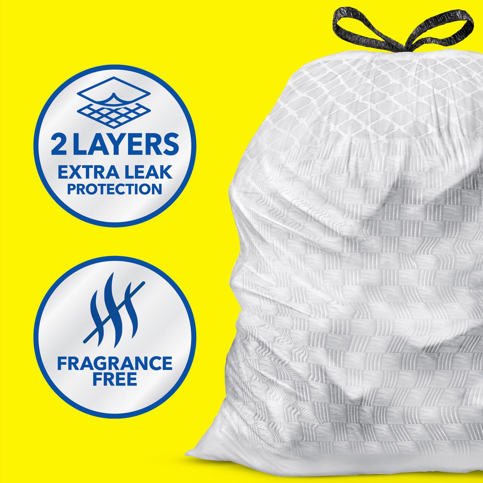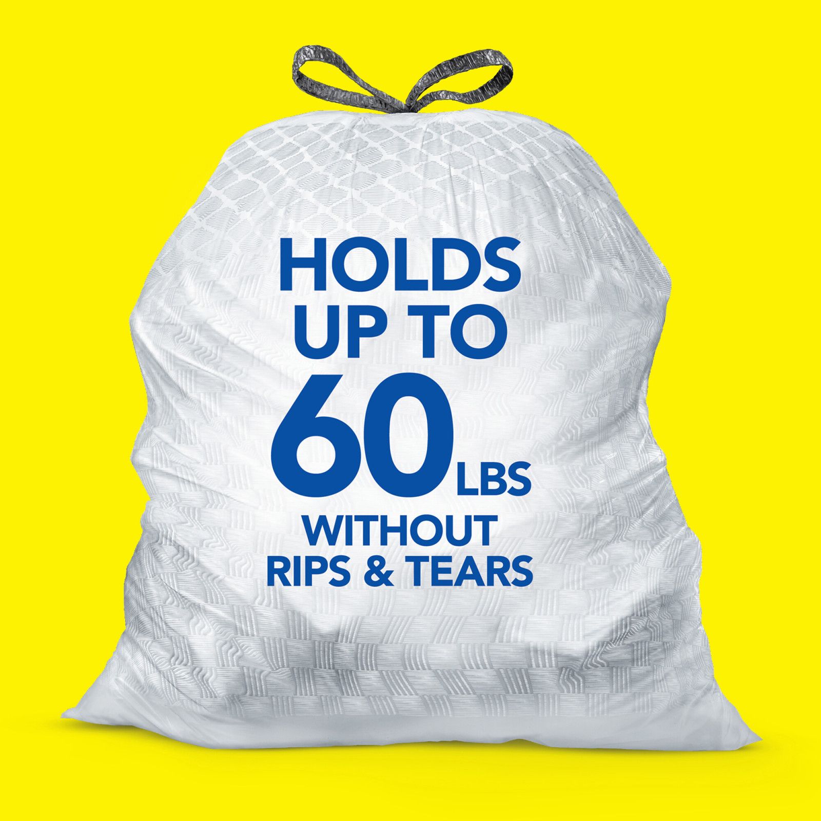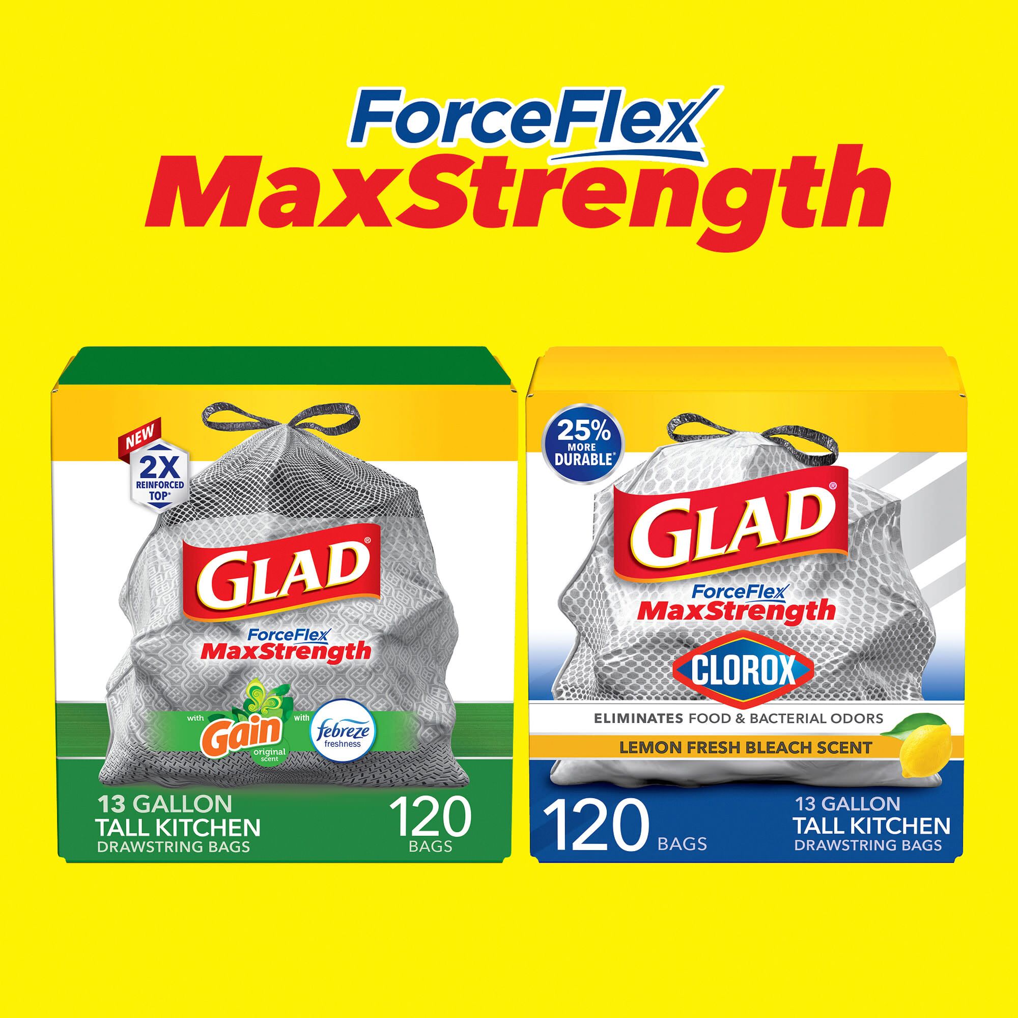 FORCEFLEX STRENGTH: Glad’s trusted ForceFlex technology allows the bag to stretch and expand over heavy loads with sharp edges, delivering durable strength; packaging may vary 2 LAYERS EXTRA LEAK PROTECTION: These kitchen trash bags are designed to uniquely trap liquids and prevent leaks and are strong enough to handle the heaviest loads STRENGTHGUARD: Trust Glad garbage bags for all your trash jobs around the house thanks to StrengthGuard that holds up to 60 pounds without rips and tears FRAGRANCE FREE TRASH BAGS: These Glad ForceFlex StrengthGuard Tall Kitchen Drawstring Trash Bags are made with no added fragrances, ideal for people with sensitivities to harsh smells GRIPS THE CAN DRAWSTRING: The 3-ply drawstring design grips the can so the bag stays in place, and makes it easy to close and carry out the trash with no fear of leaks and tears Includes 160 bags