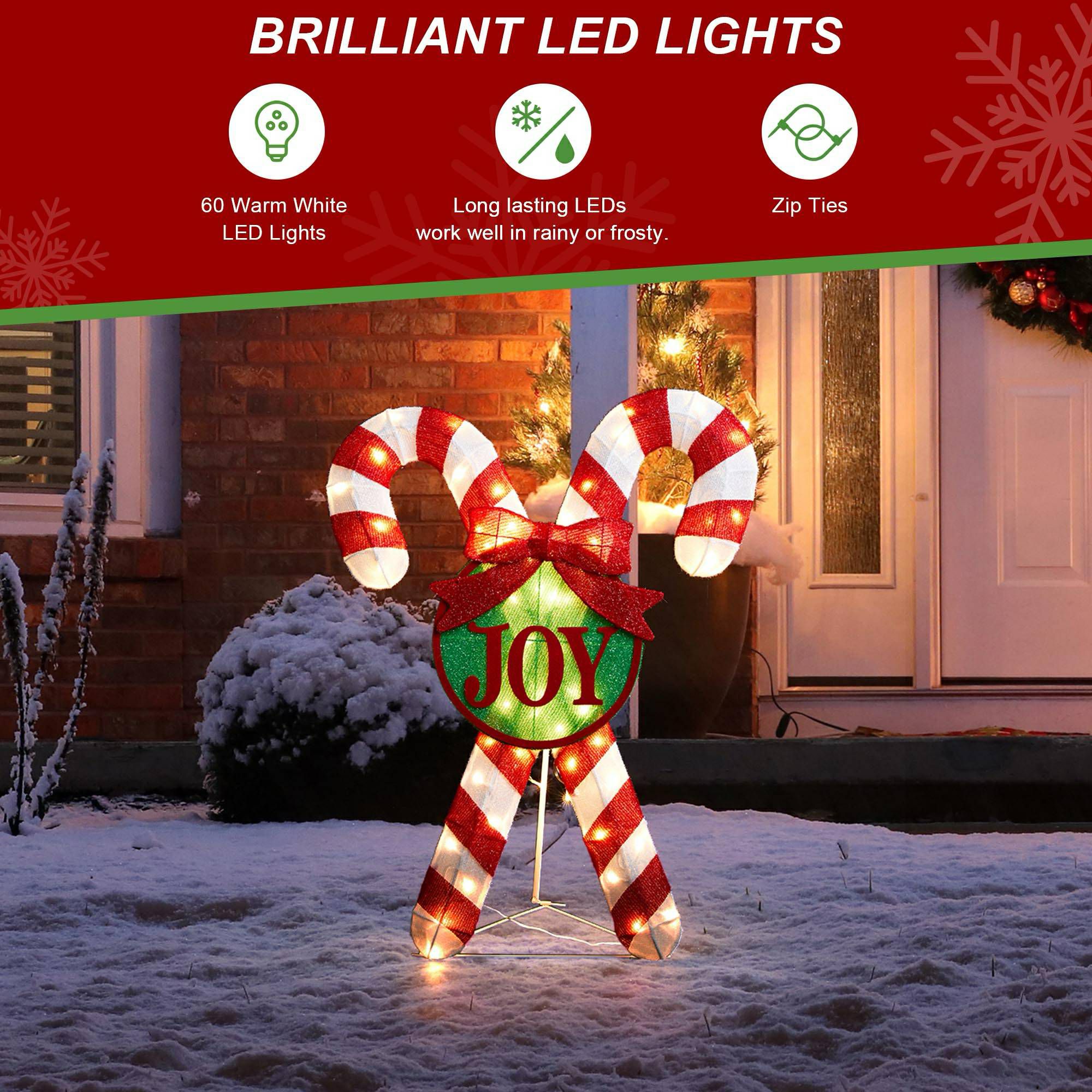 Make this Christmas season unforgettable with our Lighted 3D Candy Cane with "Joy" Sign. Combining unique design, premium materials, and ease of use, it’s the perfect addition to your holiday decorations. Order now and spread the holiday cheer with this vibrant and joyful decoration! The 3D stacked Christmas ornament with White/green/red lights to creat a joyful and vibrant holiday atmosphere. The unique design creates a warm and festive atmosphere, perfect for welcoming guests or simply spreading holiday cheer.