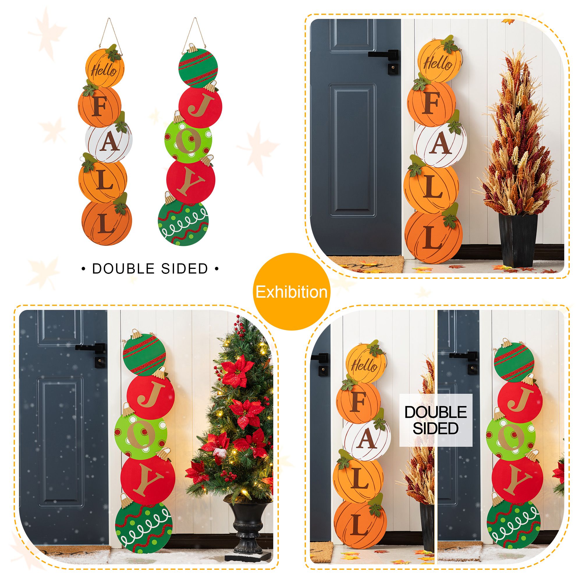 Double-sided seasonal design - Features a charming Fall pumpkin scene on one side and a festive Joy Christmas ornament design on the reverse. One sign effortlessly transitions between two major holidays