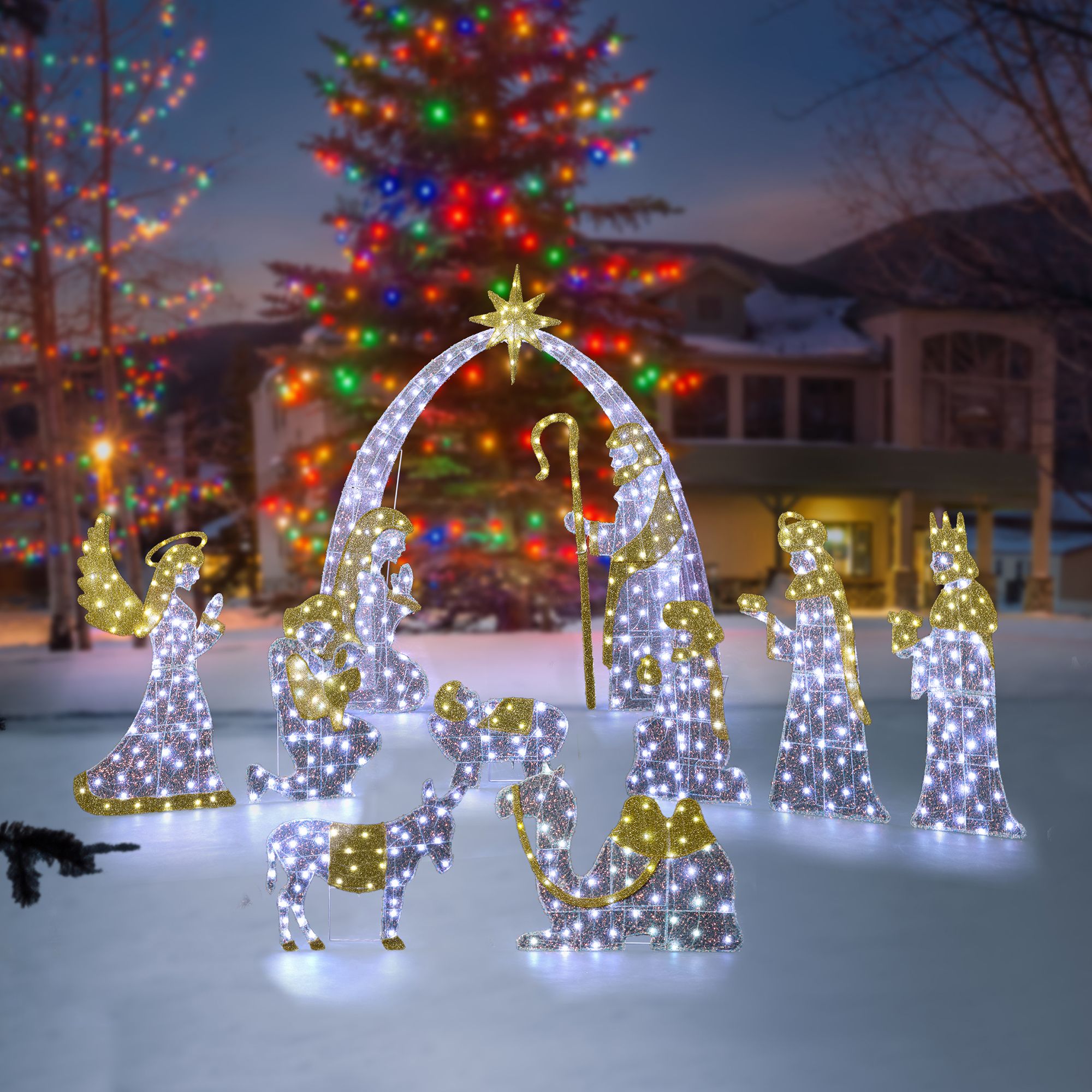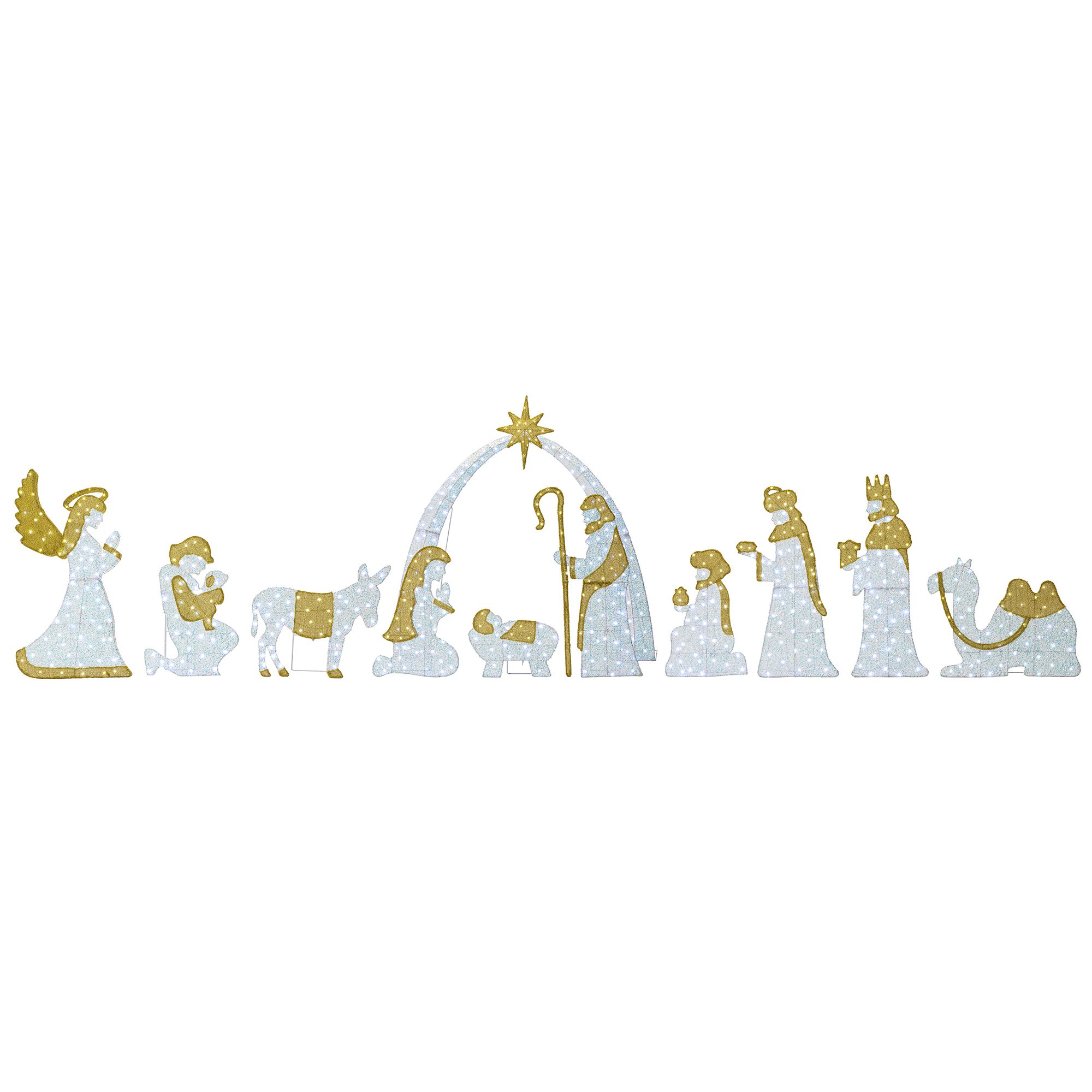 【11-Piece Lighted Nativity Scene】This comprehensive set features 11 iridescent fabric figures with 590 LEDs, creating a complete and dazzling outdoor nativity display.