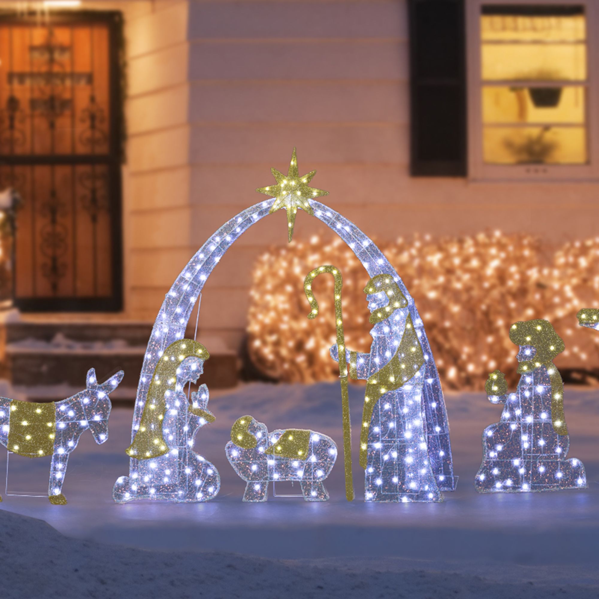 【Vibrant Indoor/Outdoor Holiday Centerpiece】Perfect for lawns, porches, or indoors, this shimmering nativity set serves as a captivating focal point for all Christmas decorations.