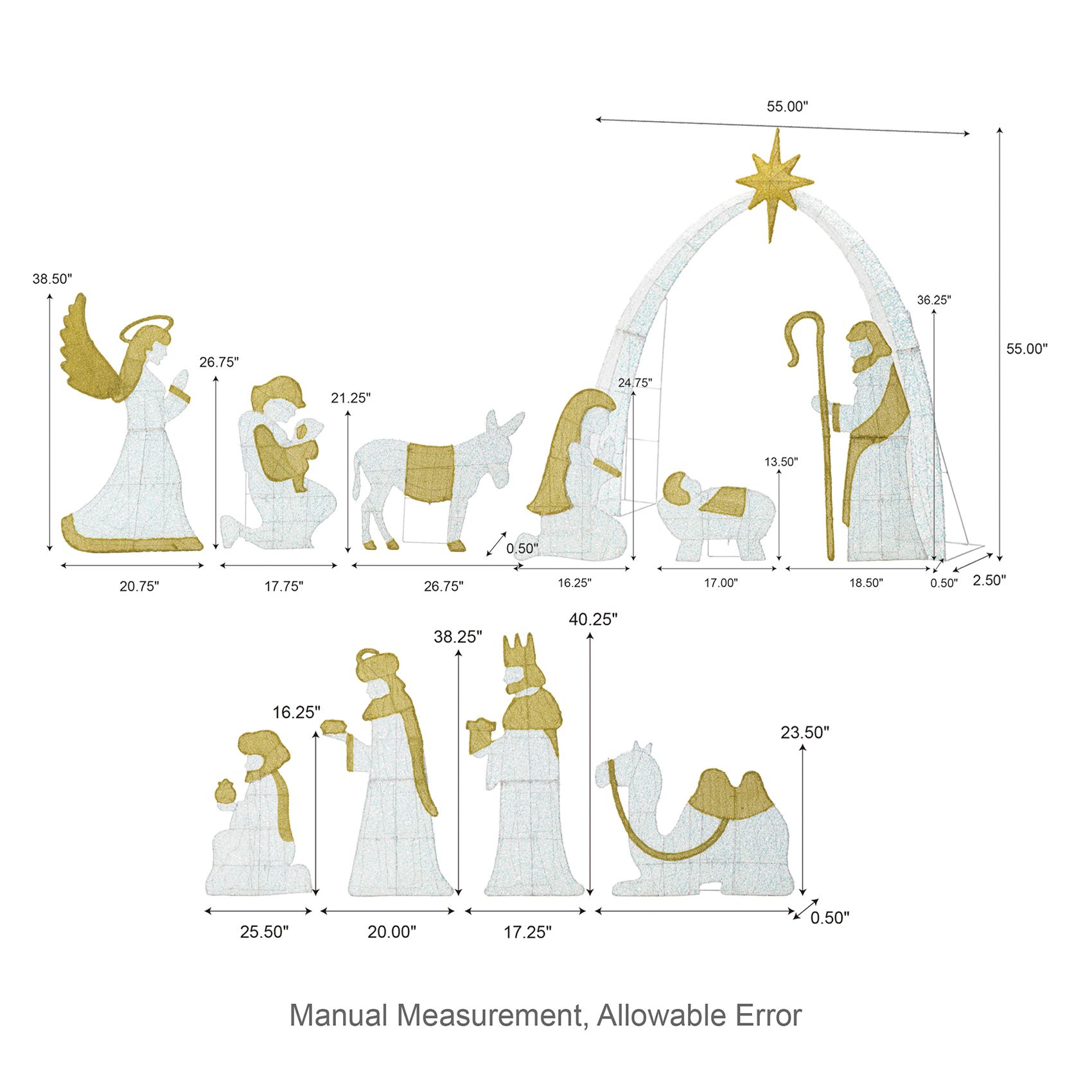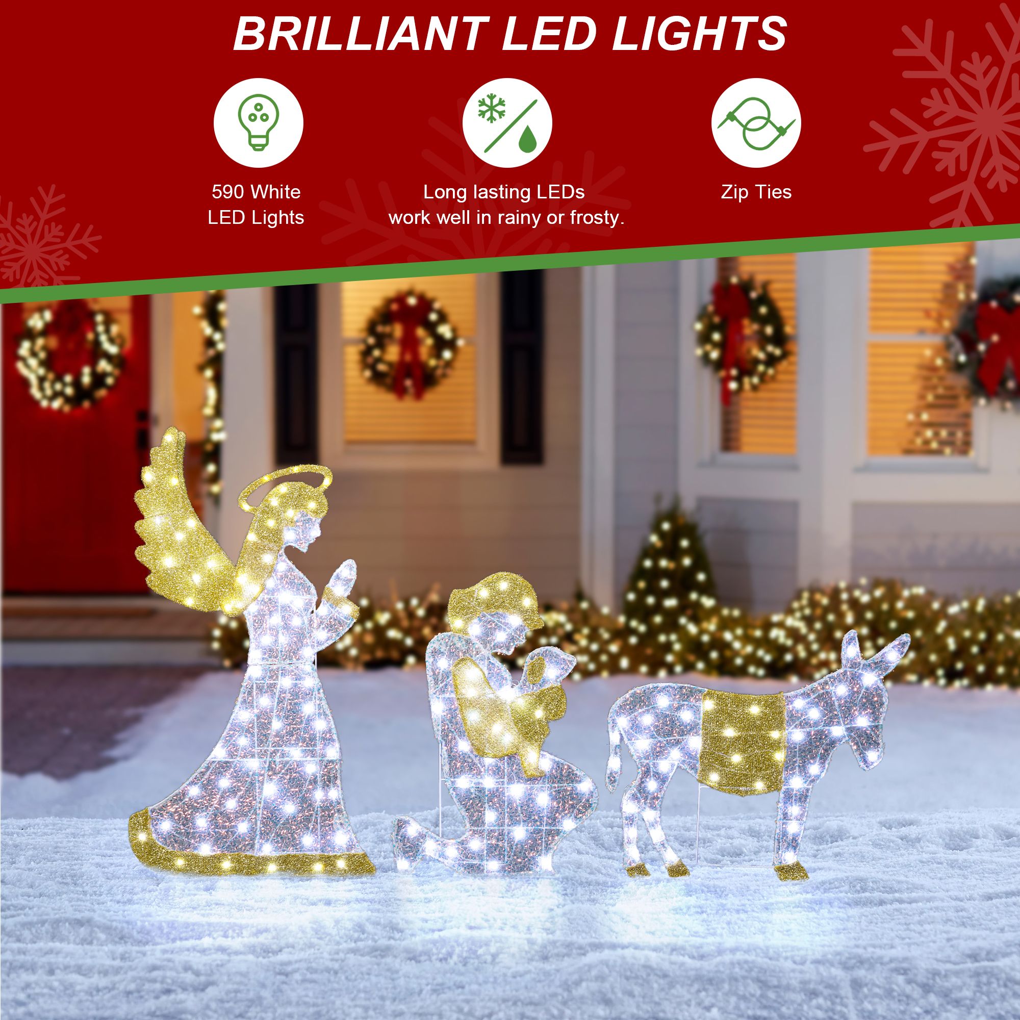 【Elegant White & Gold Lighted Display】Adorned with warm white and gold lights, the figures glow elegantly, making a spiritual and visual statement for your outdoor holiday decorations.