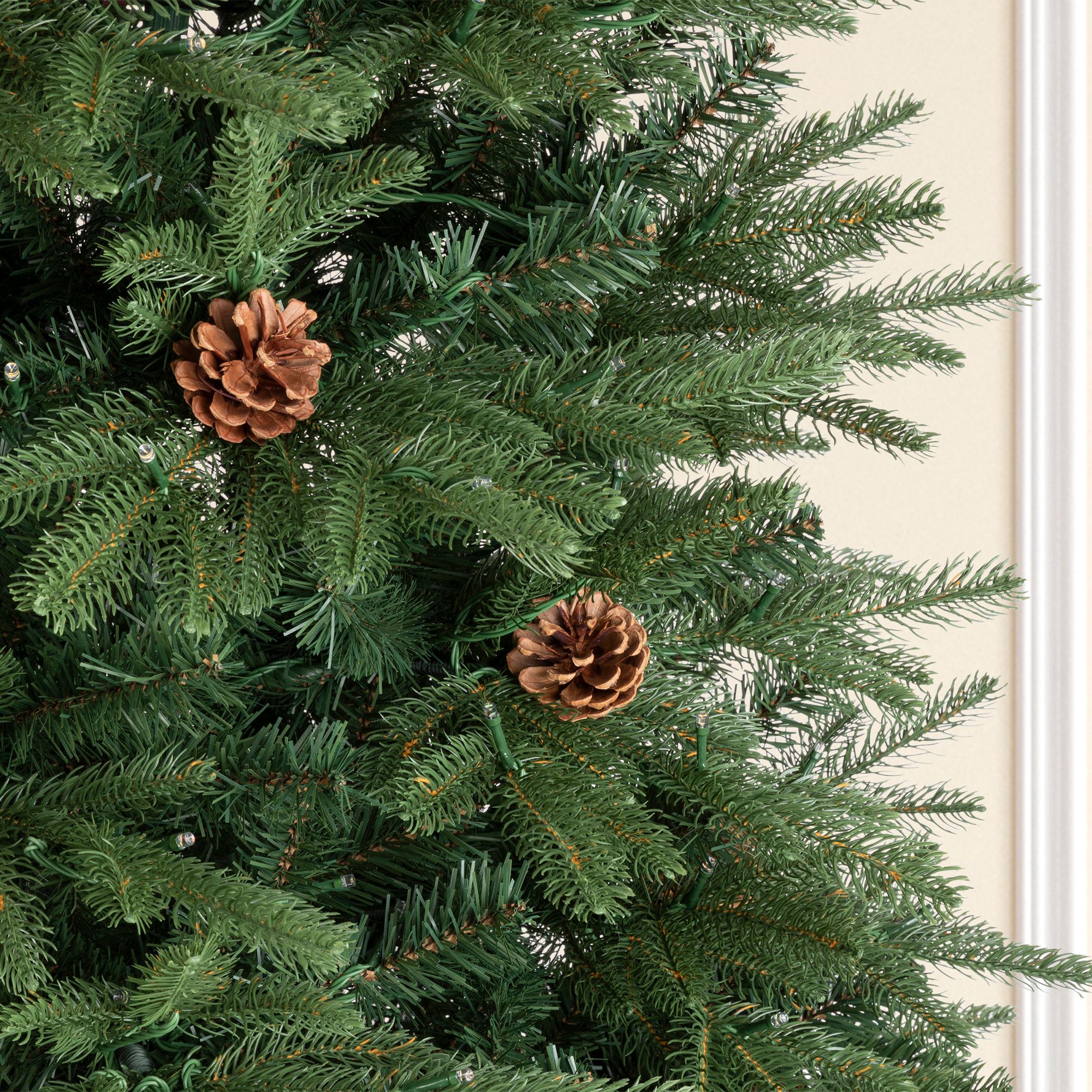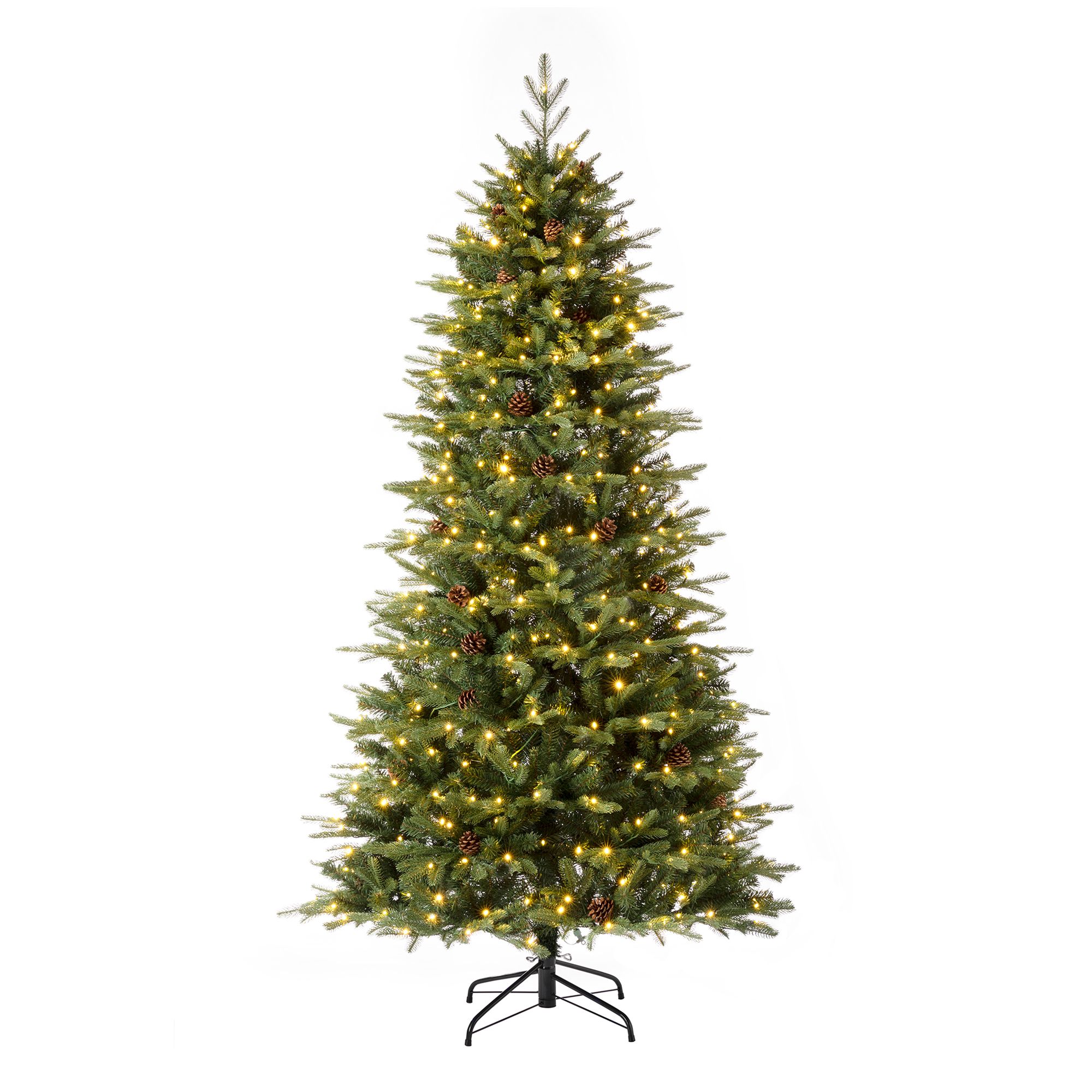 This elegant 7ft pre-lit artificial Christmas tree offers exceptional realism with 2542 PVC tips and 43 natural pinecones. Featuring 500 dual-color LEDs with 9 remote-controlled lighting modes, it creates perfect holiday ambiance. The space-saving slim design fits beautifully in any room while maintaining a full 45-inch diameter. With simple three-section hinged construction and clear labeling, assembly is quick and effortless. This tree brings professional-quality decoration to your home, making holiday preparations enjoyable for the entire family while creating lasting seasonal memories.