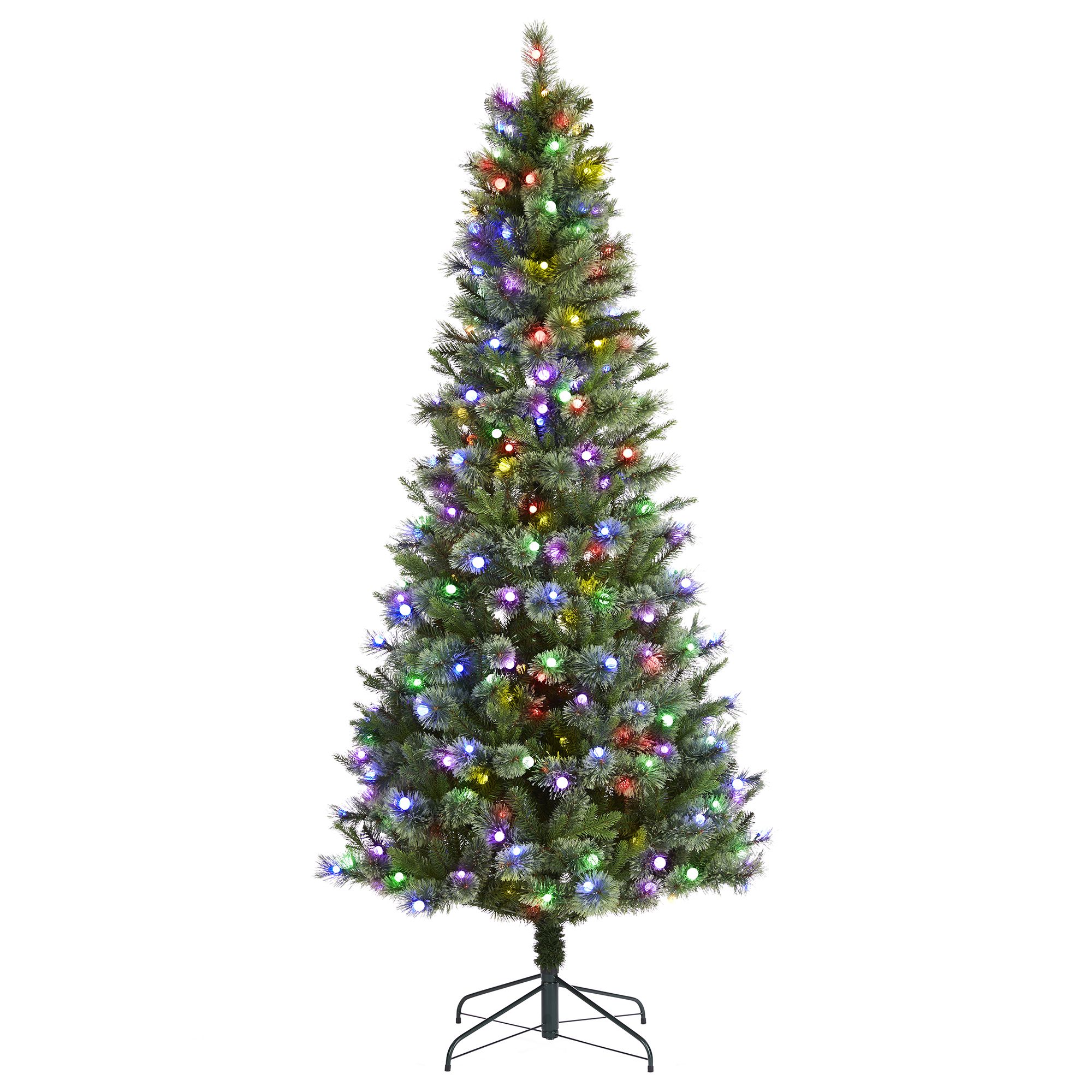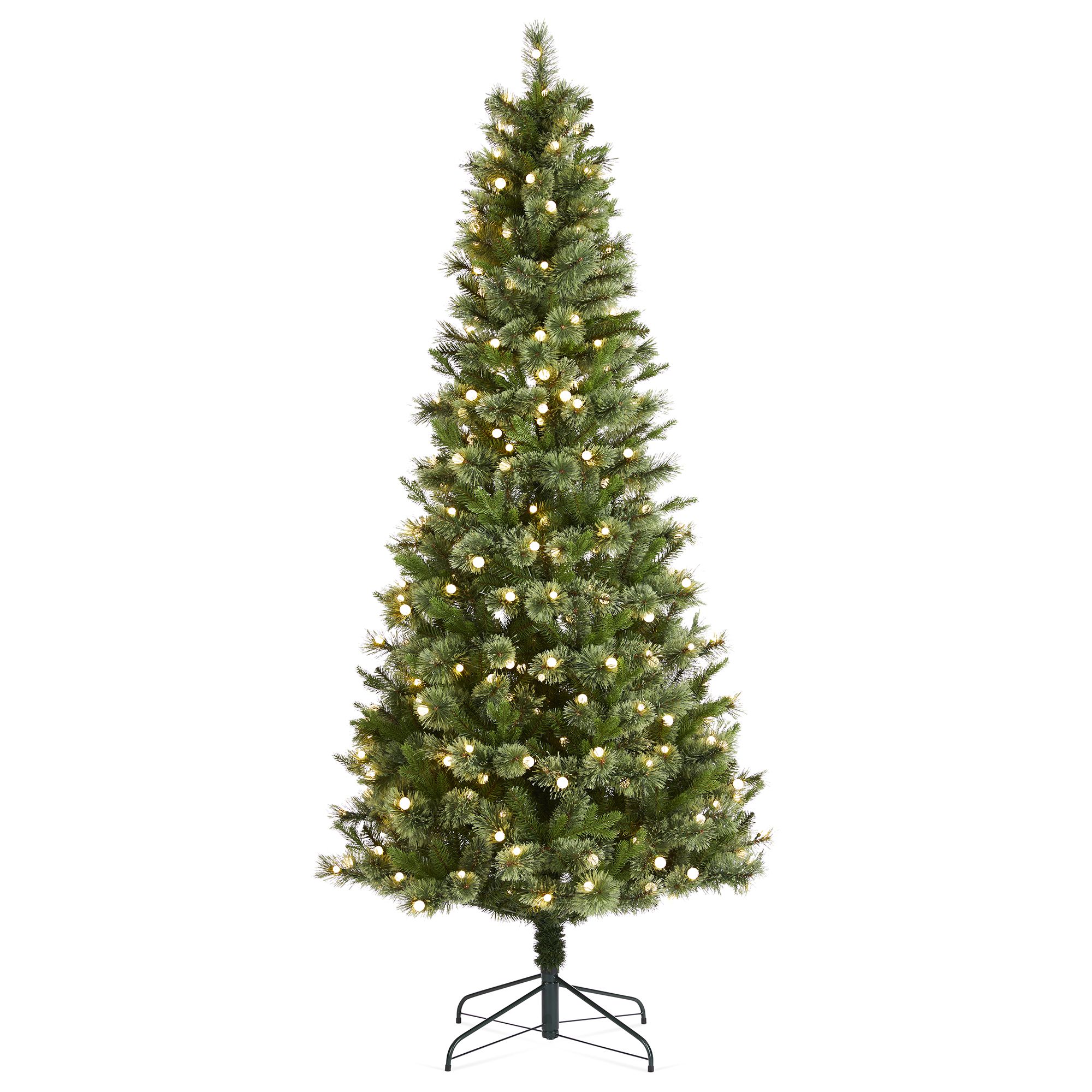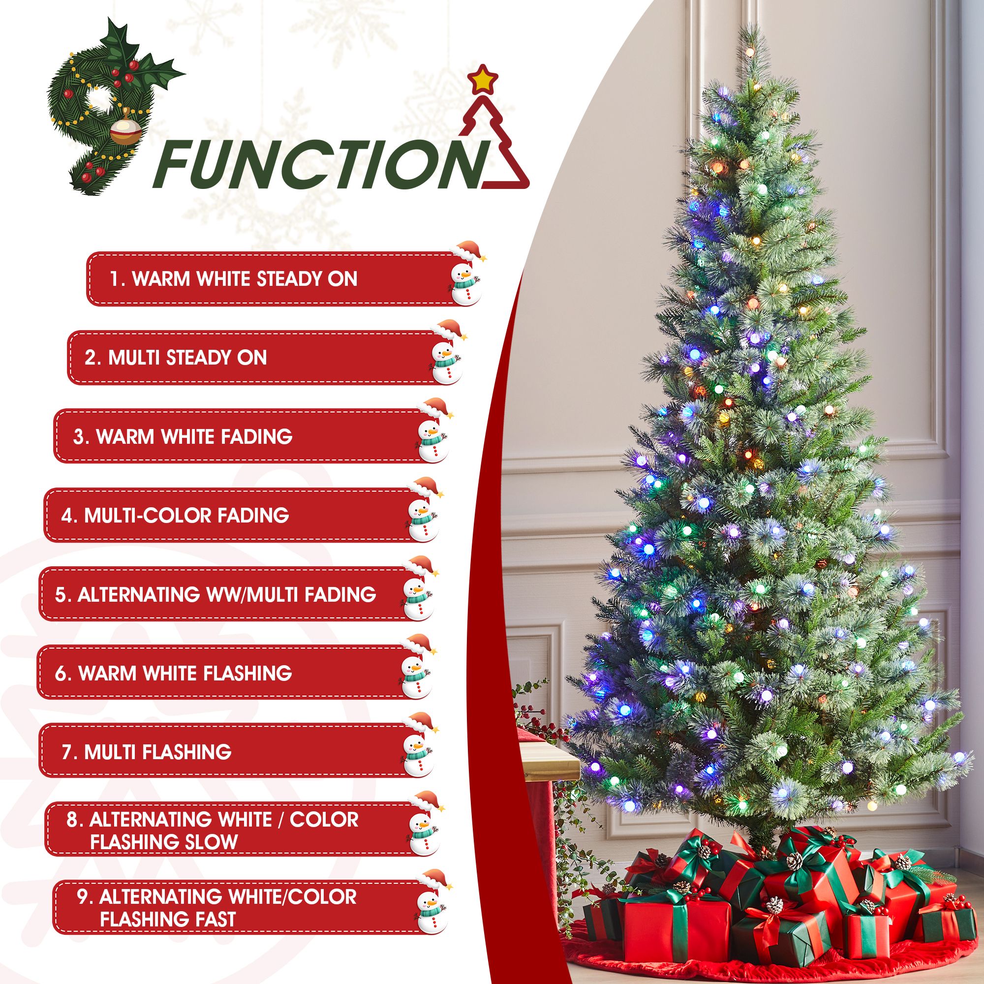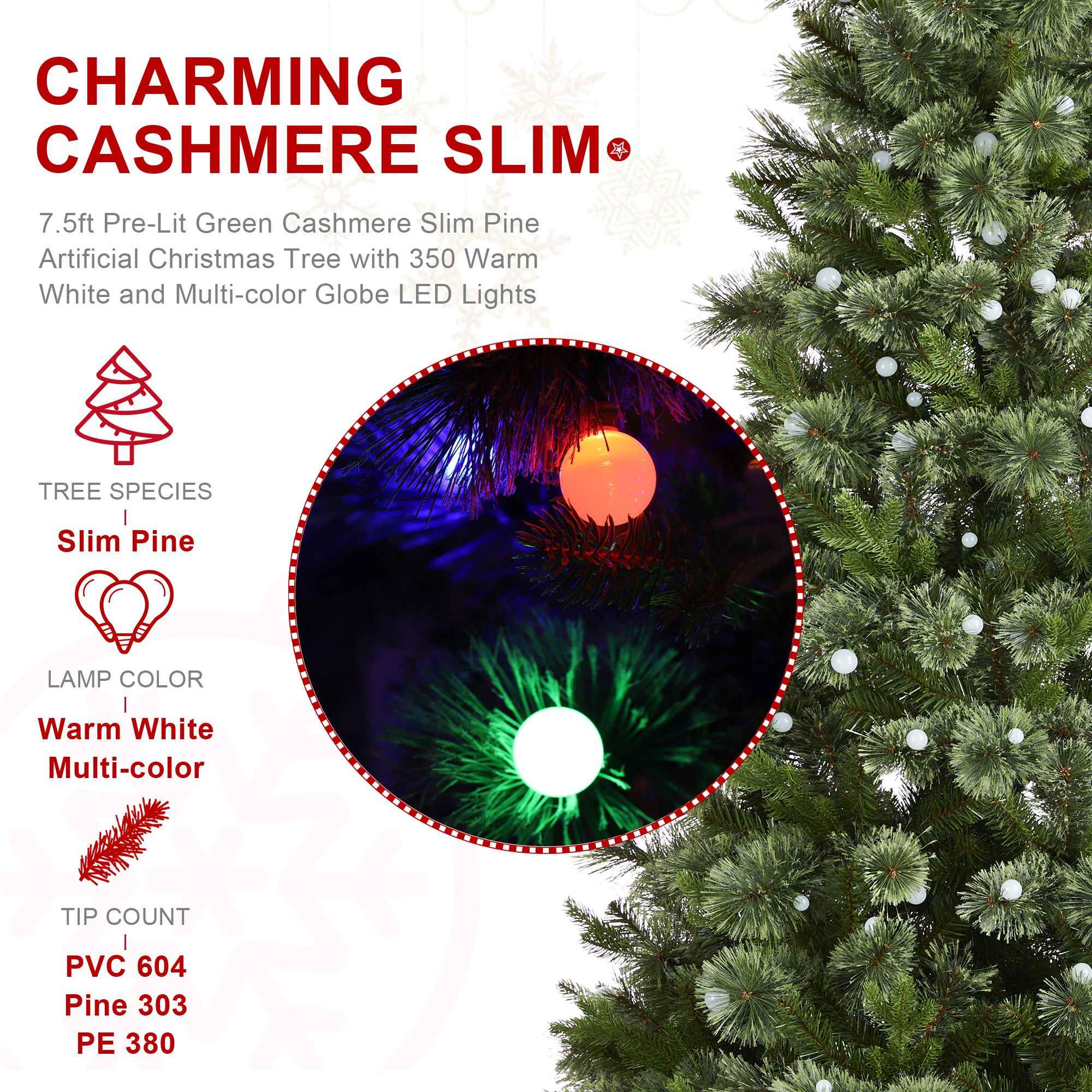 Experience the perfect blend of modern elegance and holiday charm with this 7.5ft pre-lit Cashmere Slim Pine tree. Adorned with 350 warm white and multi-color globe LED lights, it creates a uniquely soft and festive ambiance. The tree features nine lighting modes controlled by remote or foot pedal for effortless customization. With its hinged branches and color-coded setup system, assembly becomes quick and simple. Designed with lush mixed needles and a space-saving slim profile, it offers both visual appeal and practical functionality for creating memorable holiday moments in any living space.