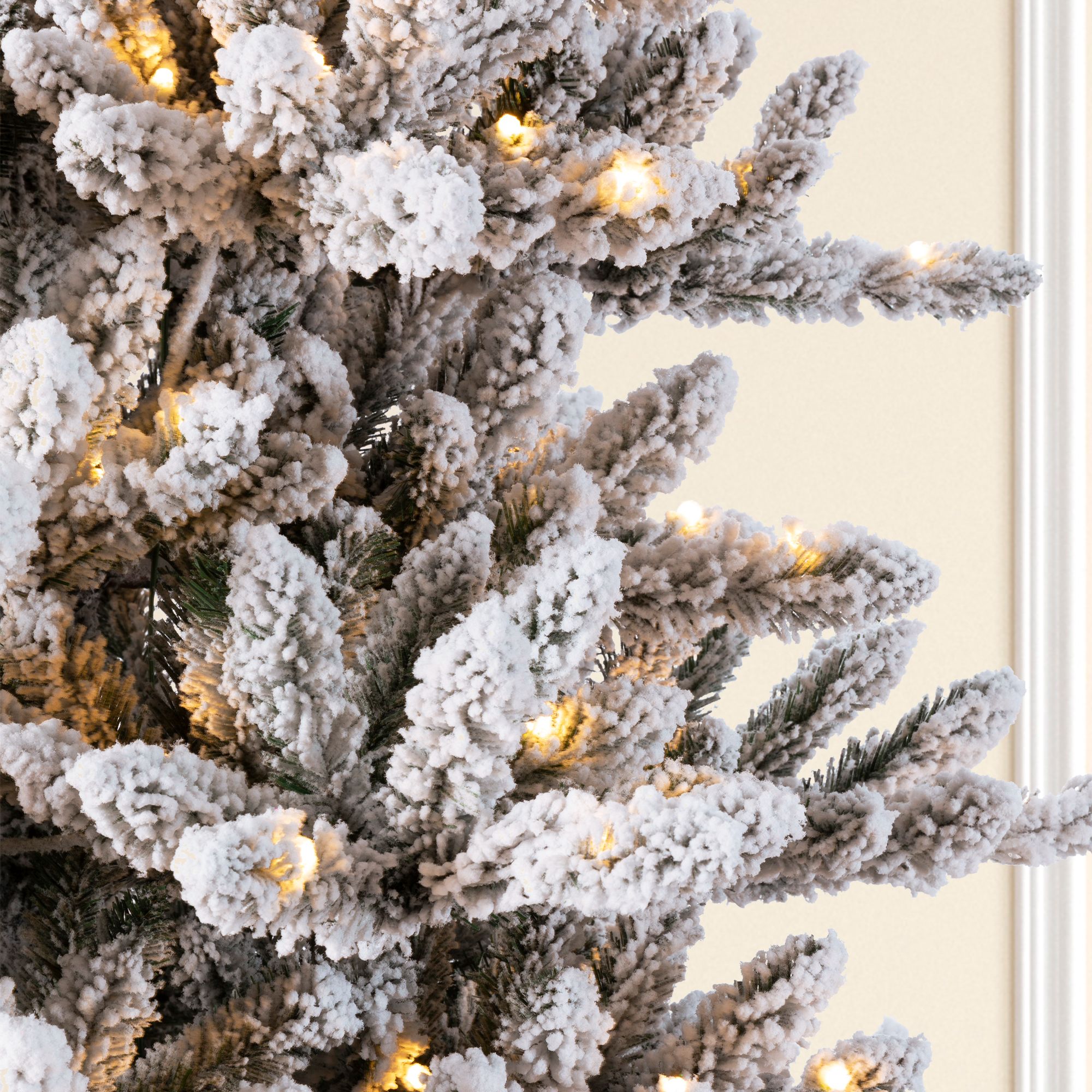 Create a winter wonderland in your home with this stunning 7.5' pre-lit snow flocked fir tree. Featuring 1336 realistic PVC tips and 400 warm white LED lights with three adjustable modes, this tree offers both exceptional beauty and convenience. The luxurious snow flocking with iridescent glitter creates a magical frosted effect, while the full 50" diameter provides ample space for all your ornaments. With simple three-section hinged construction and a sturdy metal stand, assembly is quick and effortless. This tree combines realistic appearance with practical design, making it the perfect centerpiece for your holiday celebrations that will be cherished for seasons to come