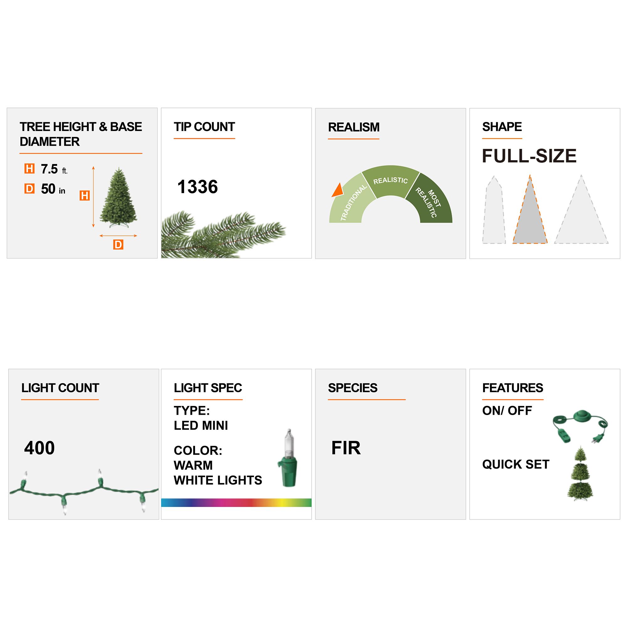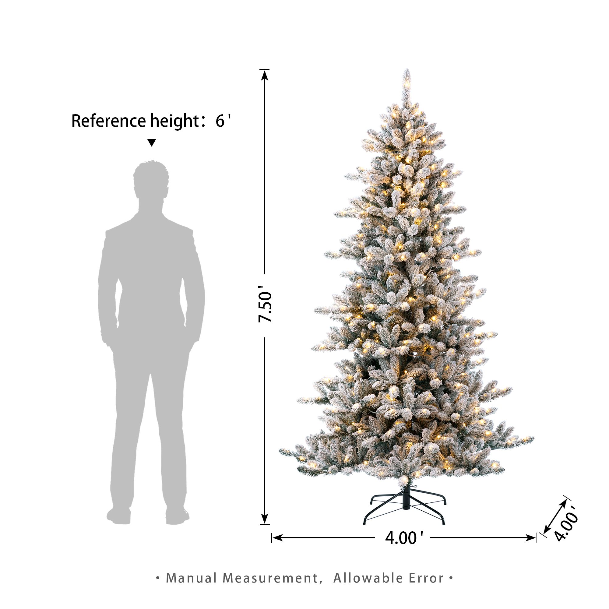 Ideal sizing - The artificial Christmas tree stands 7.5' tall and 50" in diameter at the base. Length of extension cord: 59 inch. Product may ship compressed -You can adjust all the branches with an elegant look like the images