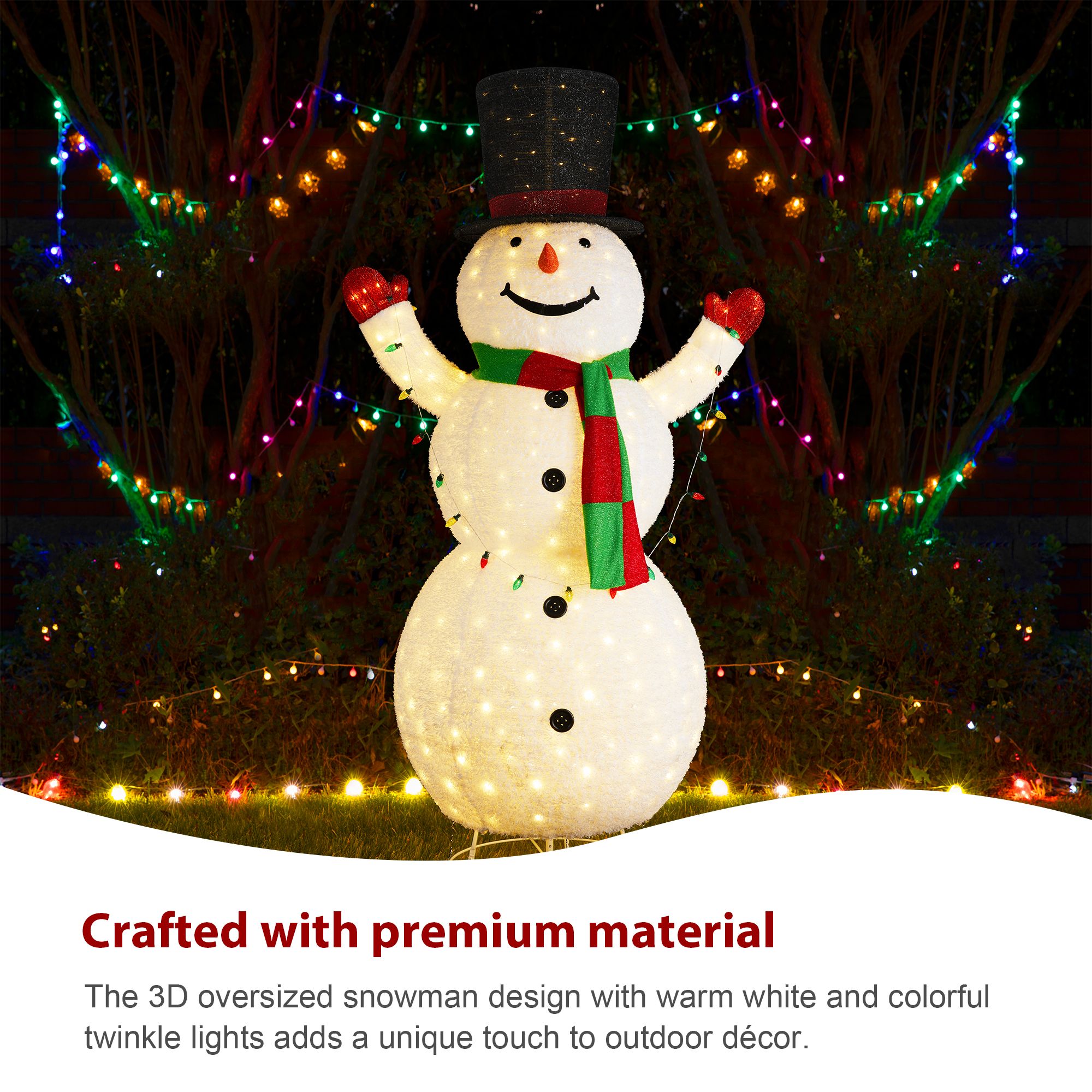 Impressive 8' 3D Snowman display - This oversized outdoor lighted snowman stands at 94.5" tall, creating a stunning focal point for your yard Christmas decorations with its lifelike fabric design