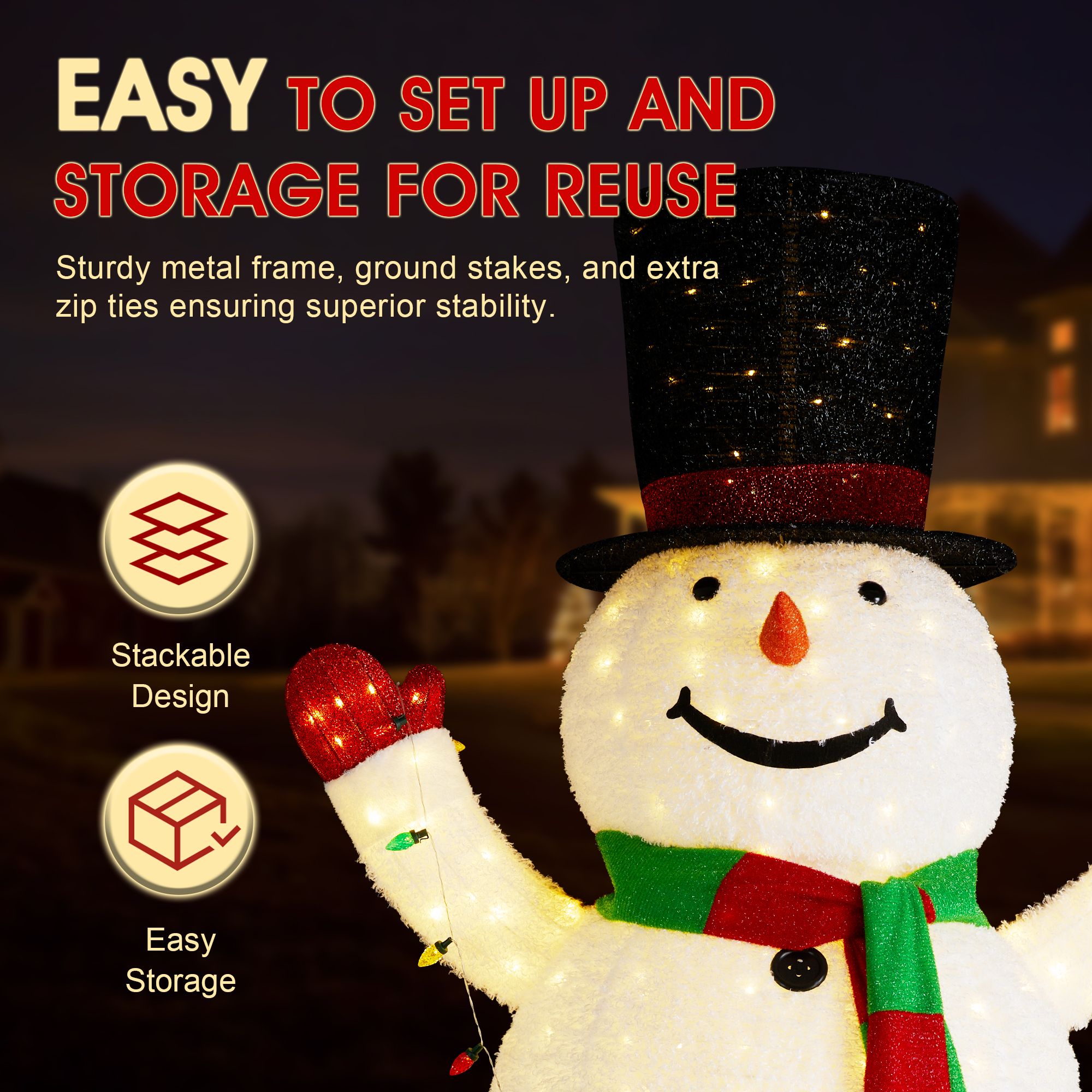 Quick foldable setup - The innovative pop up snowman design assembles in minutes and folds flat for compact storage - no tools required for these outdoor Christmas decorations
