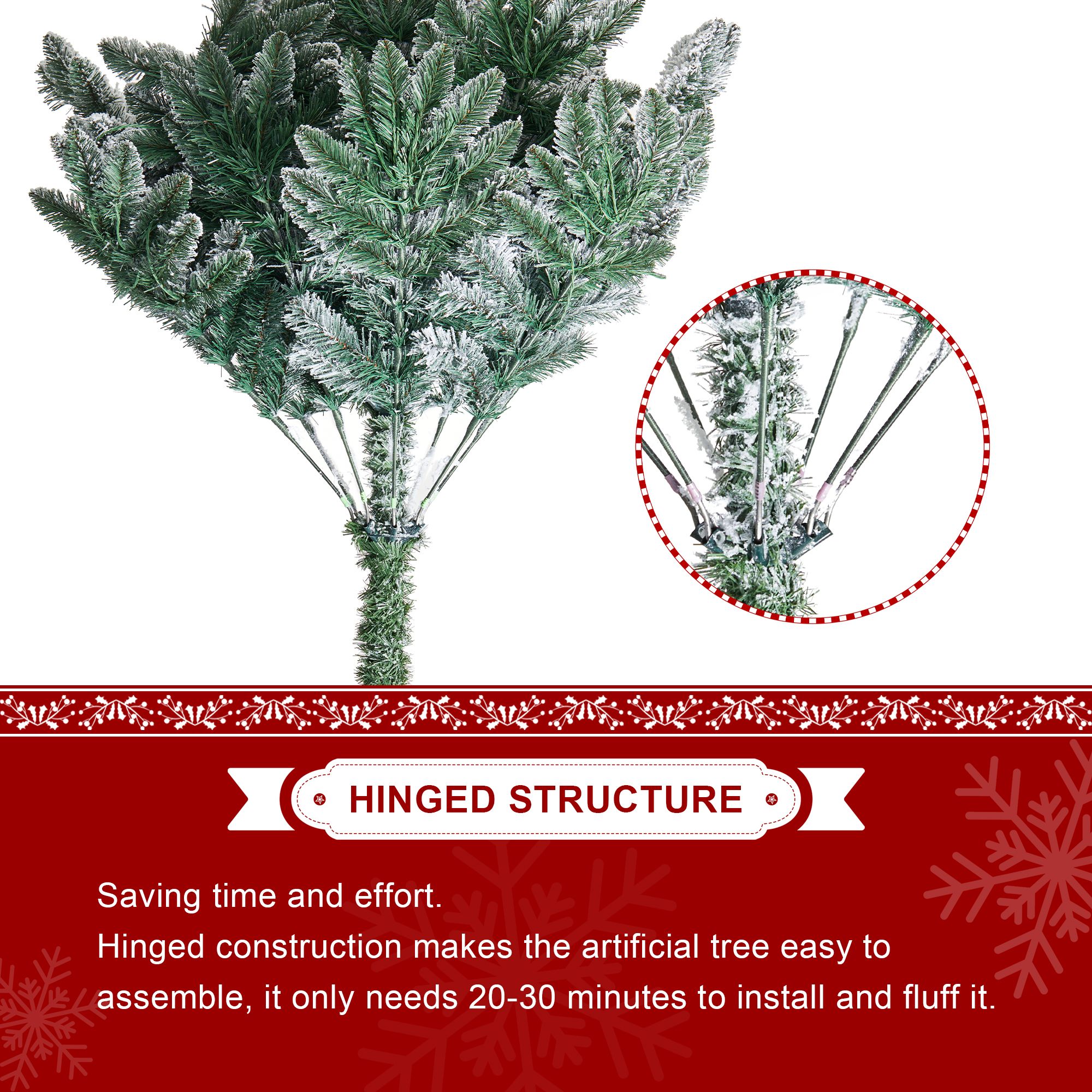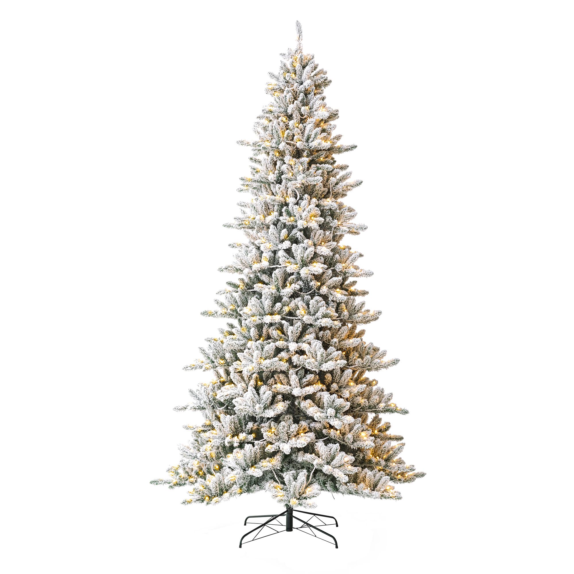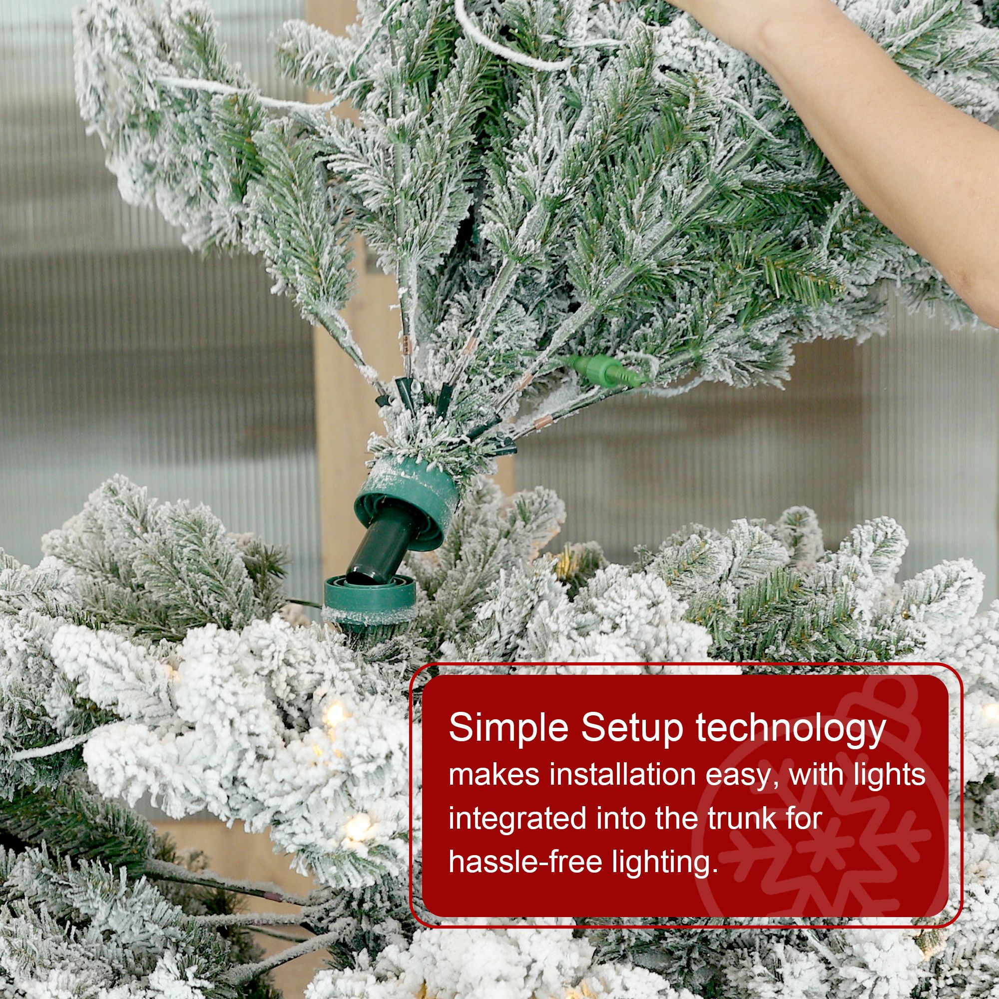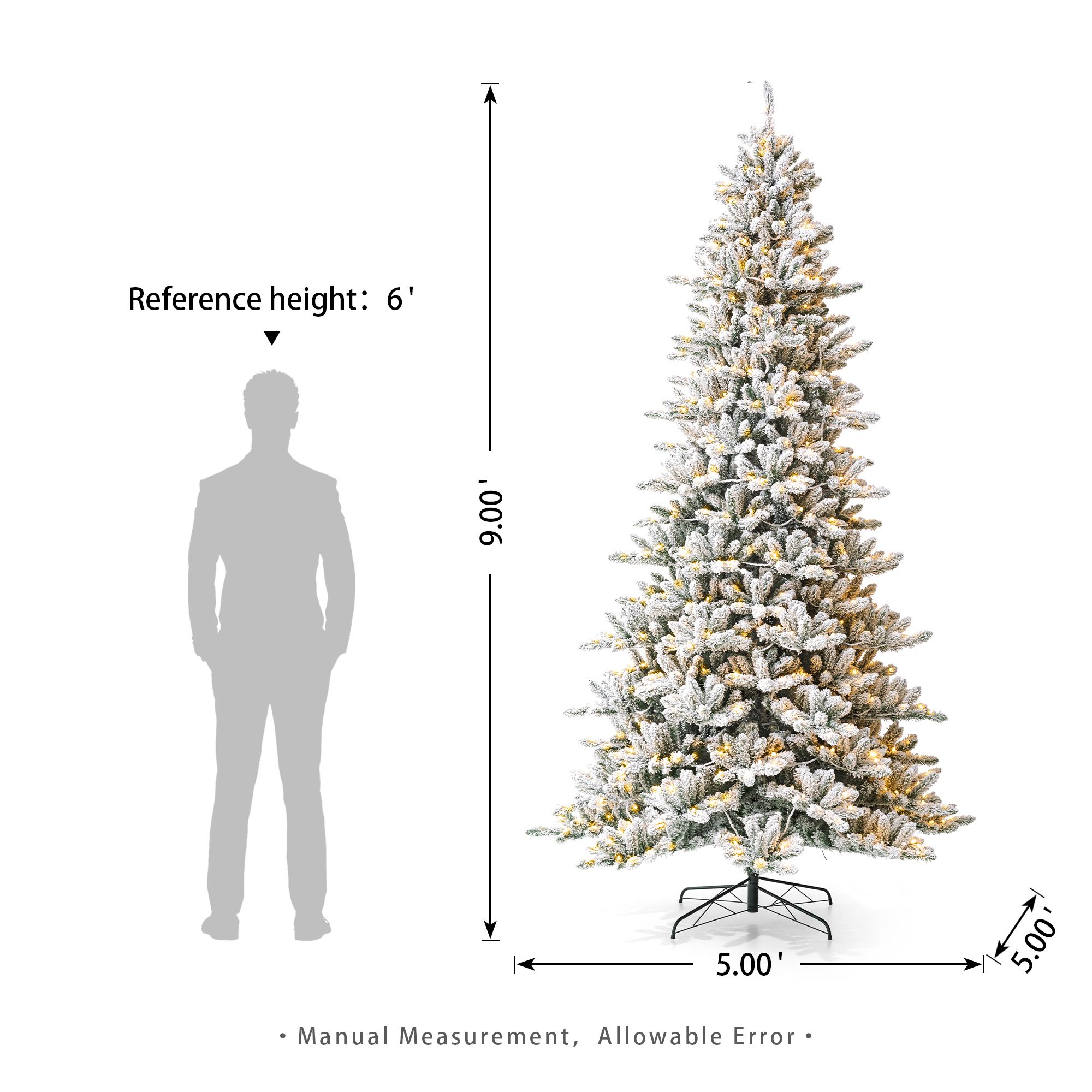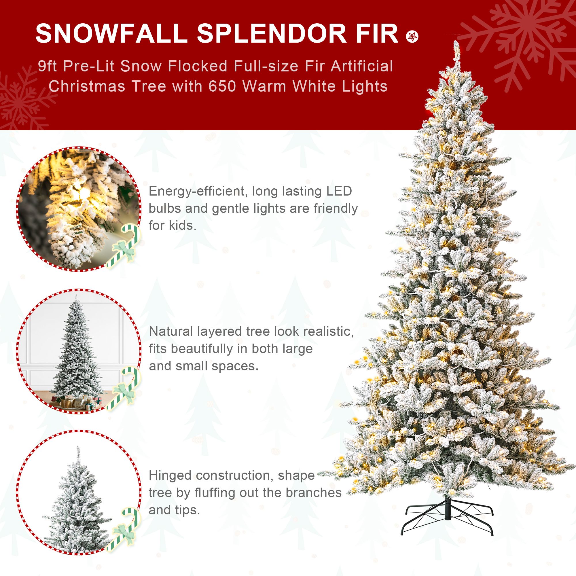 Elevate your holiday decor with this 9ft pre-lit snow flocked fir tree. Featuring 650 warm white LEDs with three lighting modes and 1936 realistic PVC tips, it creates a magical winter atmosphere. The luxurious snow flocking and glitter finish enhance its authentic appearance, while the full 50-inch diameter provides ample ornament space. With quick-assembly hinged construction and a sturdy metal stand, this tree combines beautiful design with practical convenience for unforgettable Christmas celebrations.