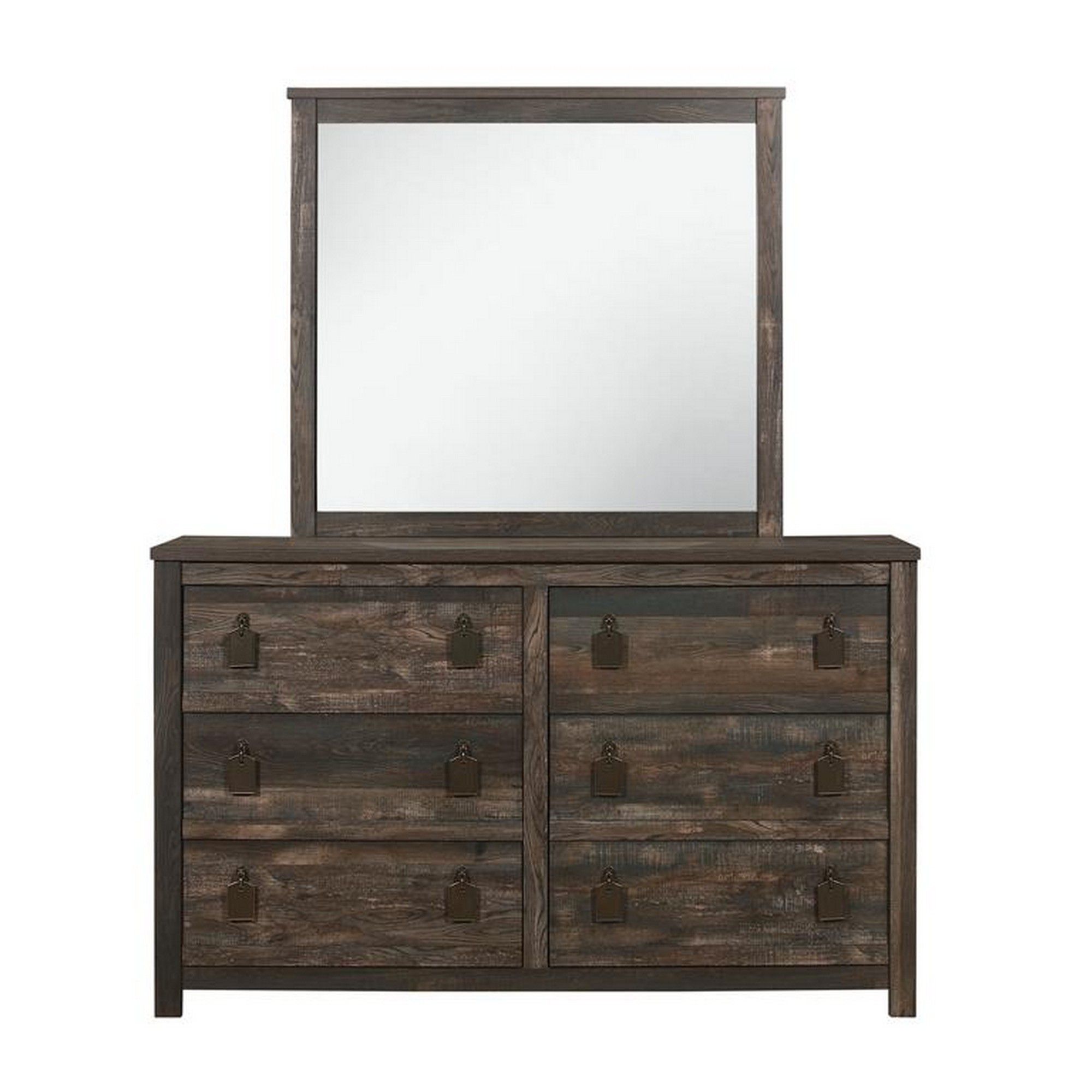 The Farmhouse-Chic look of rustic wood and veneers in an elegant, staggered plank motif creates a warm and casual-country experience. An antique bronze finish on the hardware completes the graceful, homey effect. The set includes a queen bed frame, dresser, mirror, nightstand and chest.