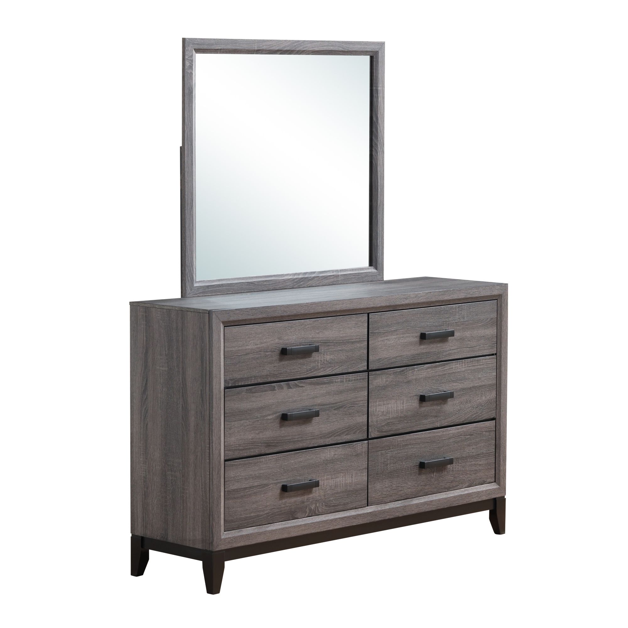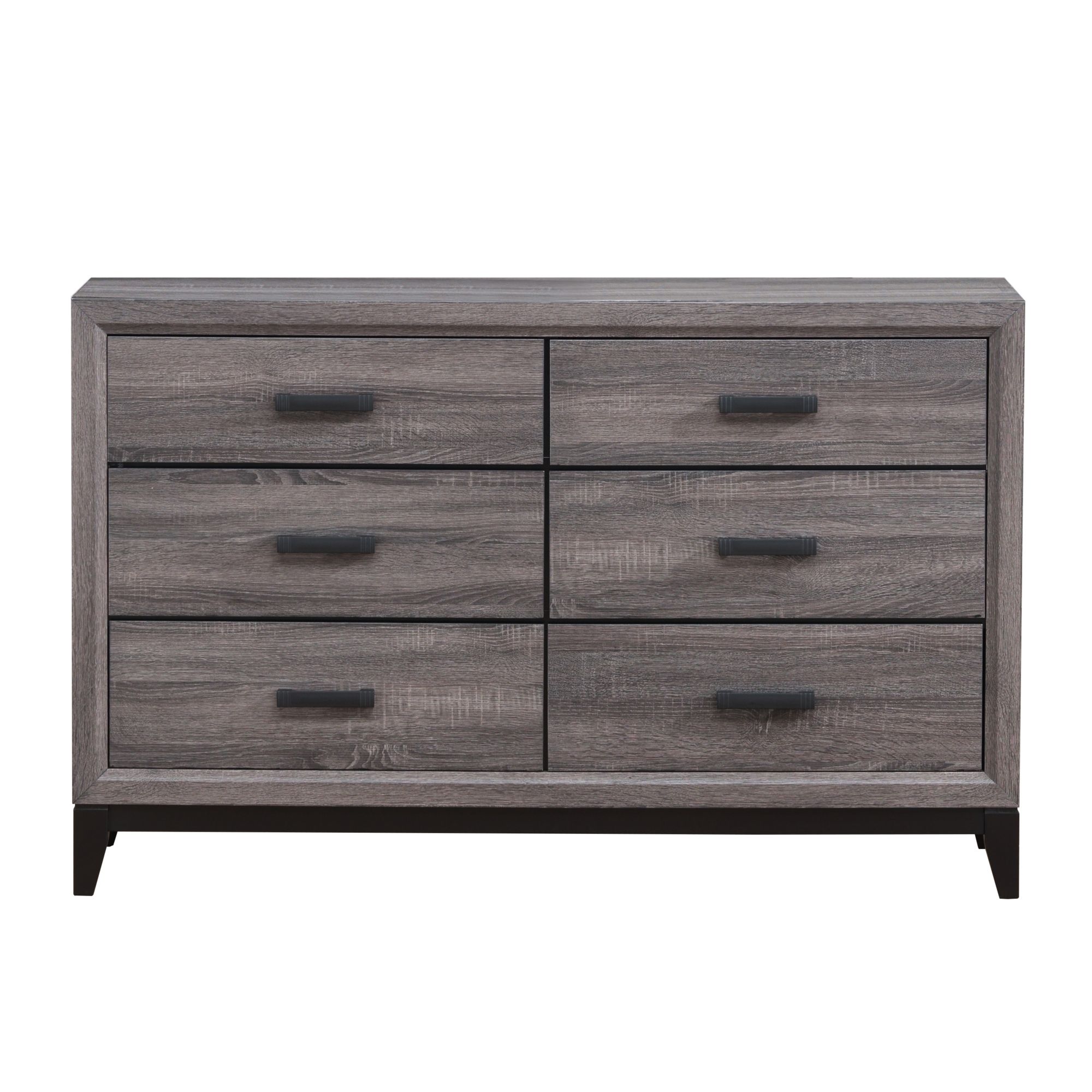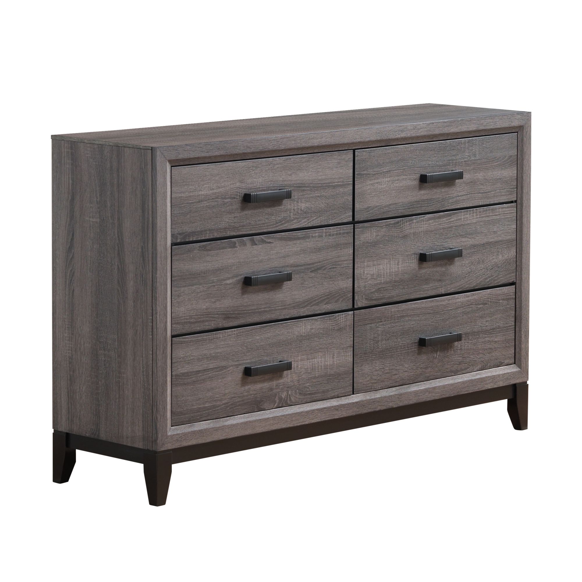 This modern classic set has gray, wood etched-like surface, black trim, and mid-century modern legs. The headboard has plank boards running horizontally with elegant trim around the edges. Altogether the perfect balance you need for a timeless transitional look and, the perfect bedroom set for your modern lifestyle.