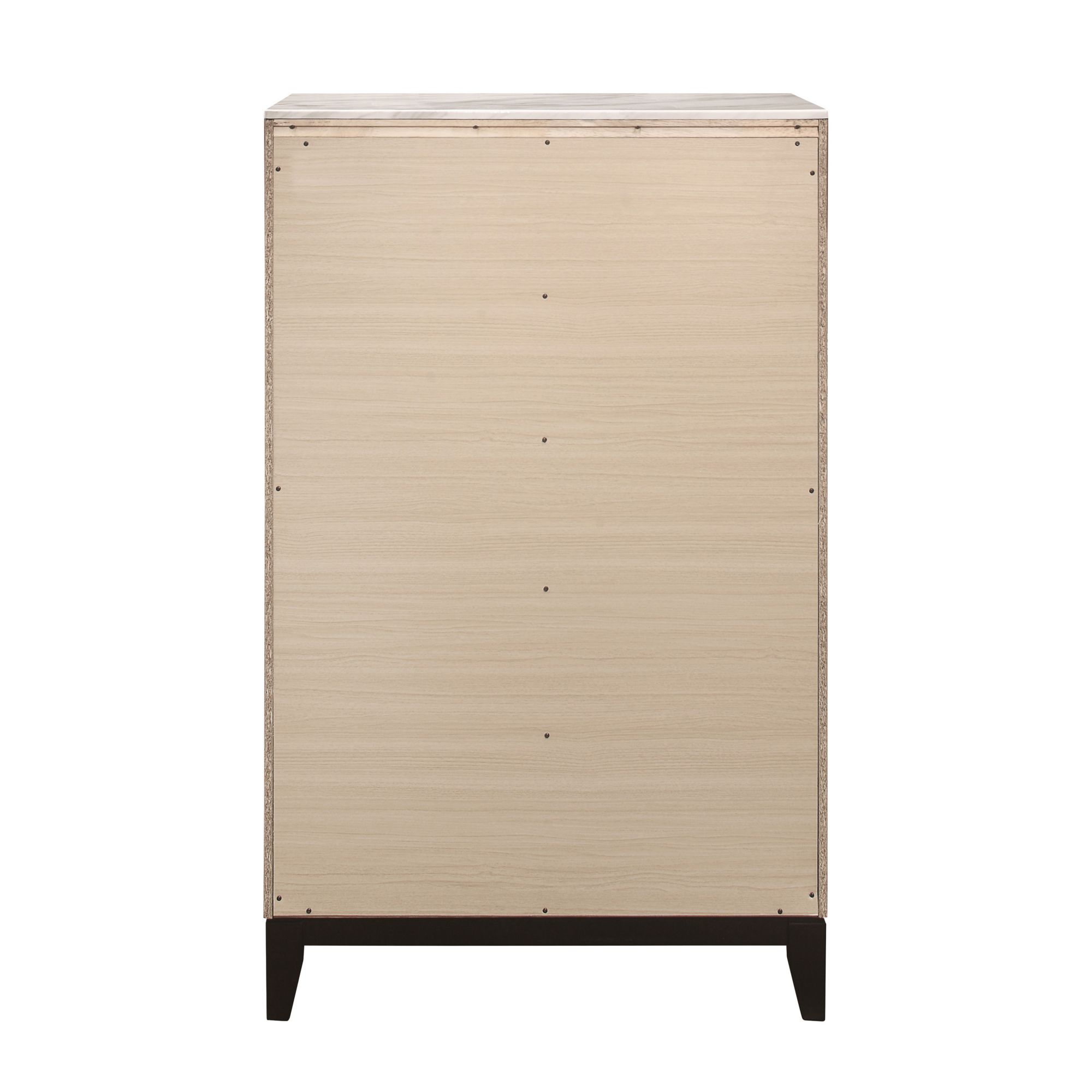 Urban chic meets the realities of modern life with a stylish end-of-bed dresser that makes the most of the space you have. The striking, two-tone finish lends drama to the on-trend, cerused finish. The comfortable, upholstered headboard counterpoints the dressy, faux-marble tops.